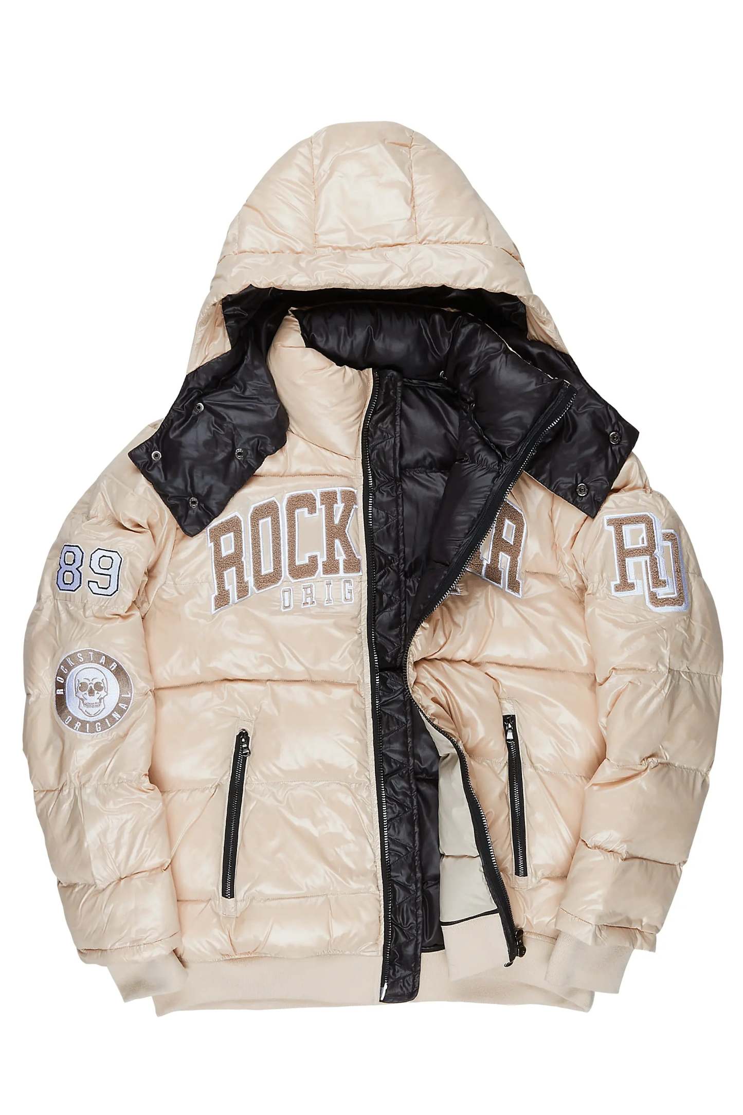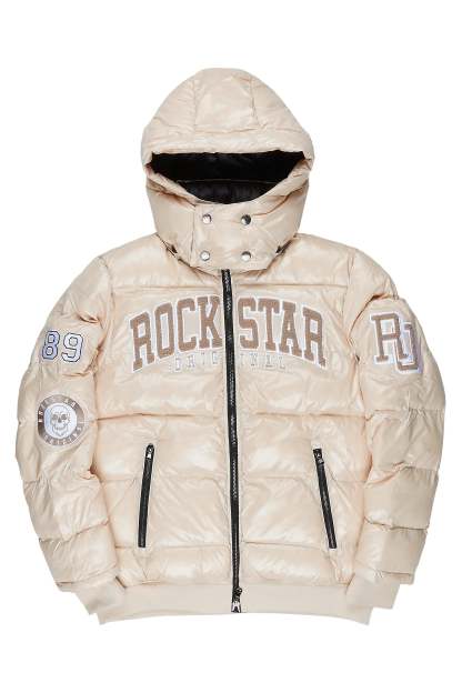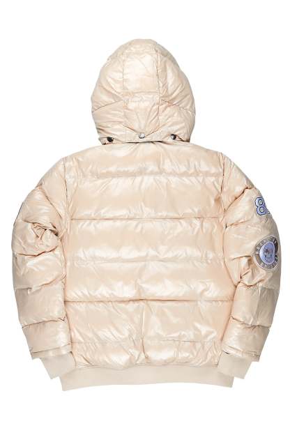 An urban quilted puffer jacket for men in beige. Designed with water-resistant fabric for optimal warmth.