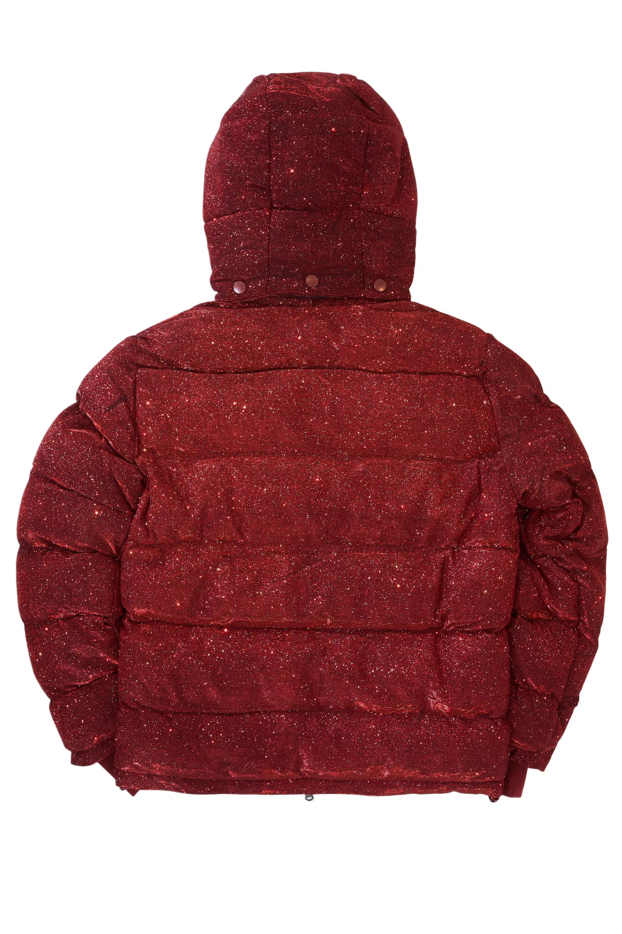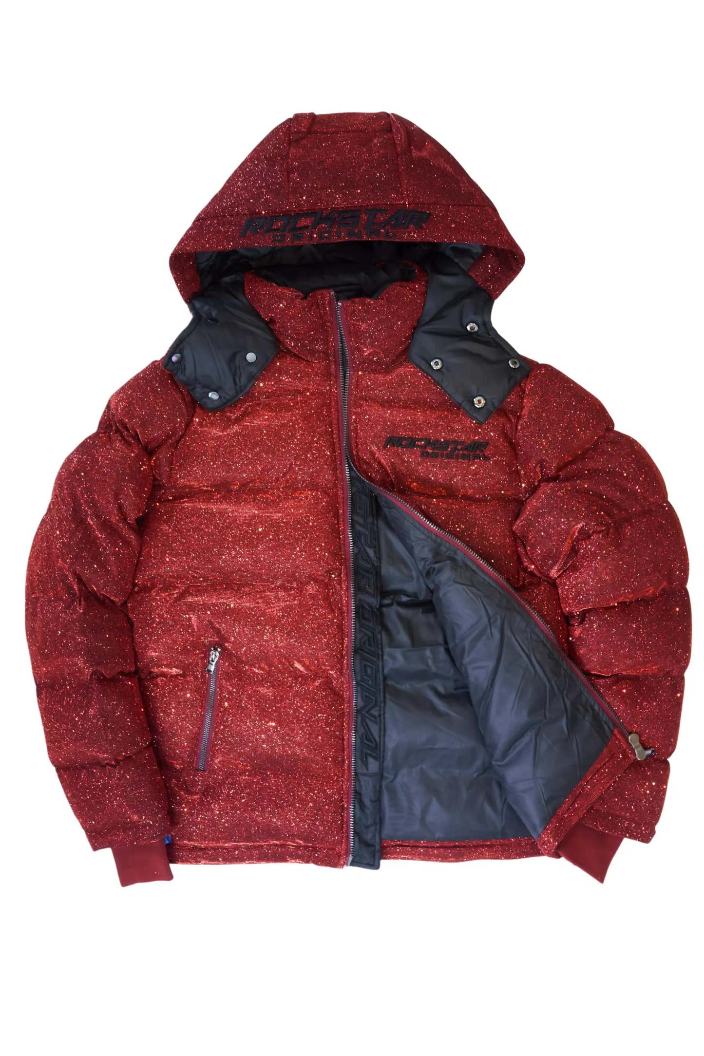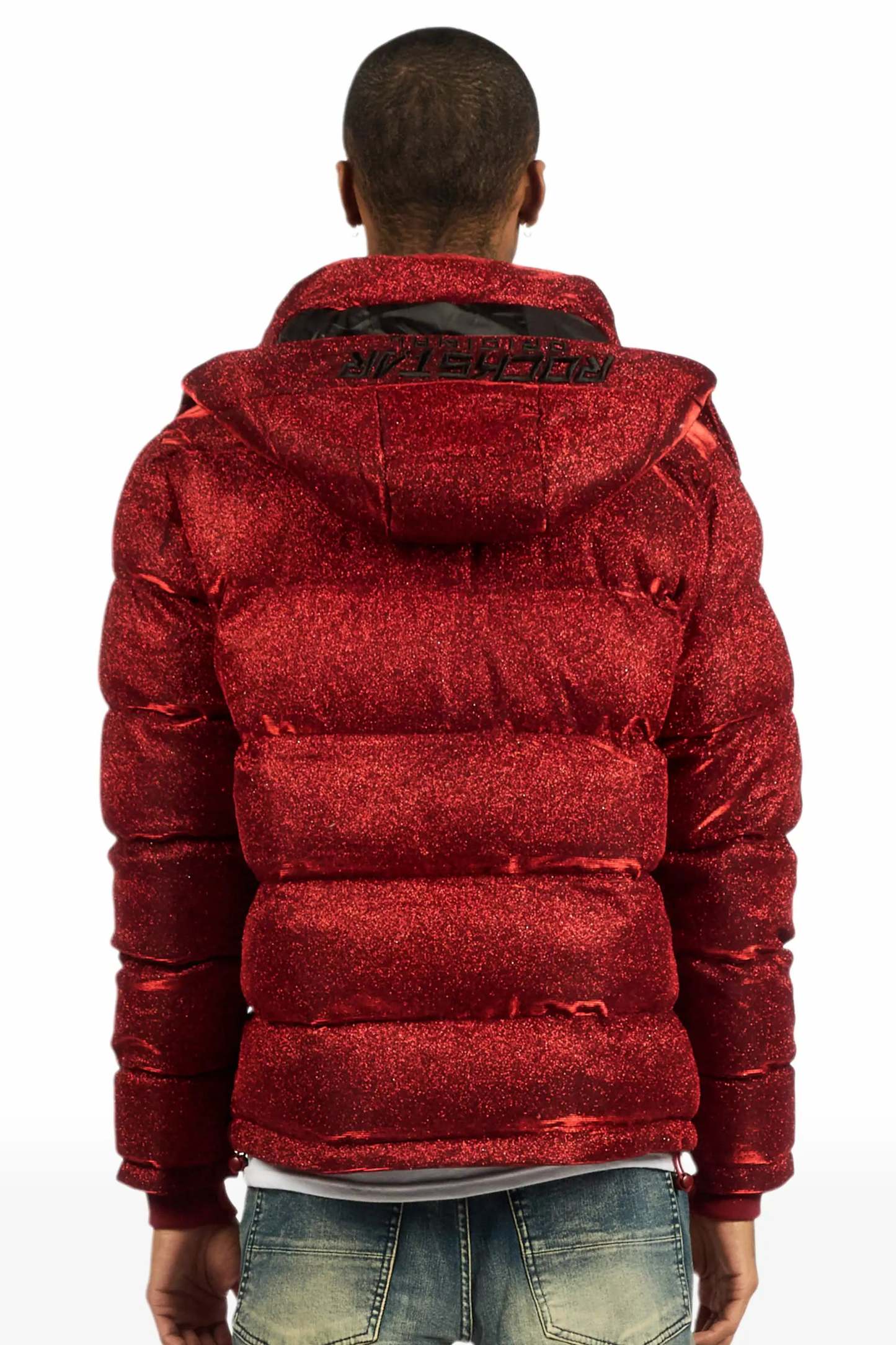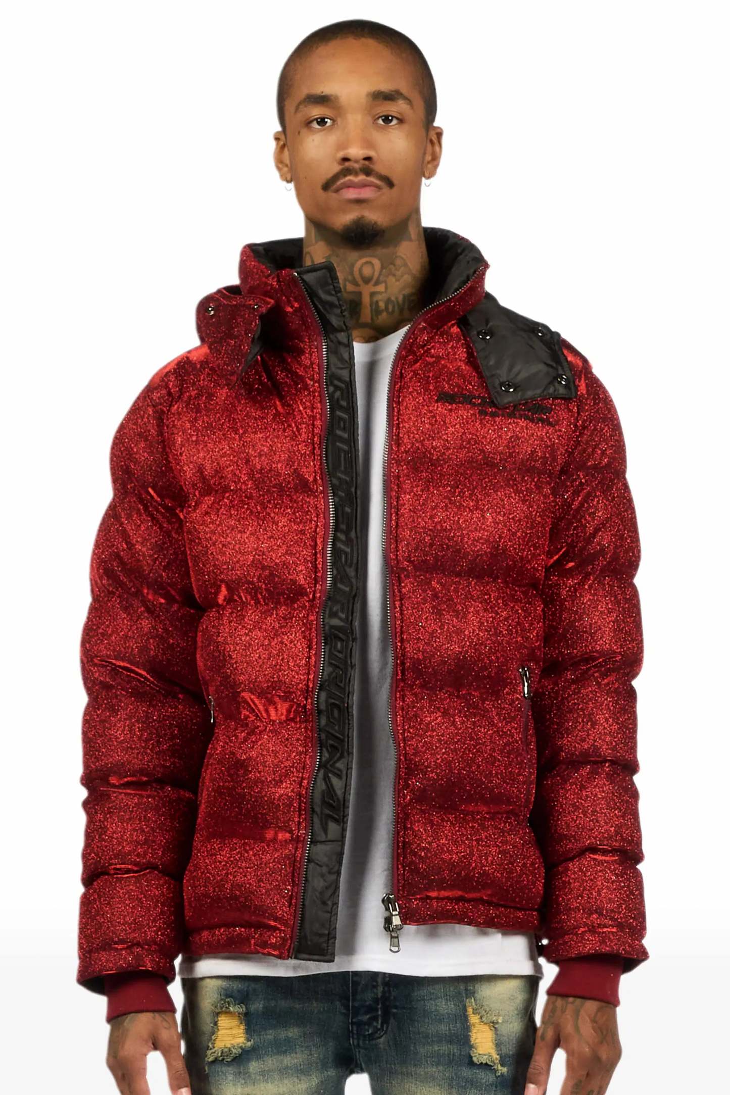 An urban red quilted puffer jacket for men. Designed with custom glitter fabric for a perfect streetwear statement piece.
