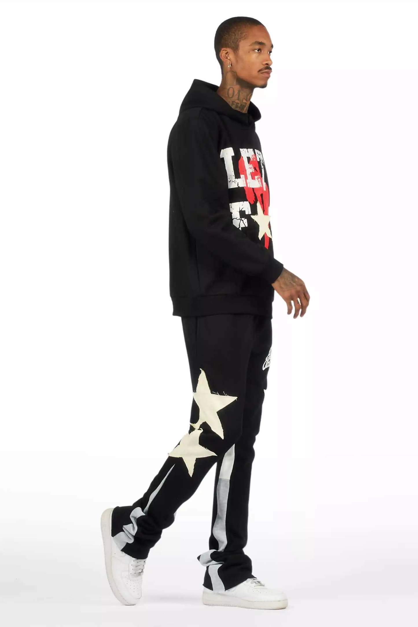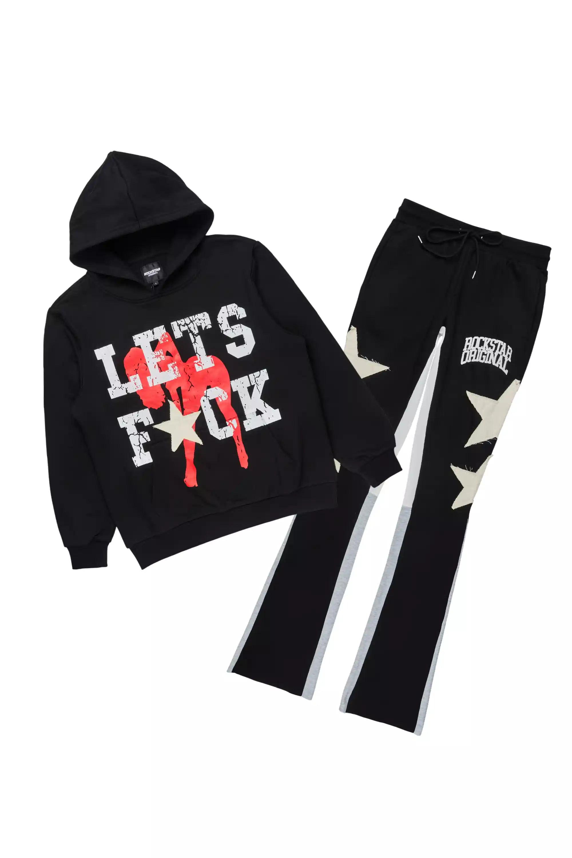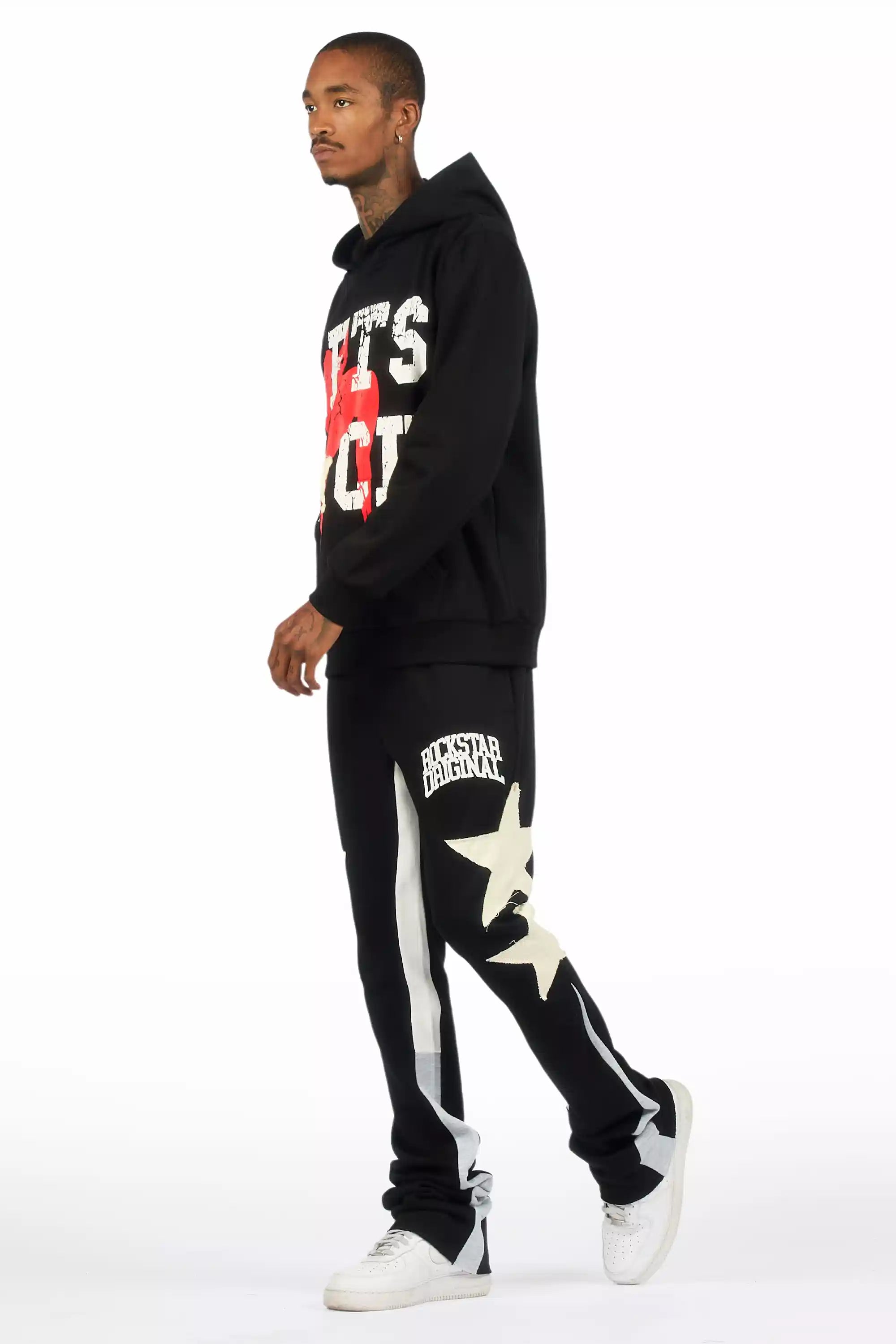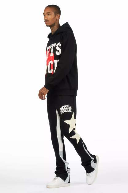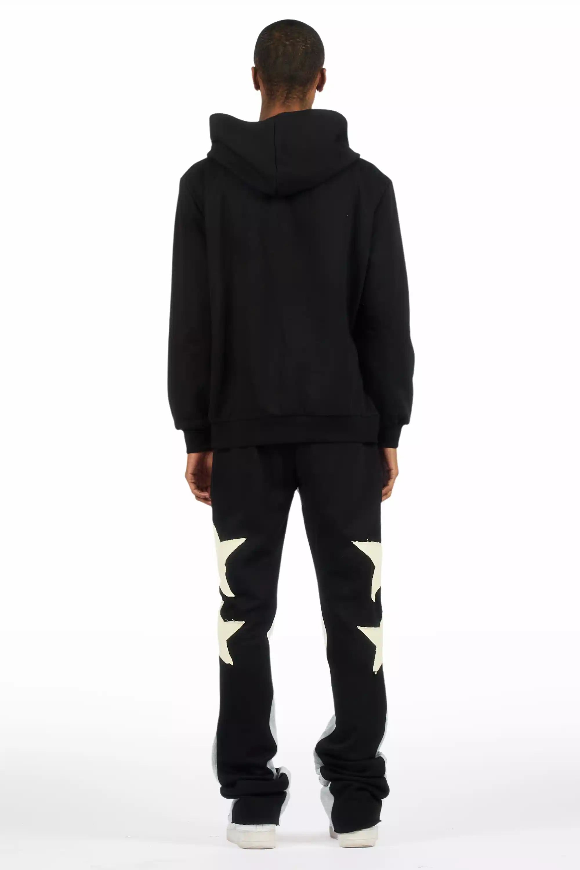 An urban two-piece hoodie and stack track pant set for men in black. Designed with extra long legs and custom detailing for a must-cop streetwear essential.