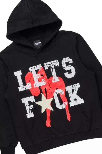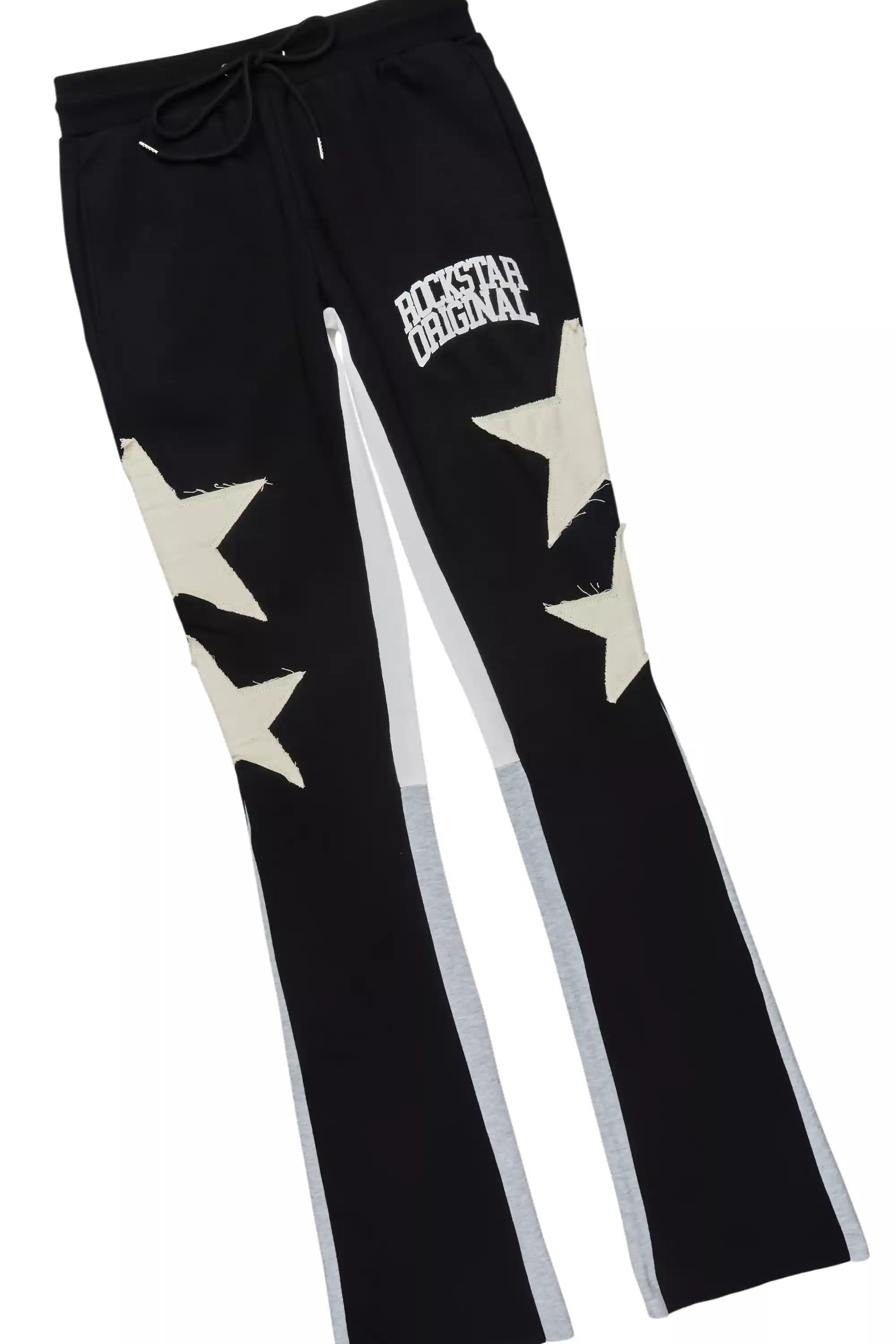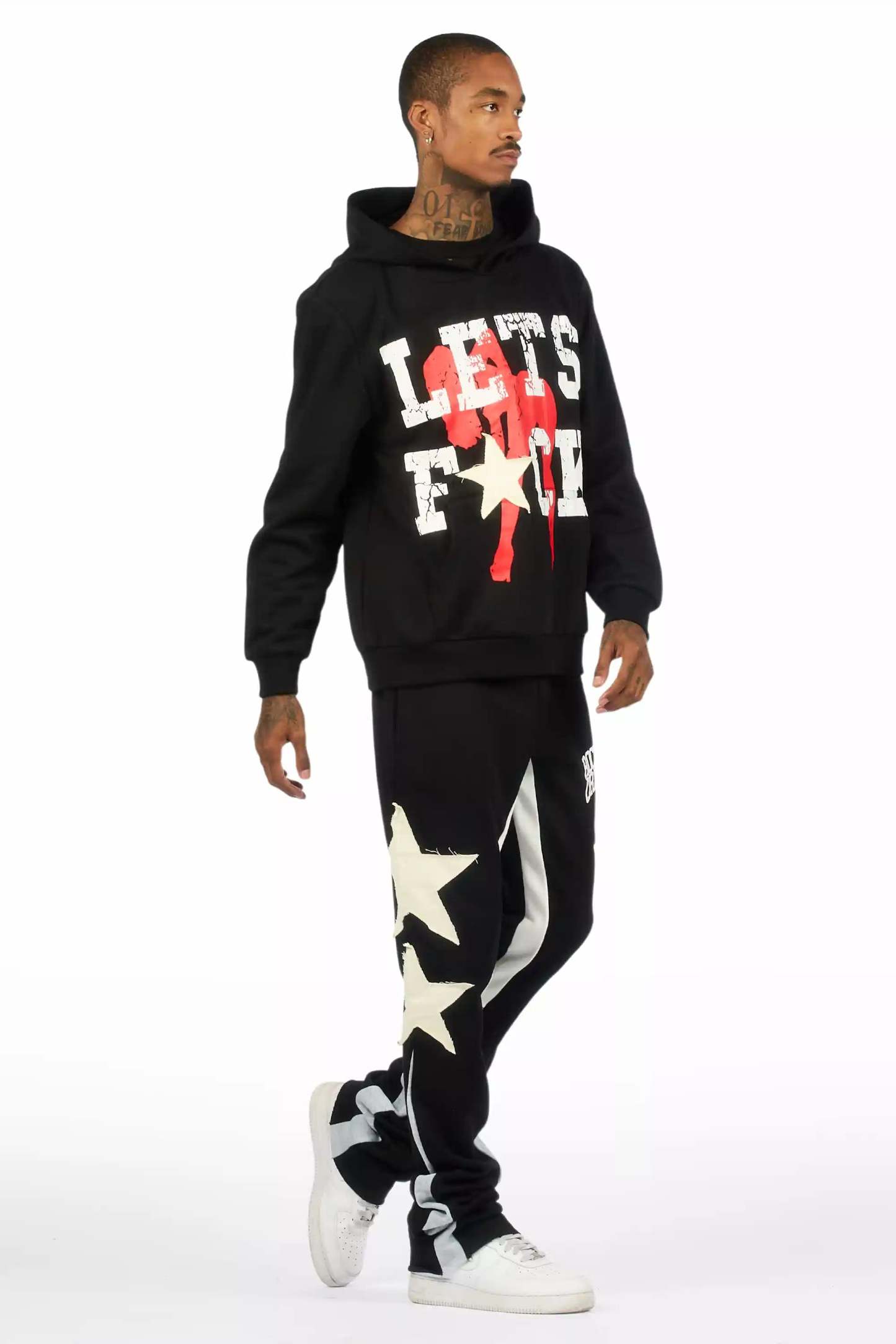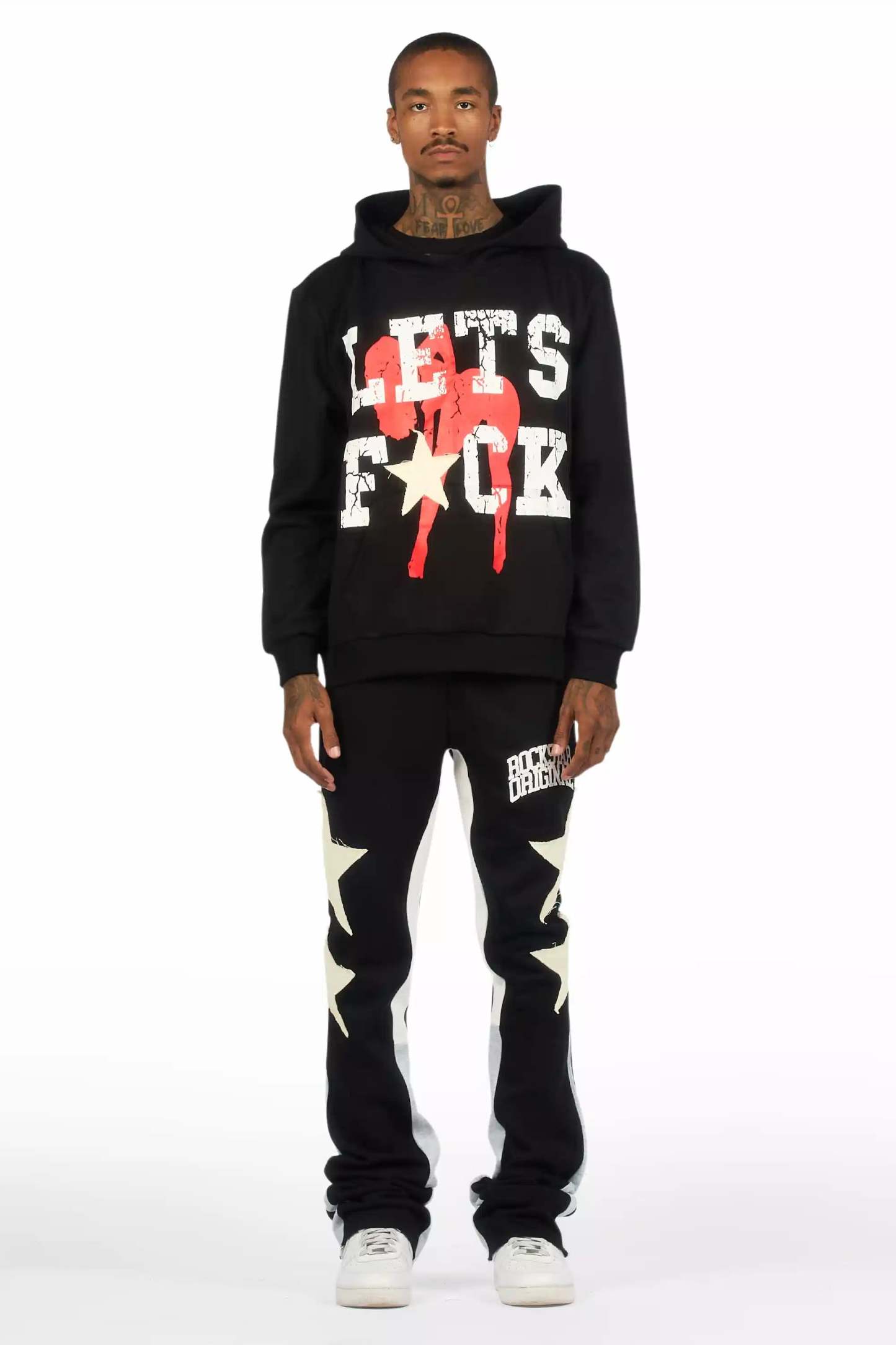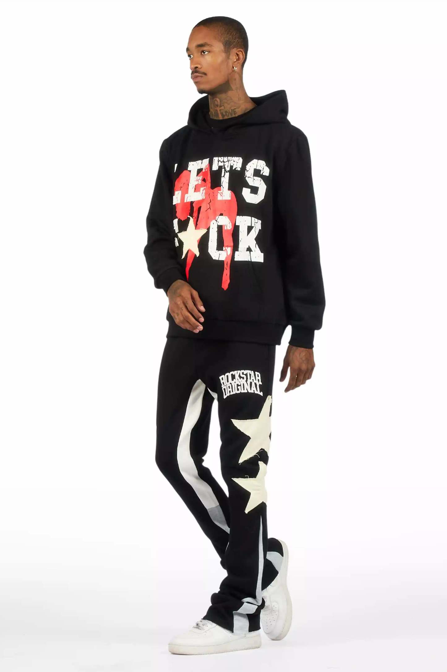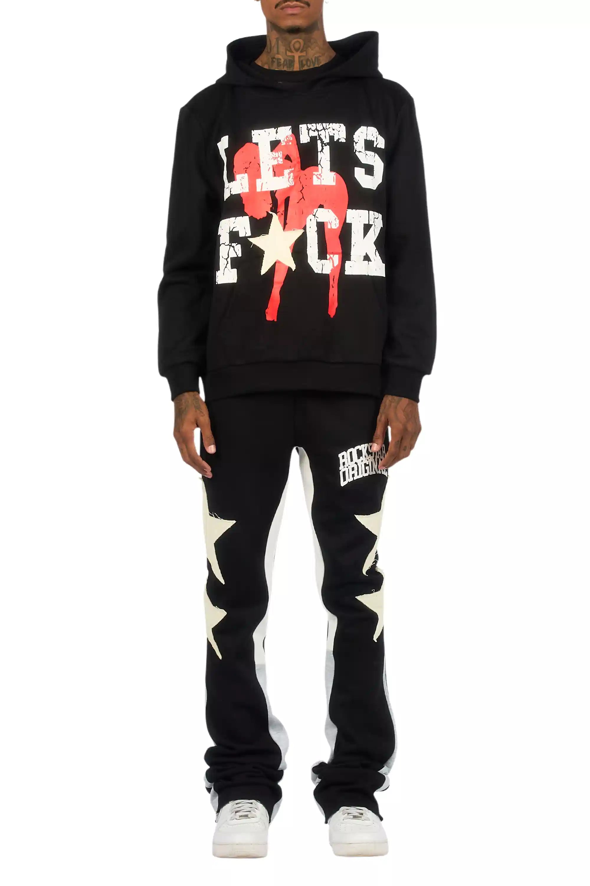 An urban two-piece hoodie and stack track pant set for men in black. Designed with extra long legs and custom detailing for a must-cop streetwear essential.