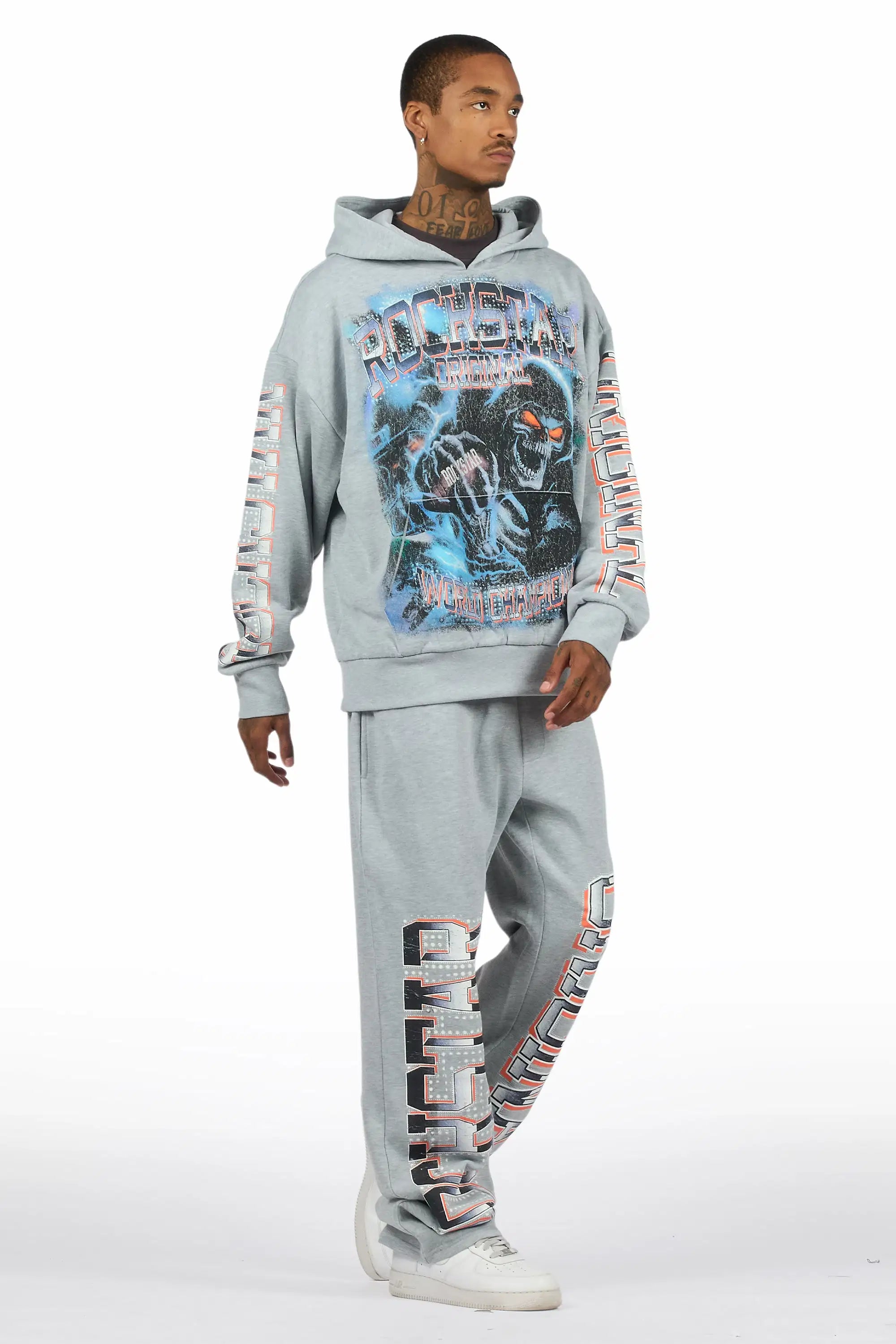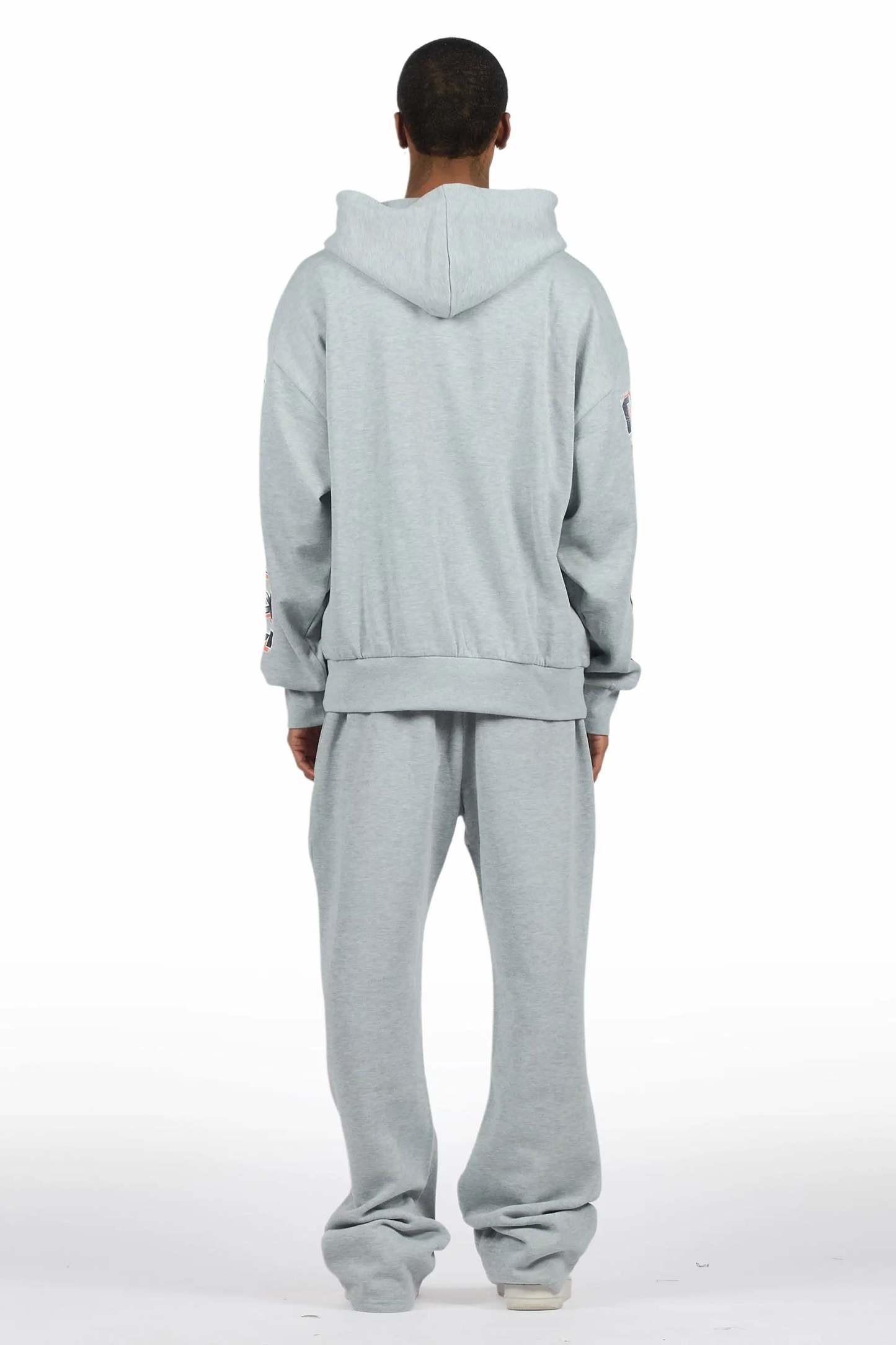 An urban two-piece hoodie and baggy pant set for men in heather grey. Designed with organic cotton and custom detailing for a dope streetwear track set.