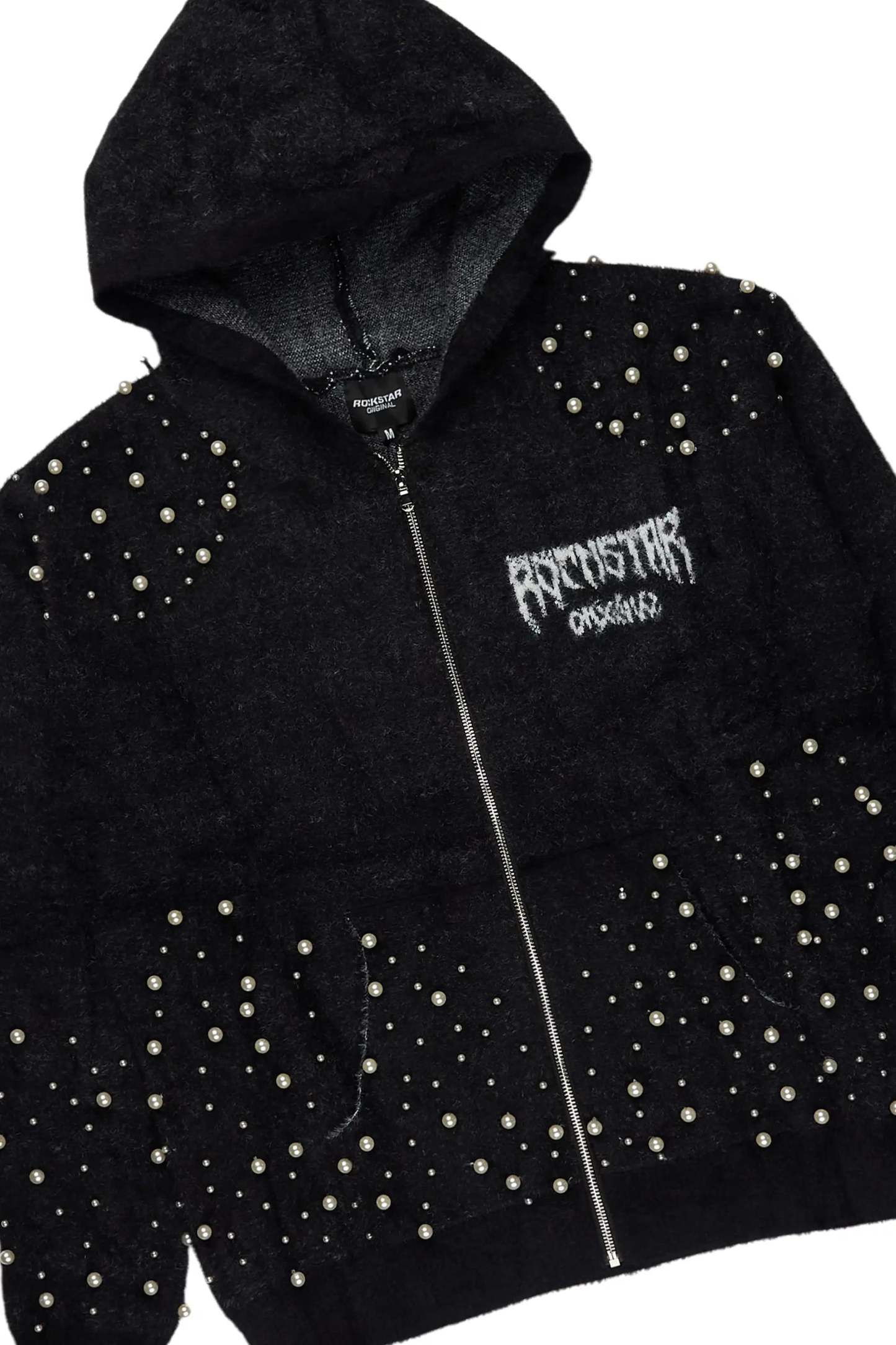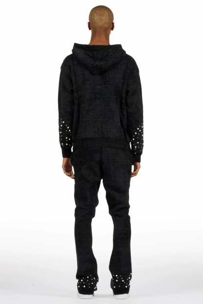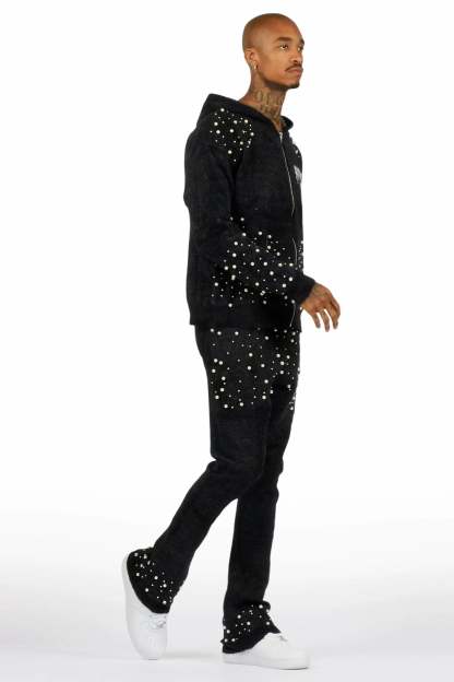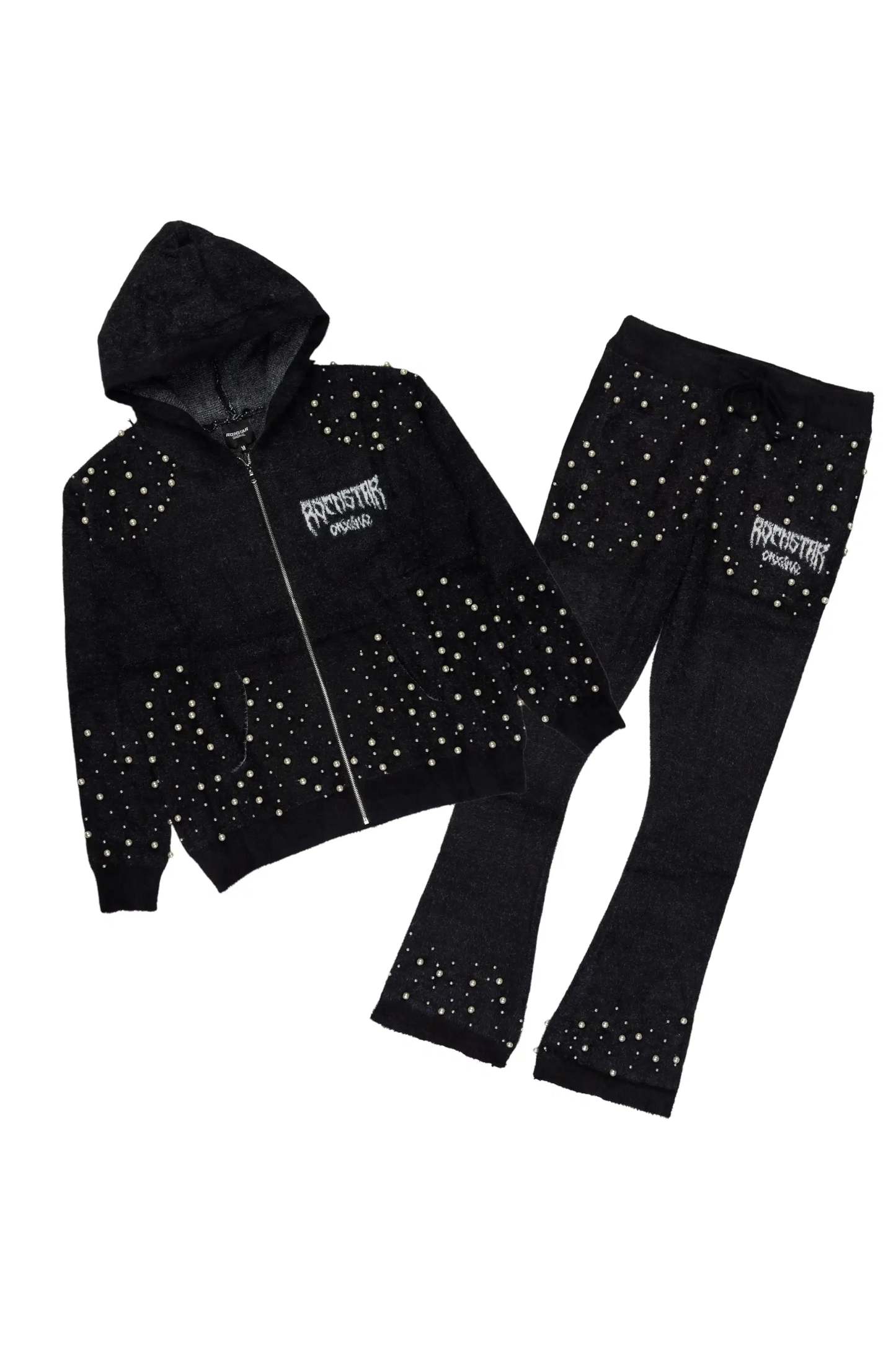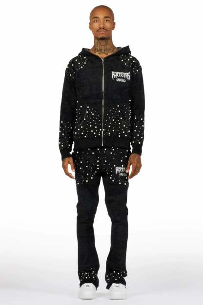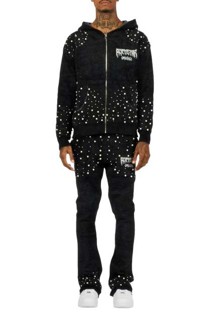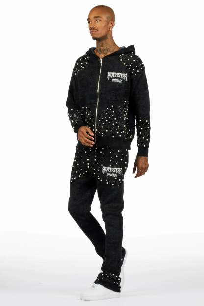 An urban two-piece zip up jacket and sweat pant set for men in black. Designed with super soft organic cotton and custom detailing for a must-cop basic streetwear essential.