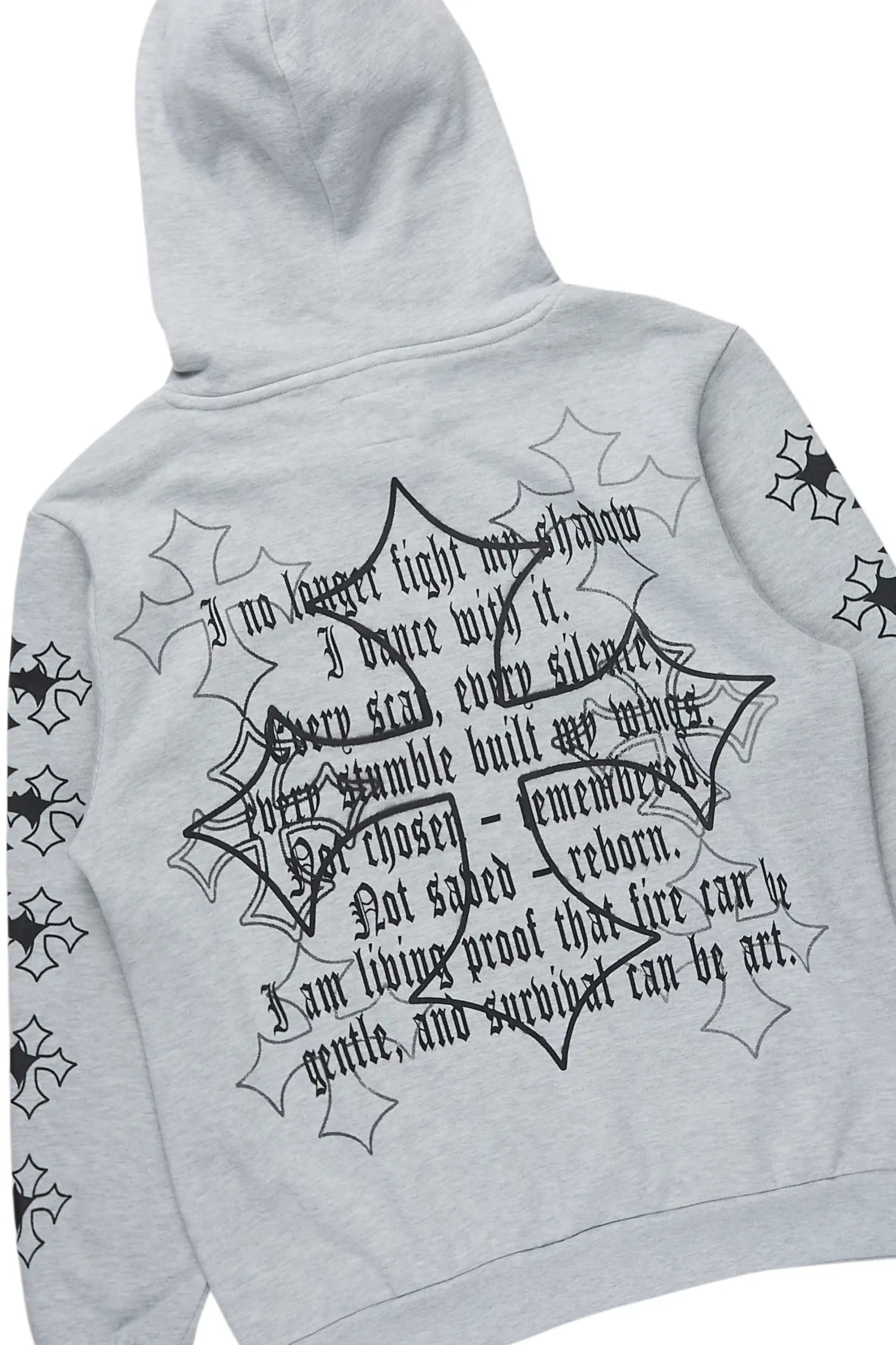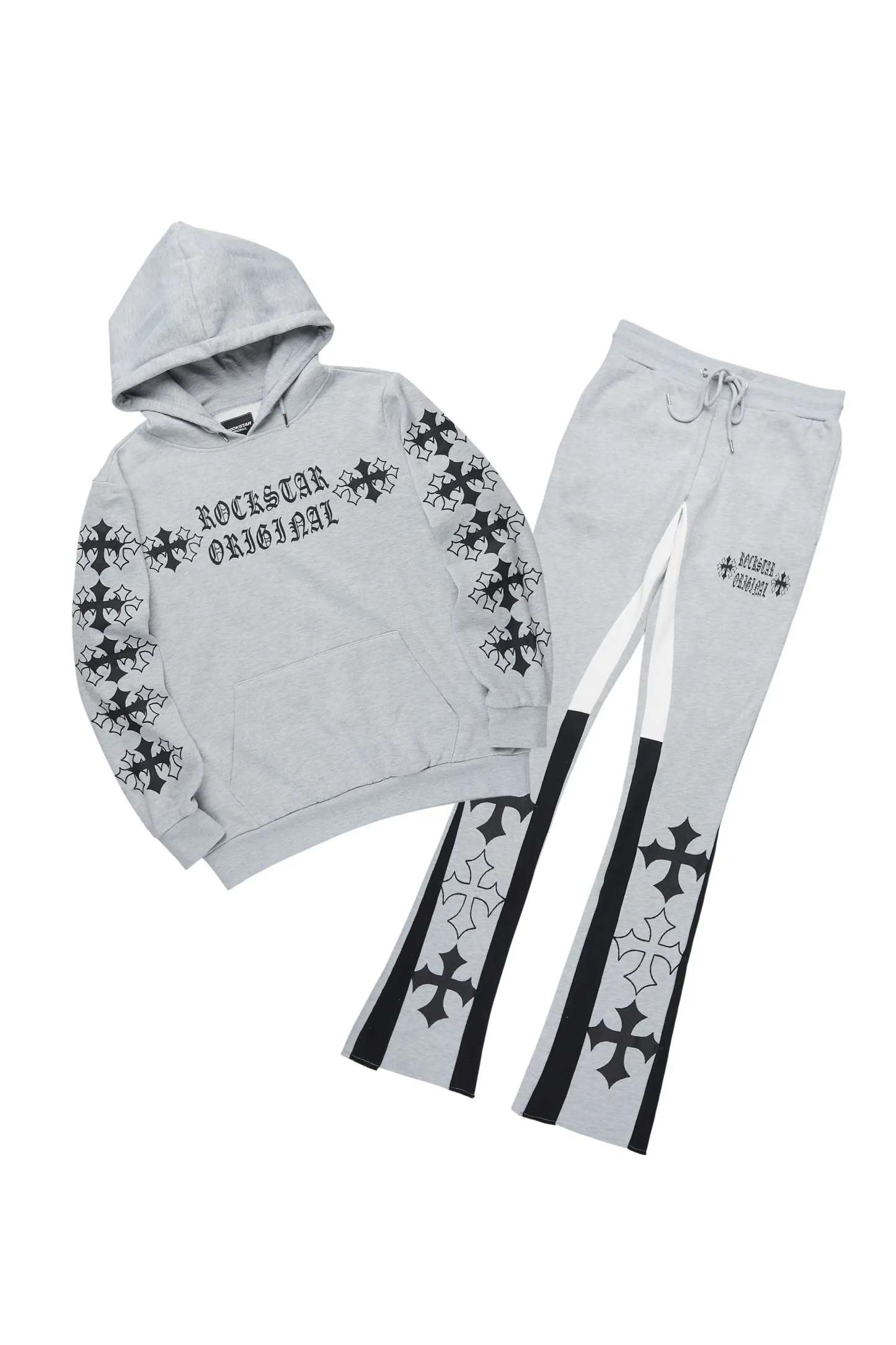 An urban two-piece hoodie and stack track pant set for men in heather grey. Designed with extra long legs and custom detailing for a must-cop streetwear essential.