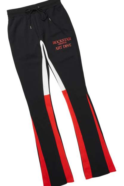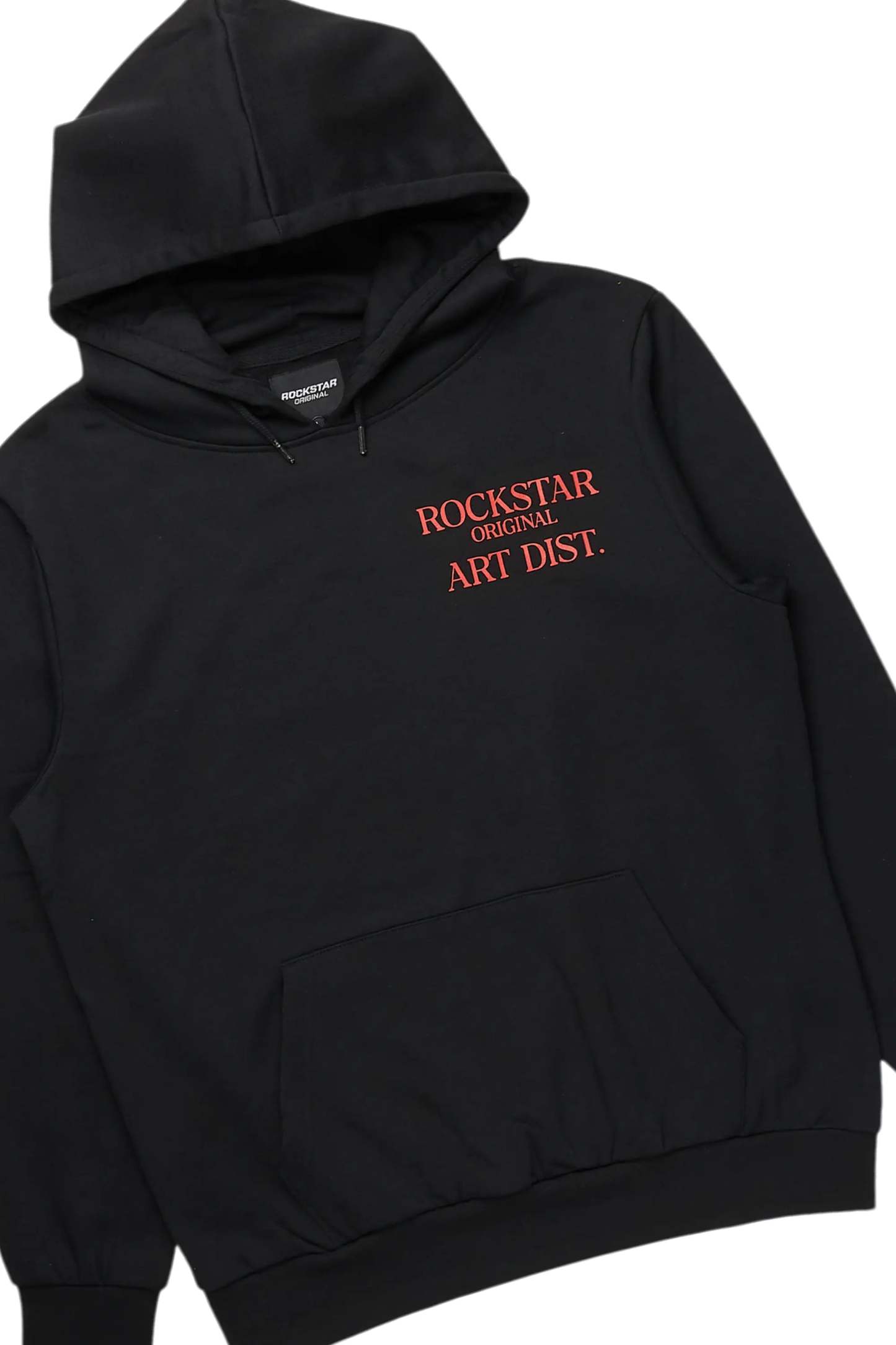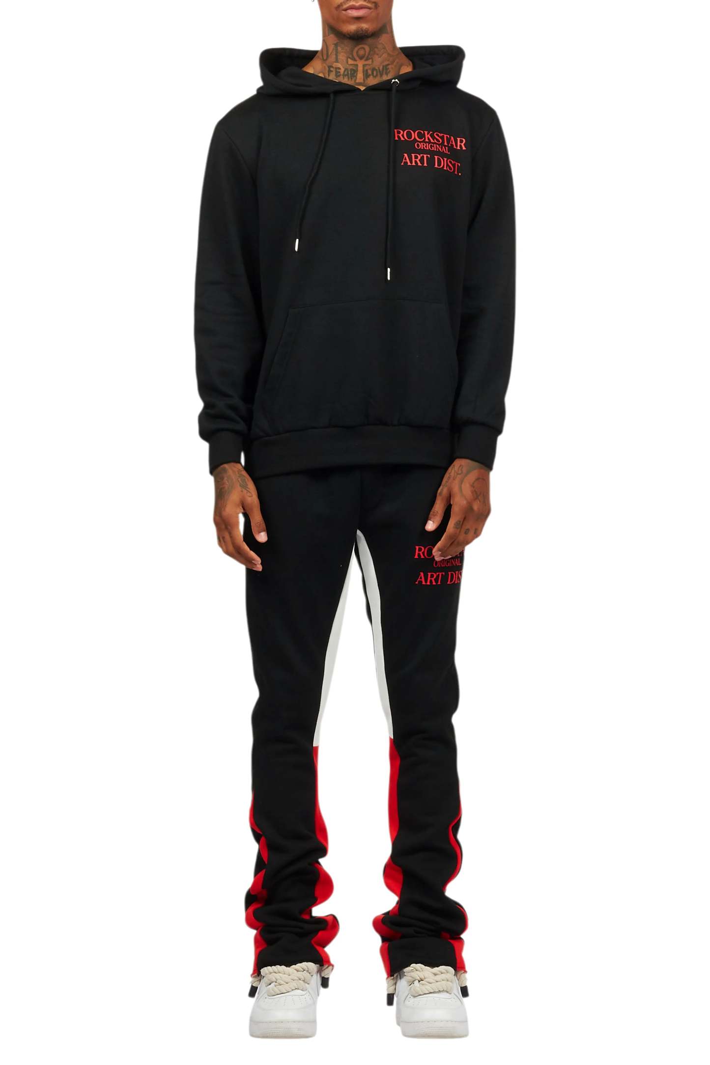 An urban two-piece hoodie and stack track pant set for men in black. Designed with extra long legs and custom detailing for a must-cop streetwear essential.