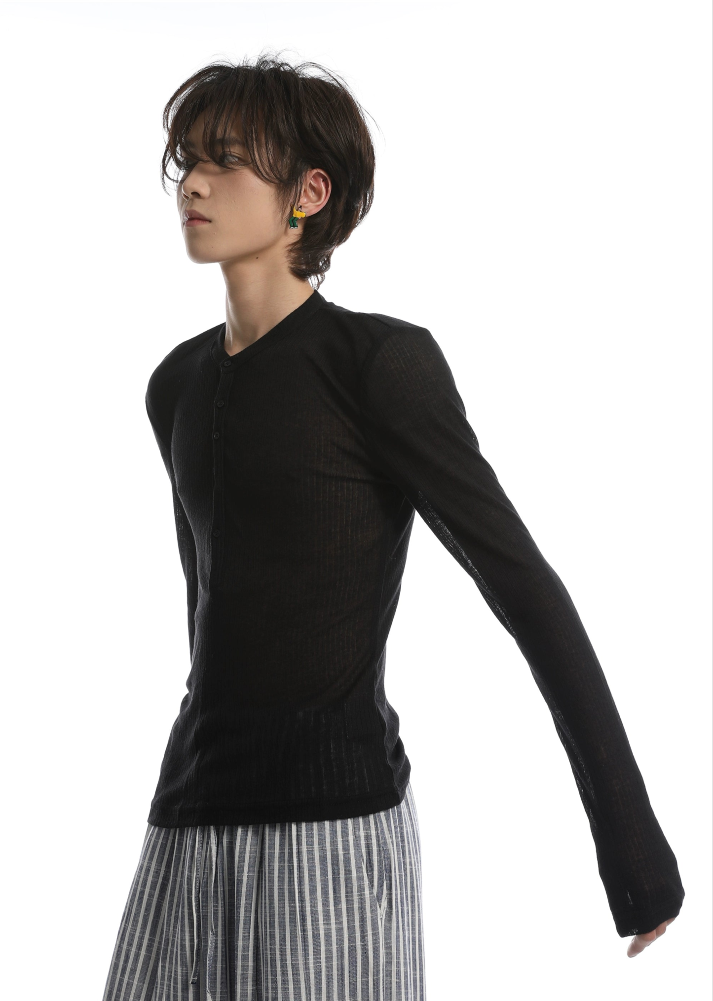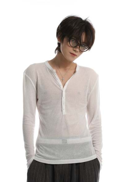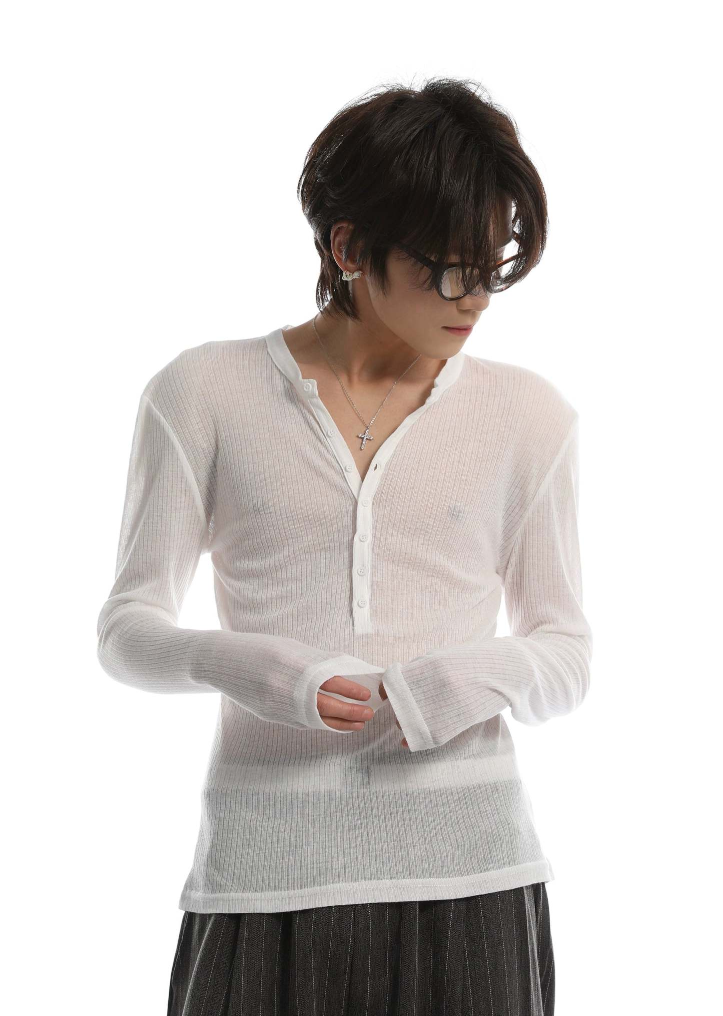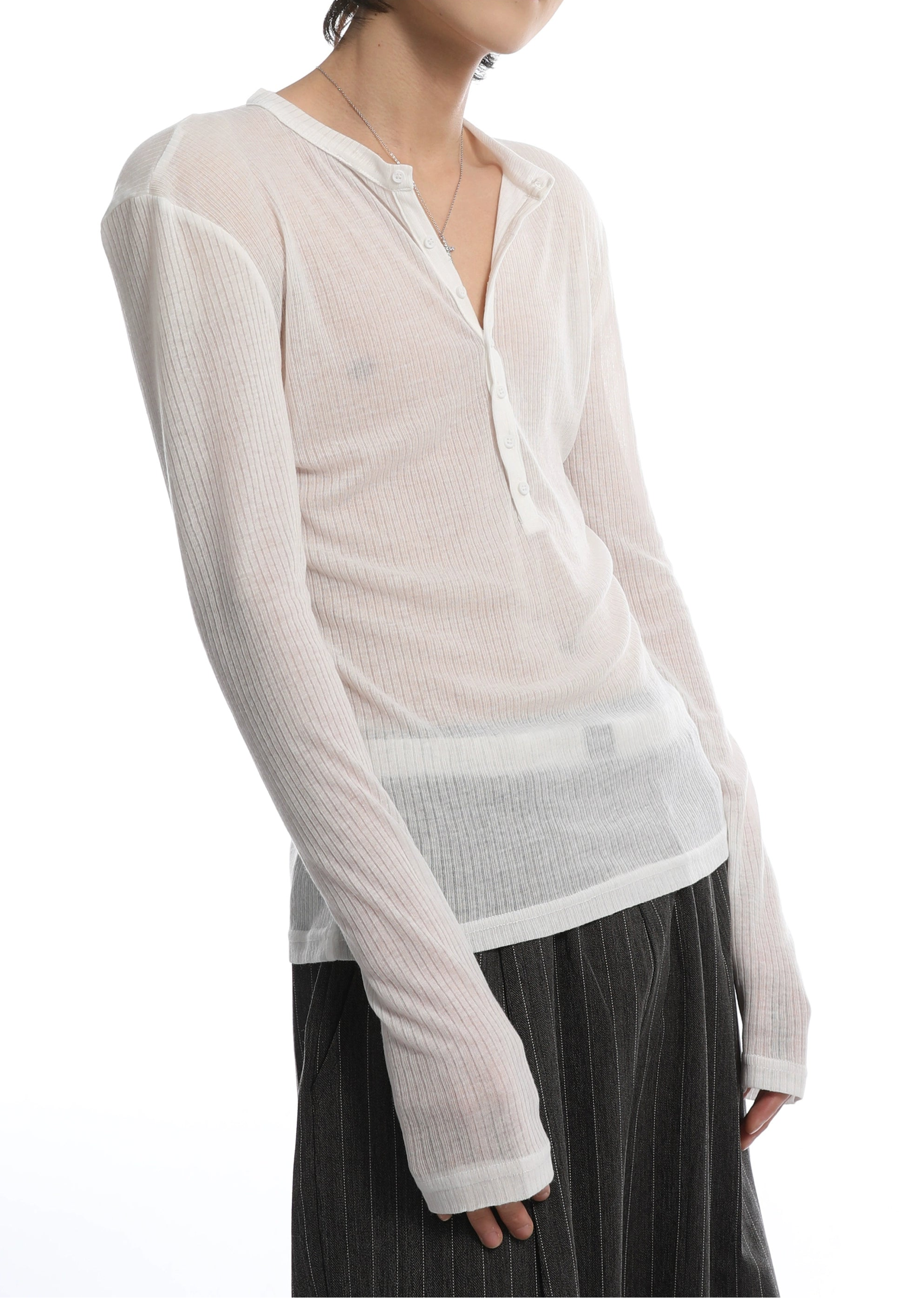 A sheer ribbed knit brings a textured, laid-back edge to this long sleeve Henley shirt — made for easy layering and catching light without trying too hard.
