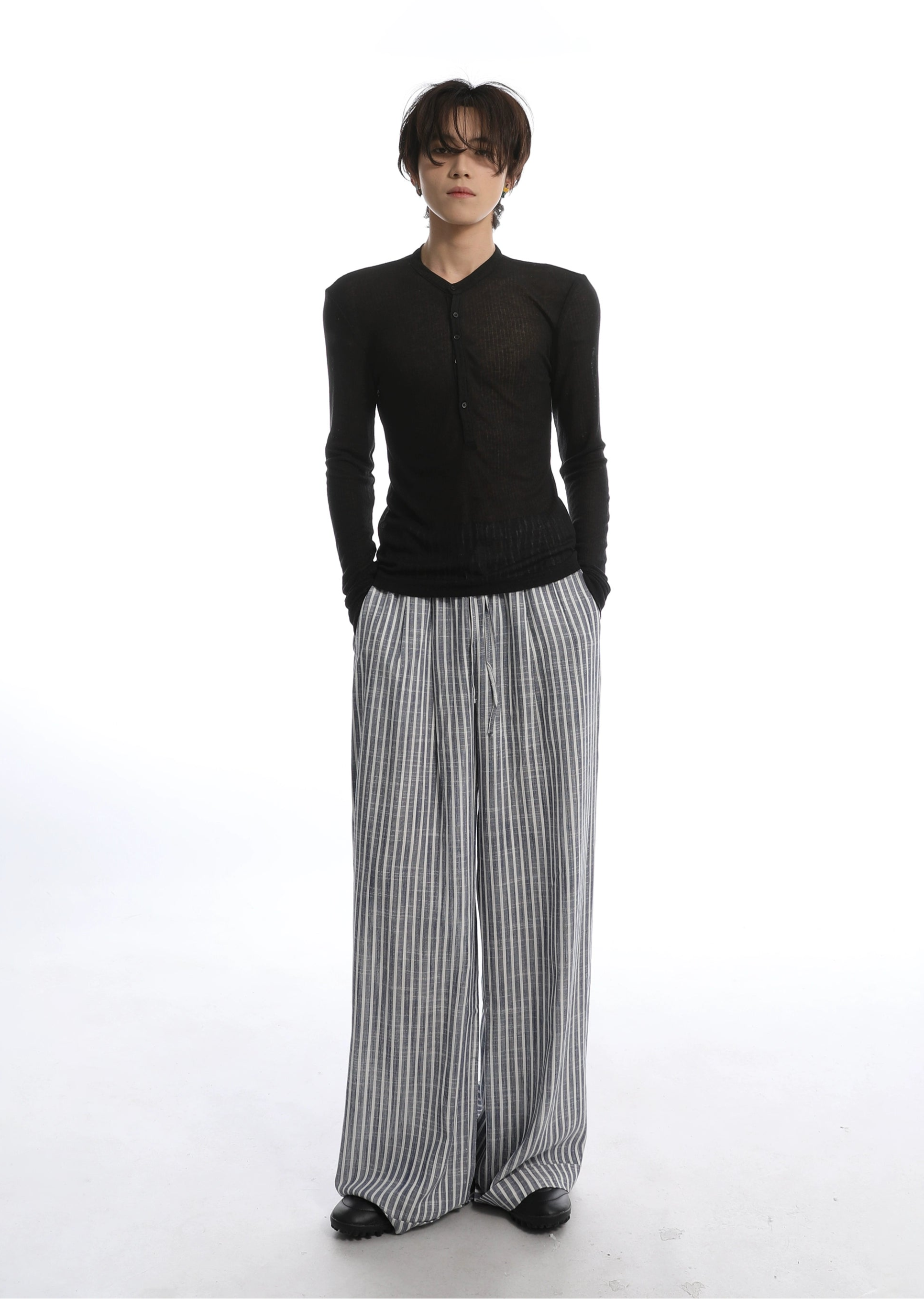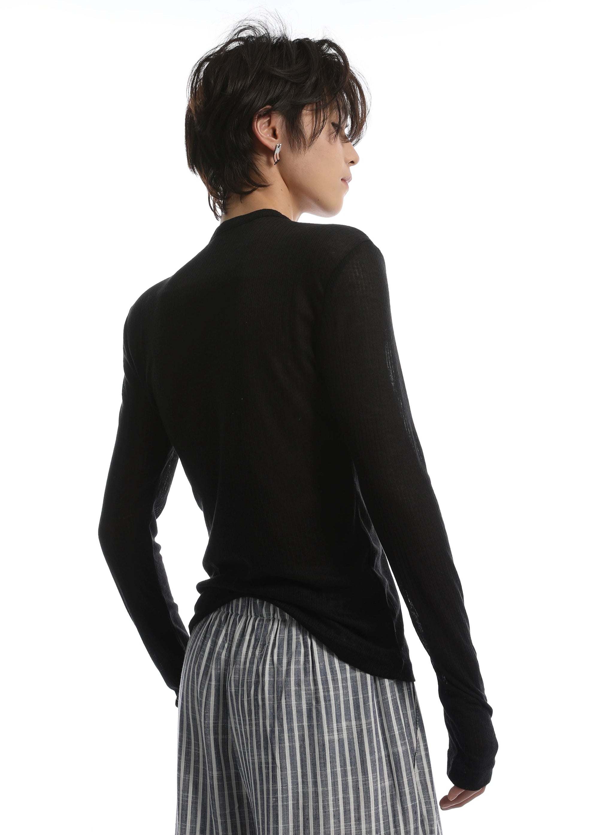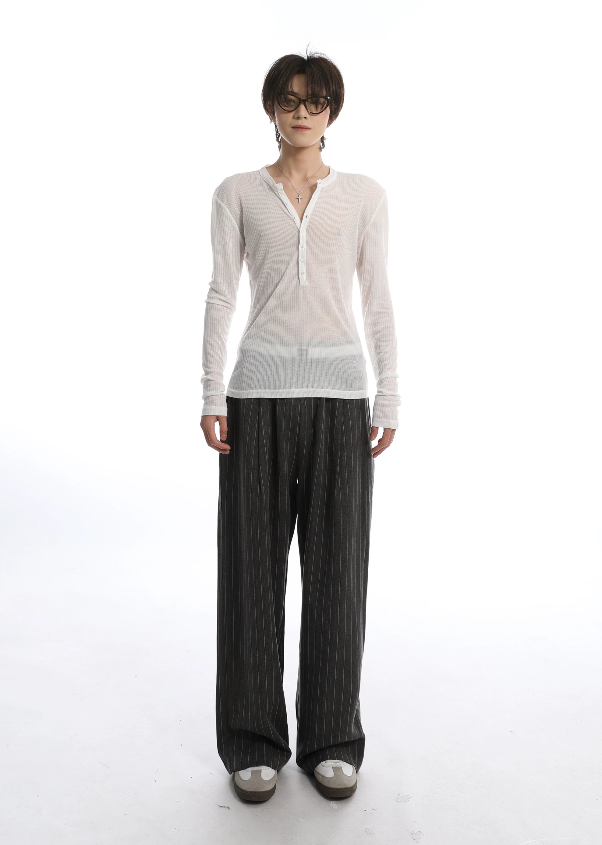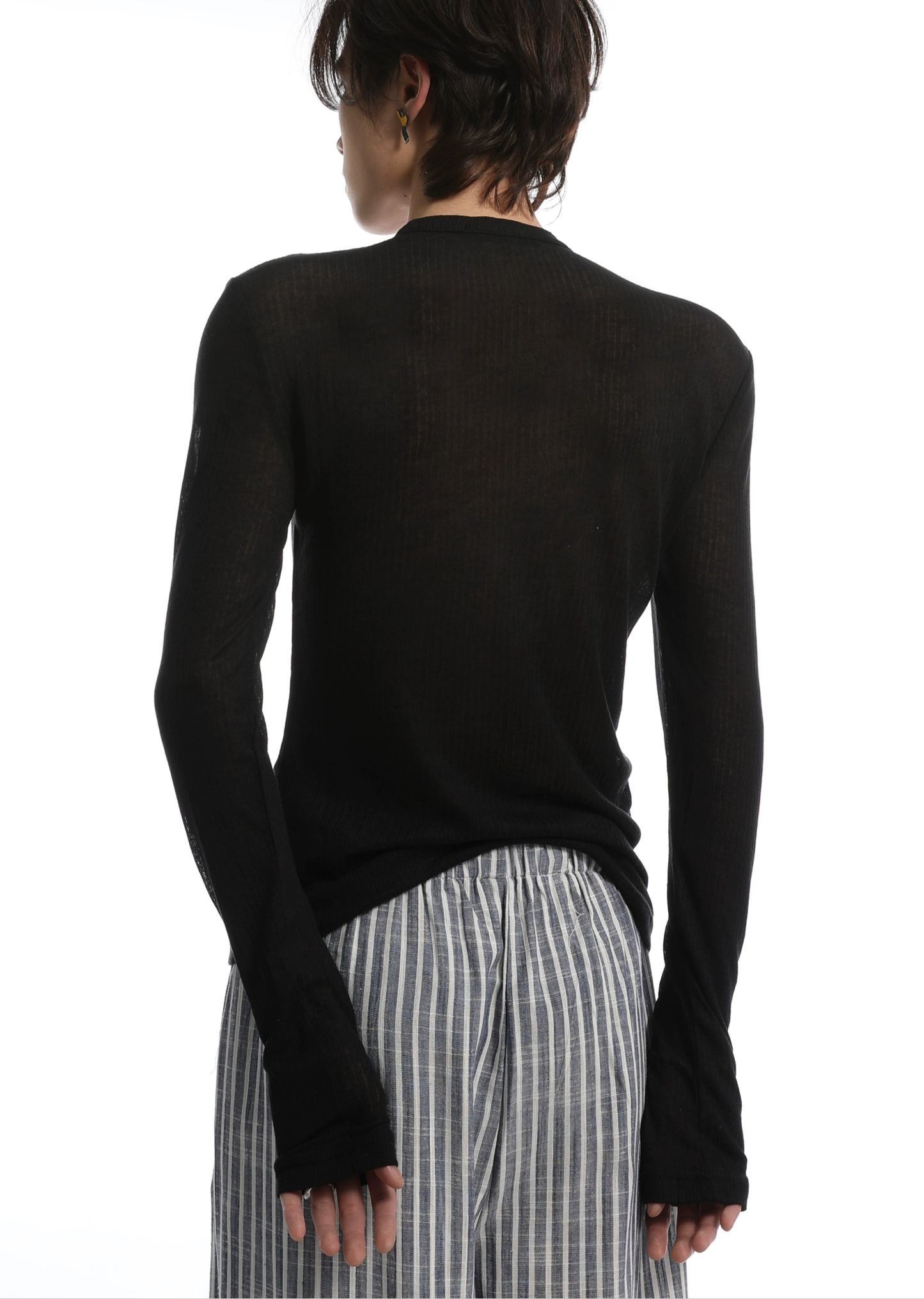 A sheer ribbed knit brings a textured, laid-back edge to this long sleeve Henley shirt — made for easy layering and catching light without trying too hard.