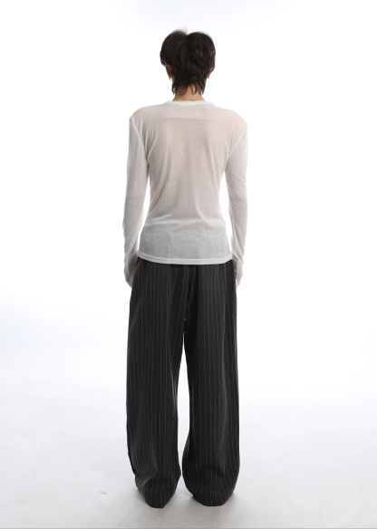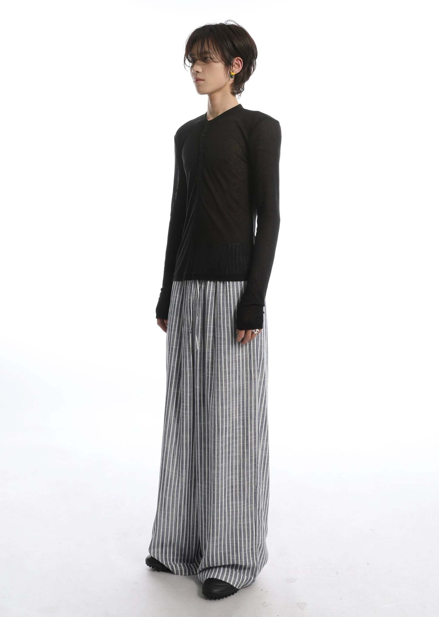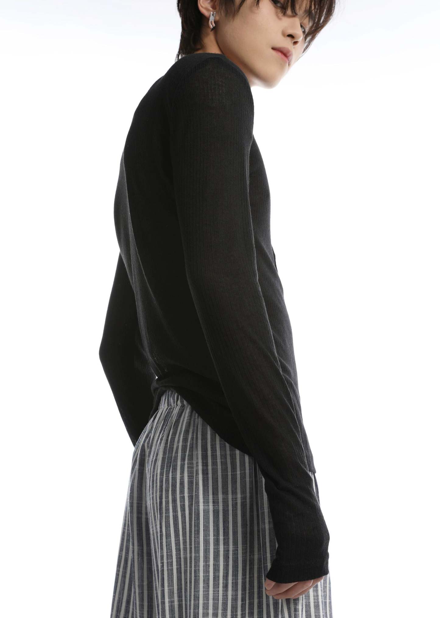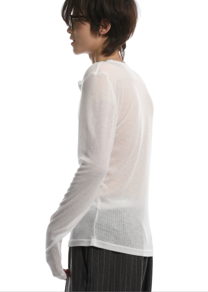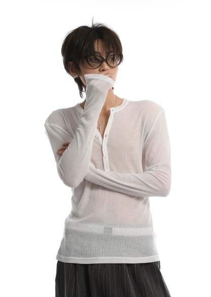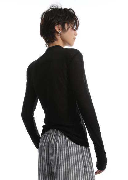 The ultra-lightweight fabric offers a semi-transparent effect that pairs well with both soft tailoring and off-duty looks. Carefully constructed with fine rib knitting and a minimalist button-up closure, it balances structure and flow with a deliberate, modern feel. The round neckline and dropped shoulders add to its relaxed silhouette, while the breathable material keeps it comfortable across changing moments and pace.