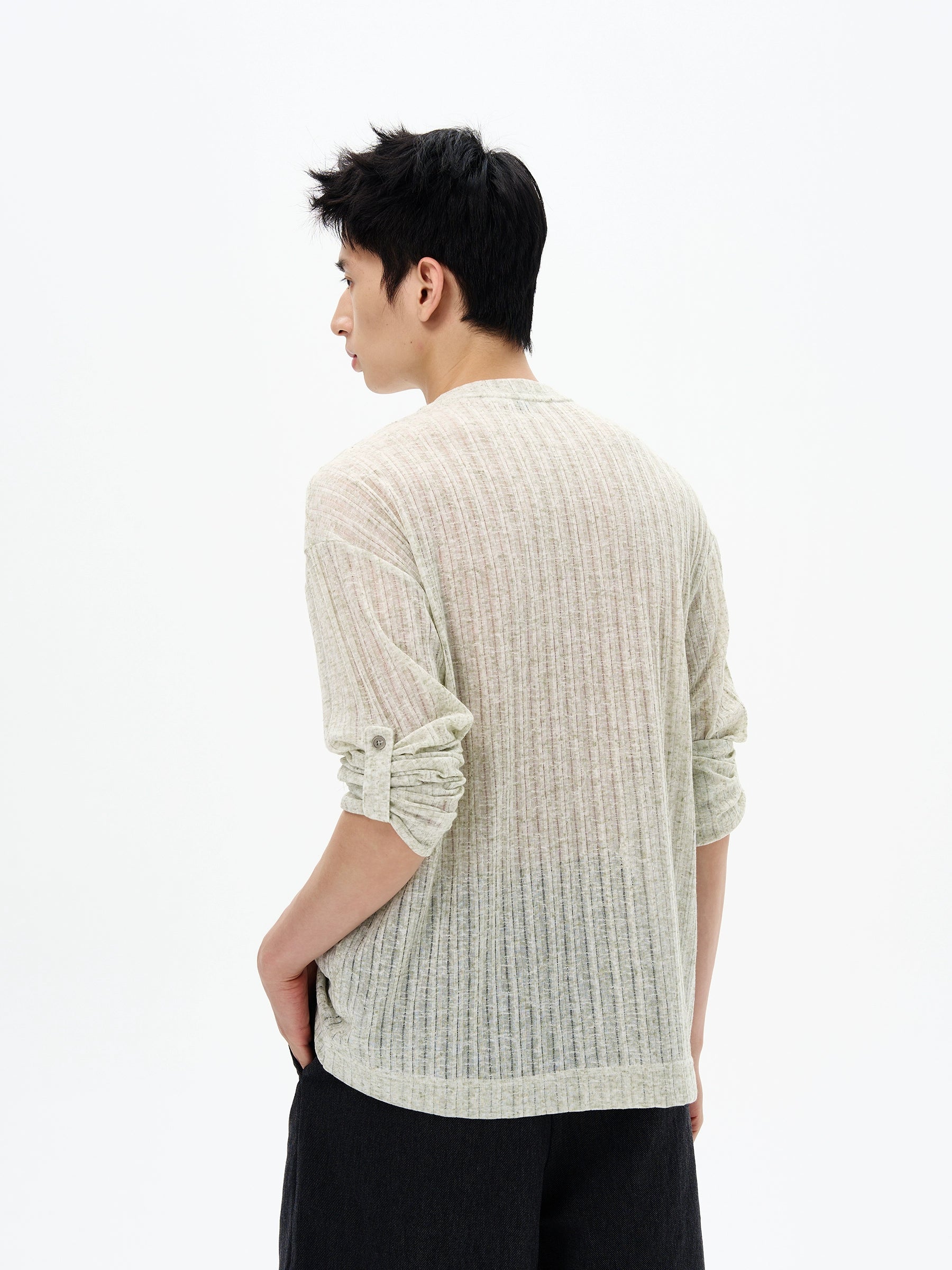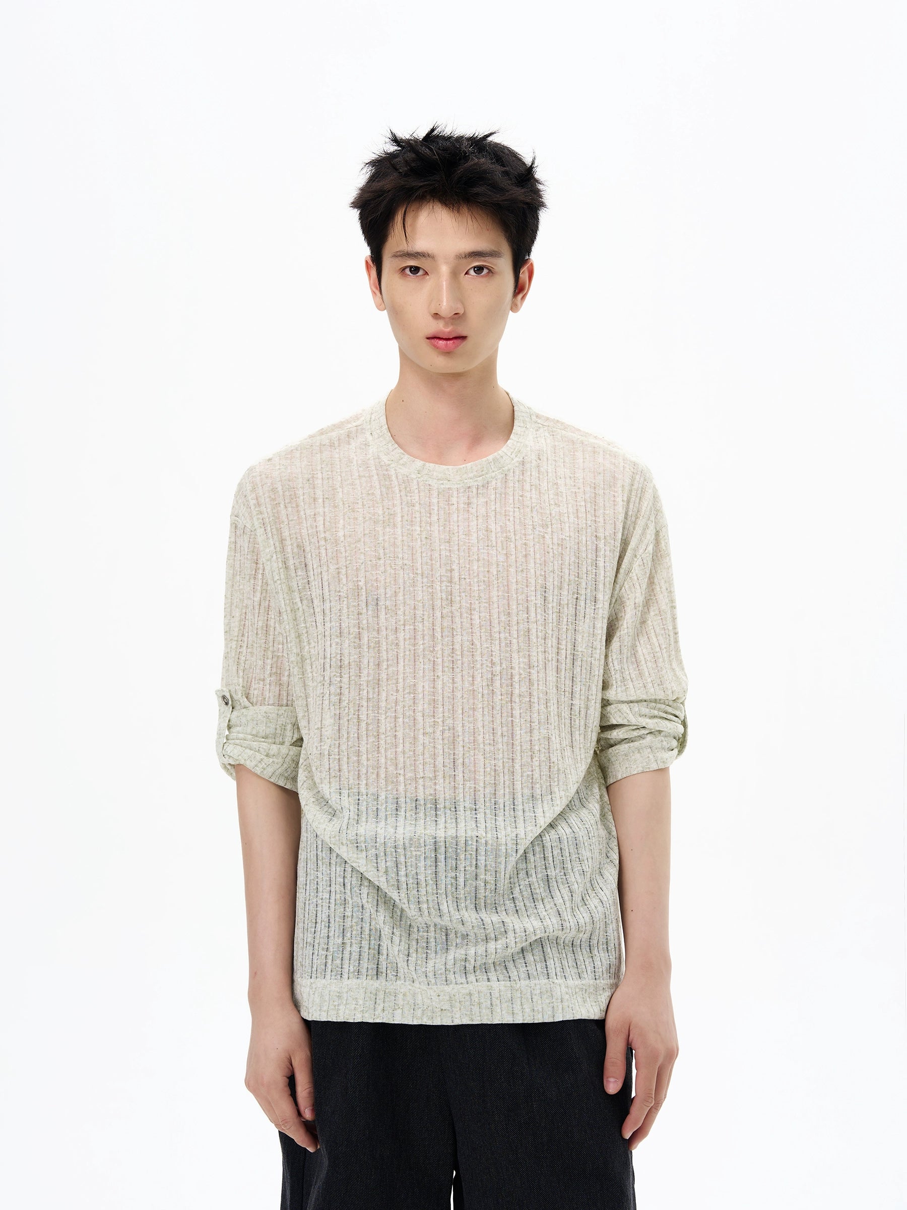Made from a finely knitted material with a subtle ribbed texture, it has a laid-back, semi-see-through finish that feels effortless but intentional. The loose fit, soft hand-feel, and round neckline offer comfort and understated style, while the sheer design adds dimension whether worn on its own or layered up. Throw it over a basic tank, pair it with wide-leg trousers, or lean into contrast by styling it under a structured jacket.