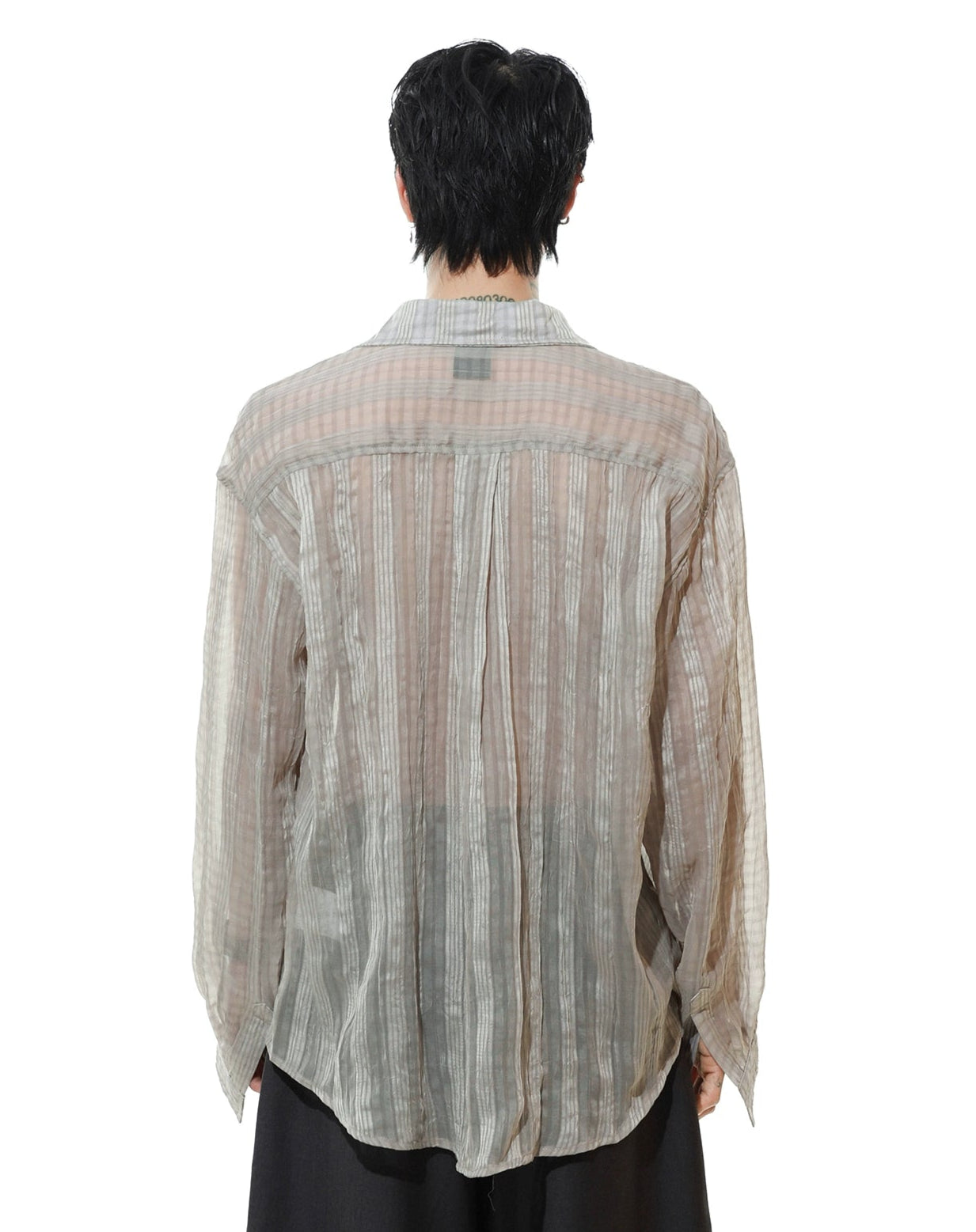 Made from 100% polyester, the fabric has a semi-translucent texture with subtle crinkle detailing that gives it a lived-in, relaxed vibe. The striped pattern keeps things classic, while the loose fit, drop shoulders, and single-breasted front deliver an easy, breathable wear that doesn't compromise on style.