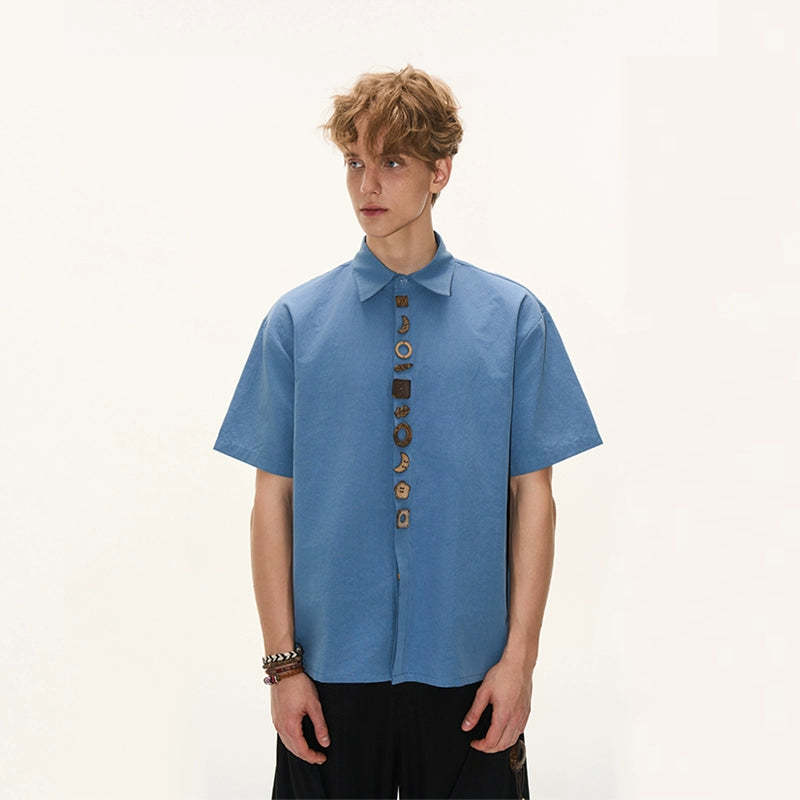A sharp balance of texture and shape, this short sleeve button shirt stands out with its unique geometric button accents that give it quiet depth without trying too hard.