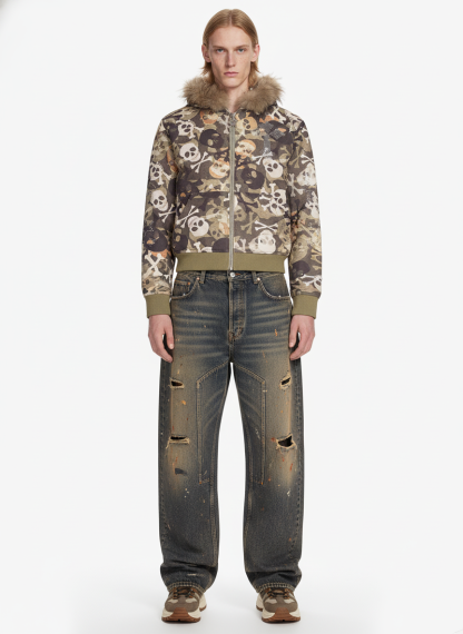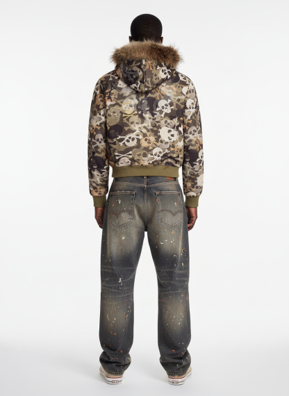 • Design Elements: Skull and crossbones prints, camouflage pattern, faux fur hood trim