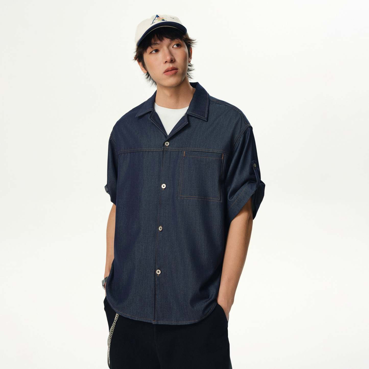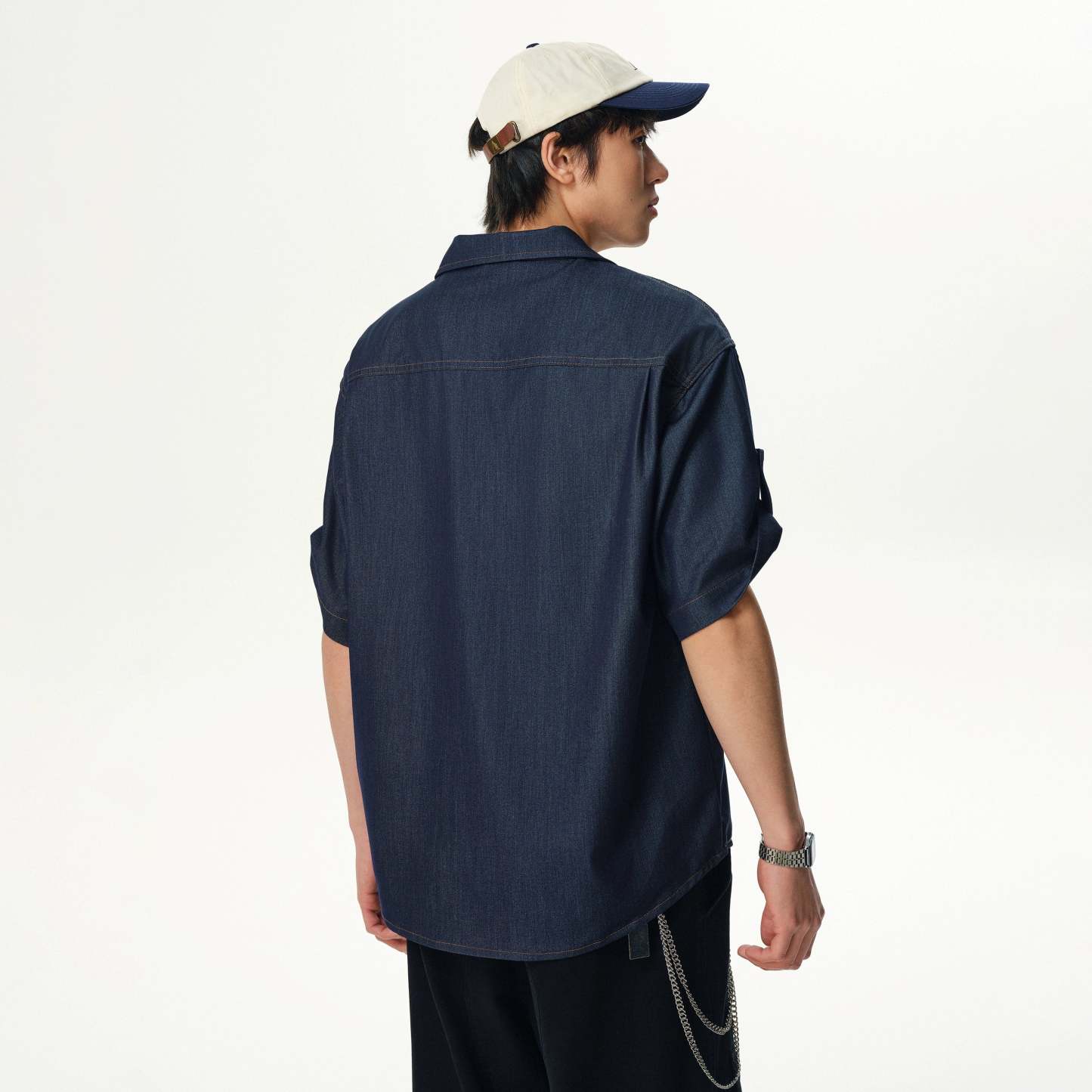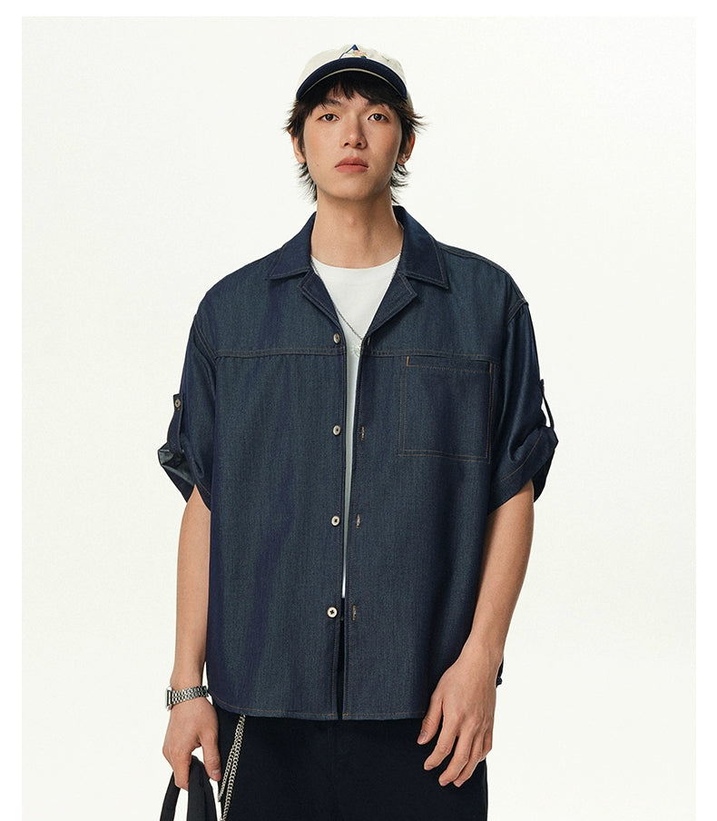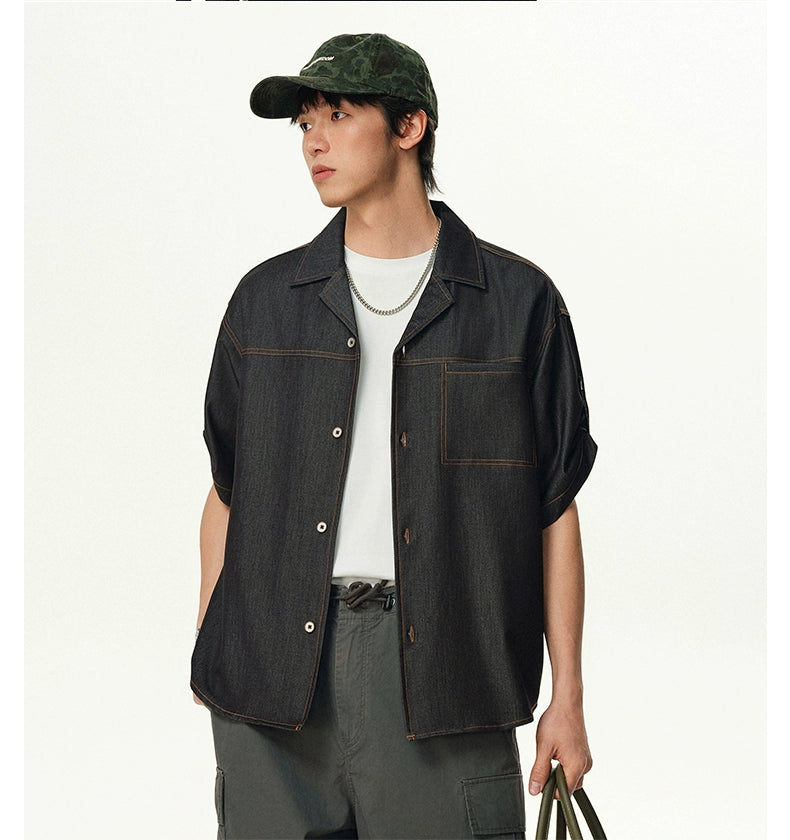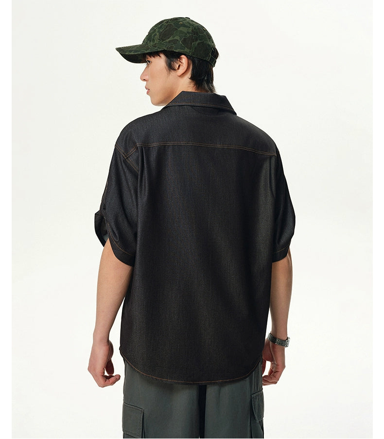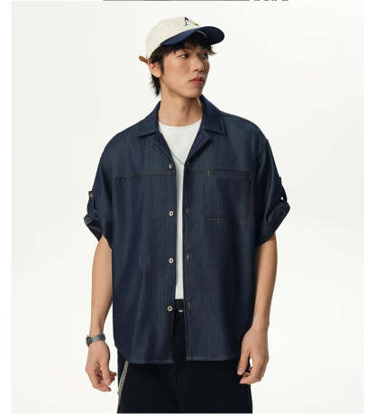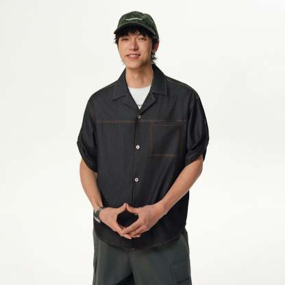 Cut from a lightweight silk-blend fabric made to mimic the texture of denim, this piece features a relaxed fit, subtle contrast topstitching, and a breezy camp collar that pulls the look together. The wrinkle-resistant finish and smooth feel make it an effortless go-to when you want to keep it sharp without trying too hard.