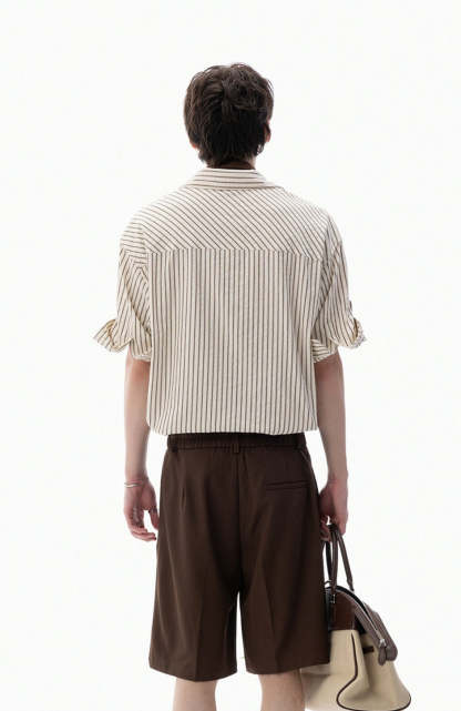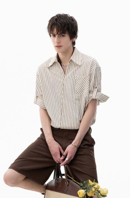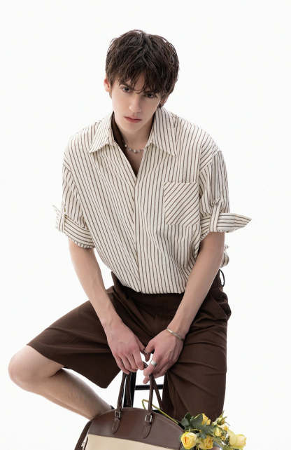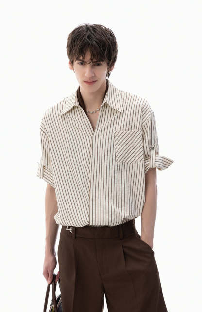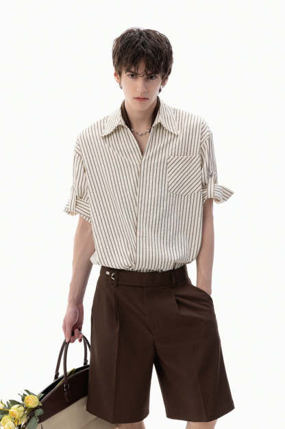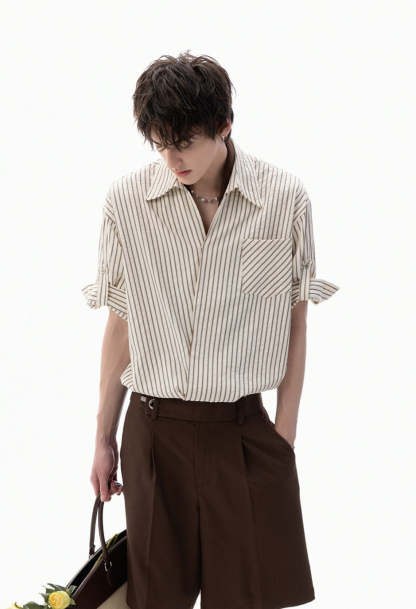 The Stripe Overlap Short Sleeve Button-Up Shirt brings a clean, directional twist to a wardrobe classic with its subtle asymmetric front placket and diagonal stripe alignment.