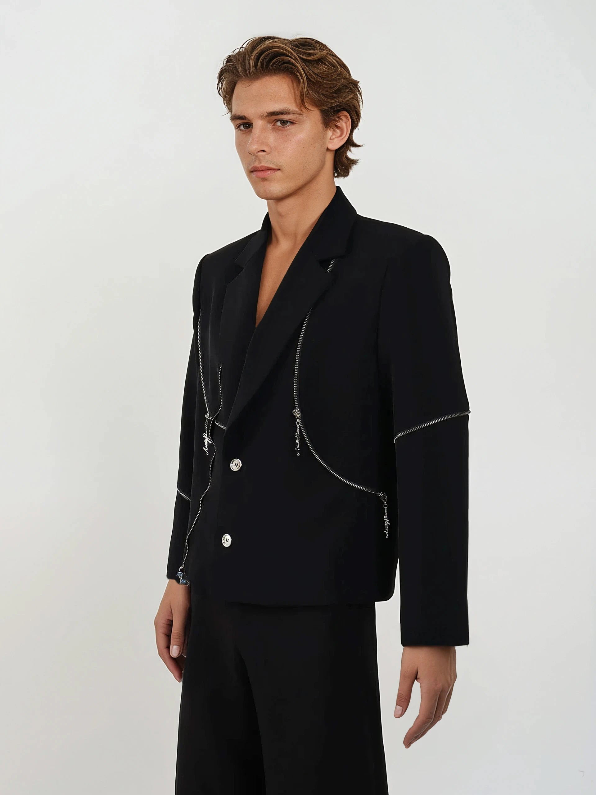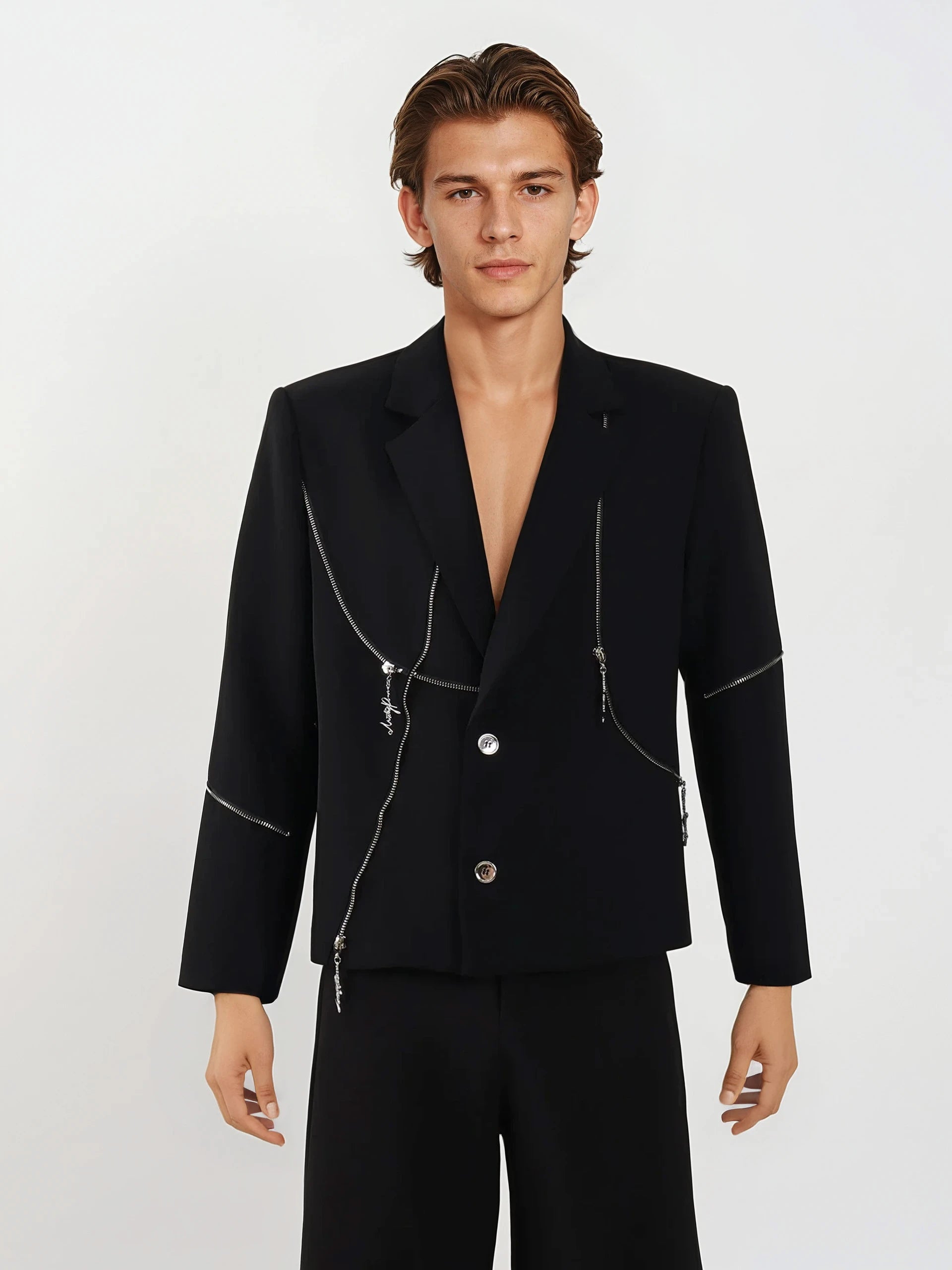 Designed with modern attitude, this structured single-breasted blazer stands out with asymmetric zip detailing that adds edge without sacrificing versatility.