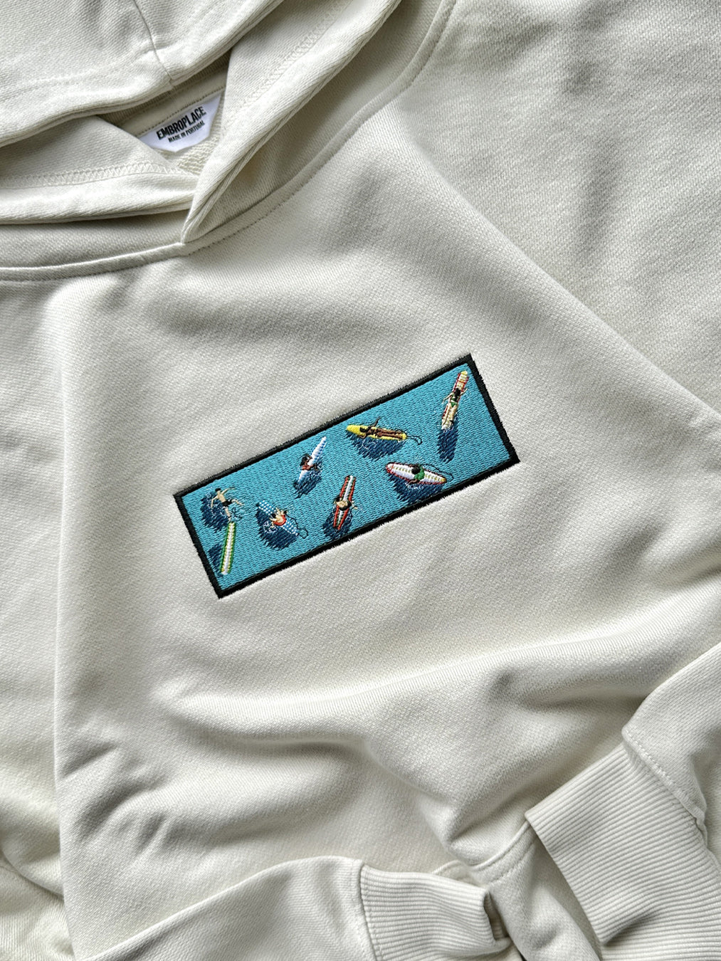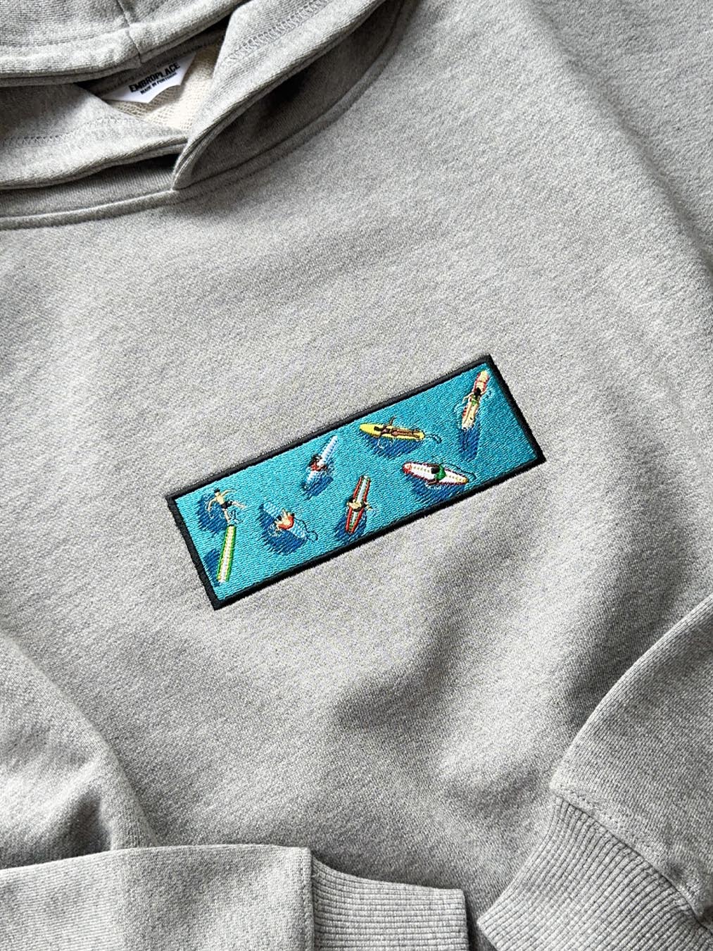 This embroidery design shows seven surfers lying on their boards, waiting for a wave — viewed from above. Set within a horizontal rectangle framed by a black border, the scene features bright turquoise water and detailed, colorful surfboards in yellow, red-and-white, green, and patterns. The scattered arrangement of the surfers captures the calm and quiet anticipation of floating in the open sea.