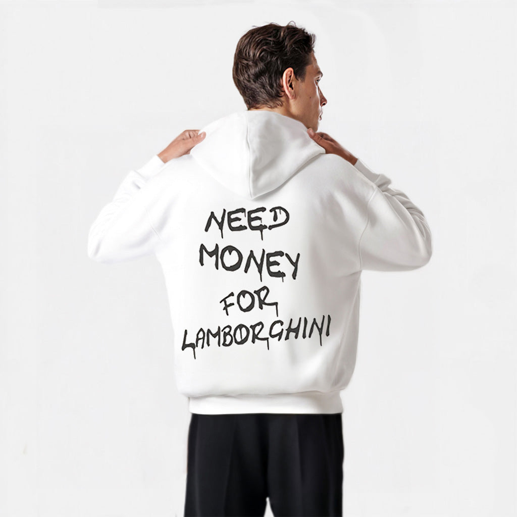 Flocage percutant au dos : message provocateur "NEED MONEY FOR LAMBORGHINI" en typographie street art, unique et impactante.
