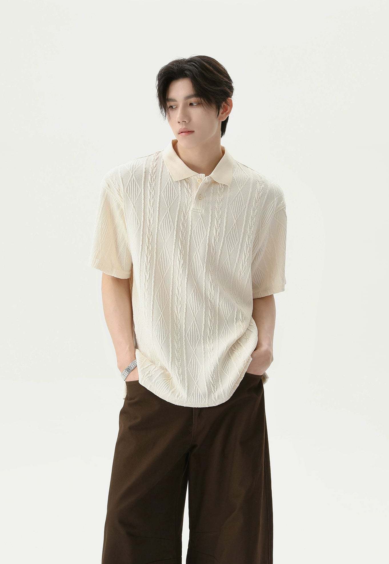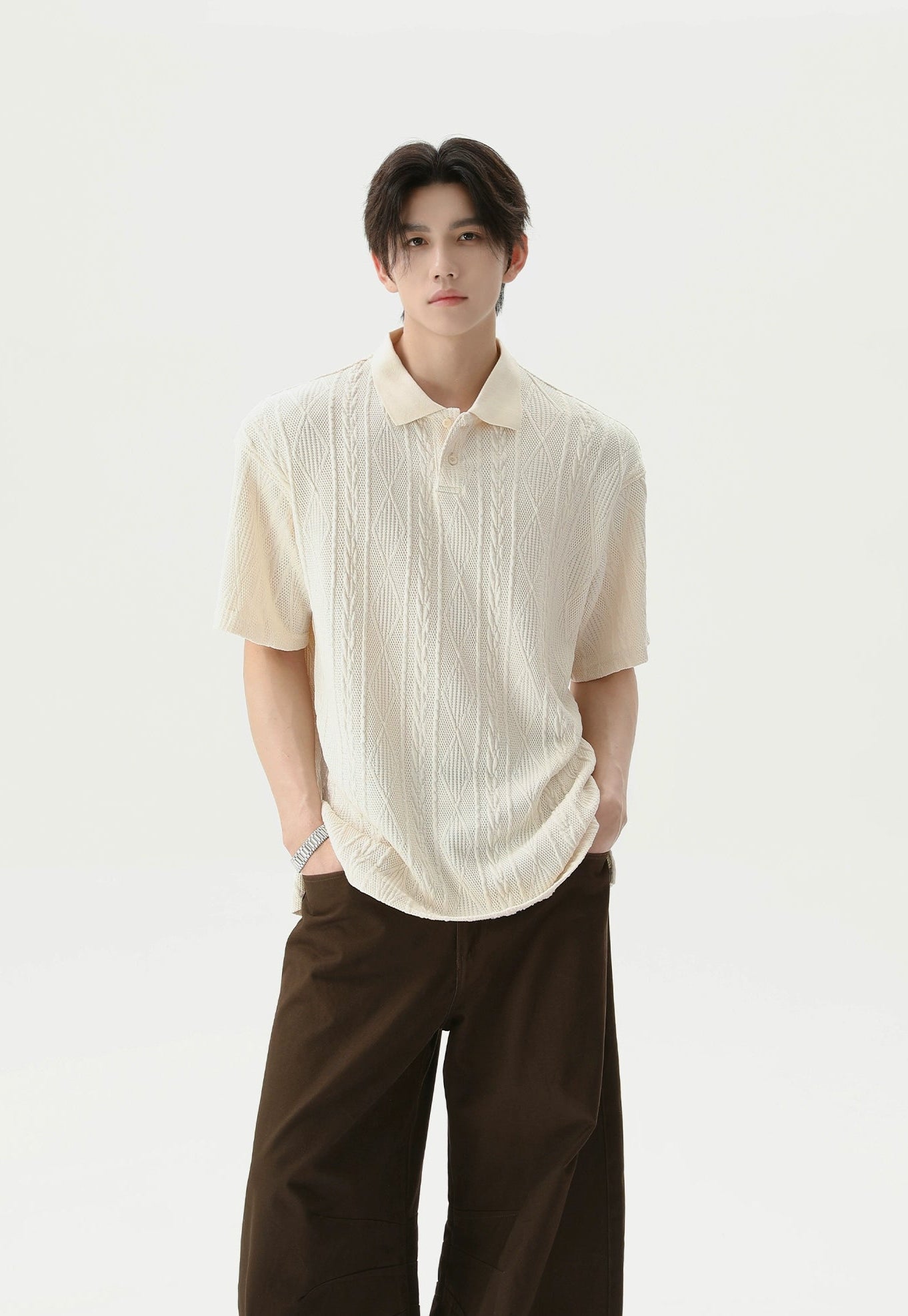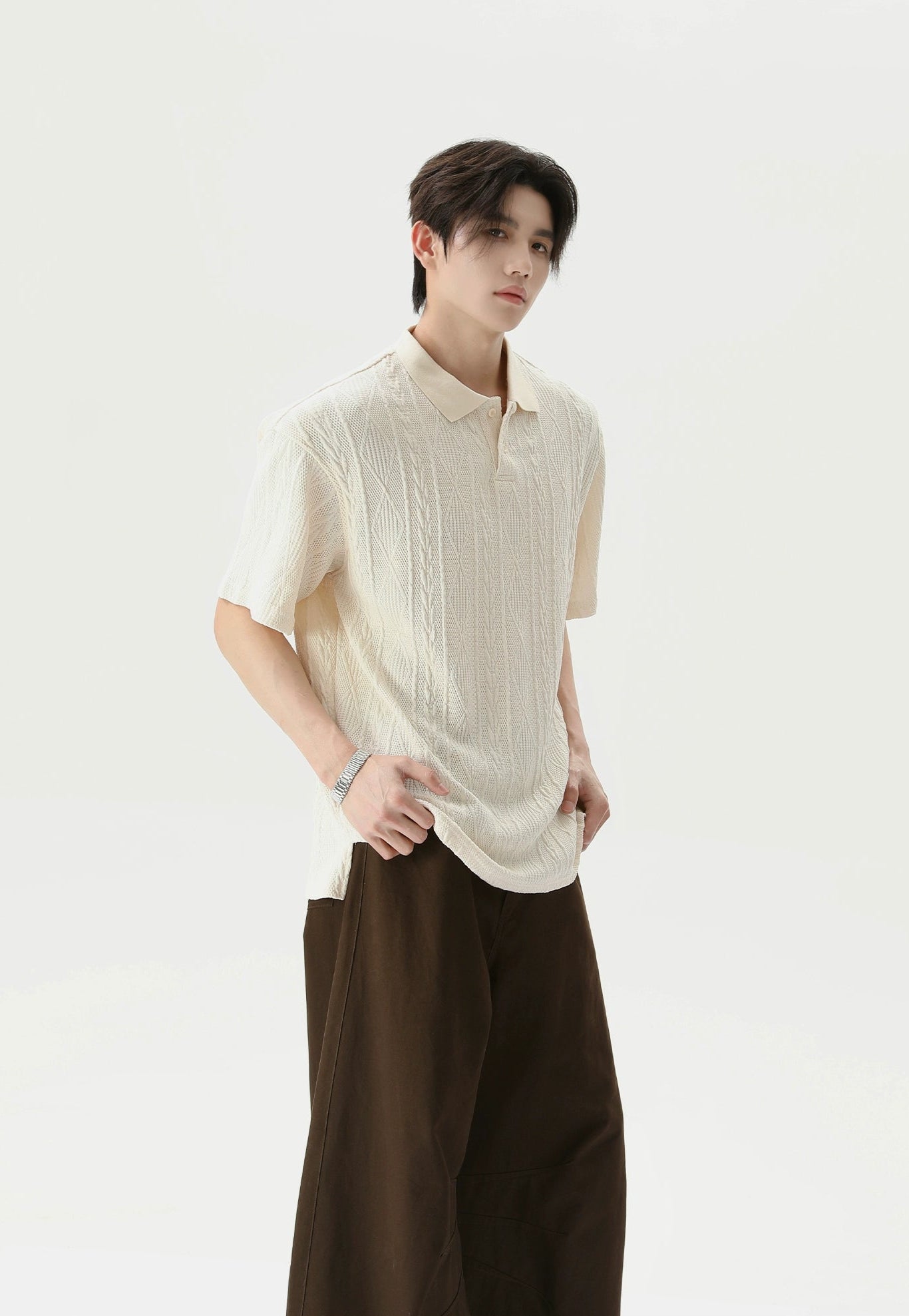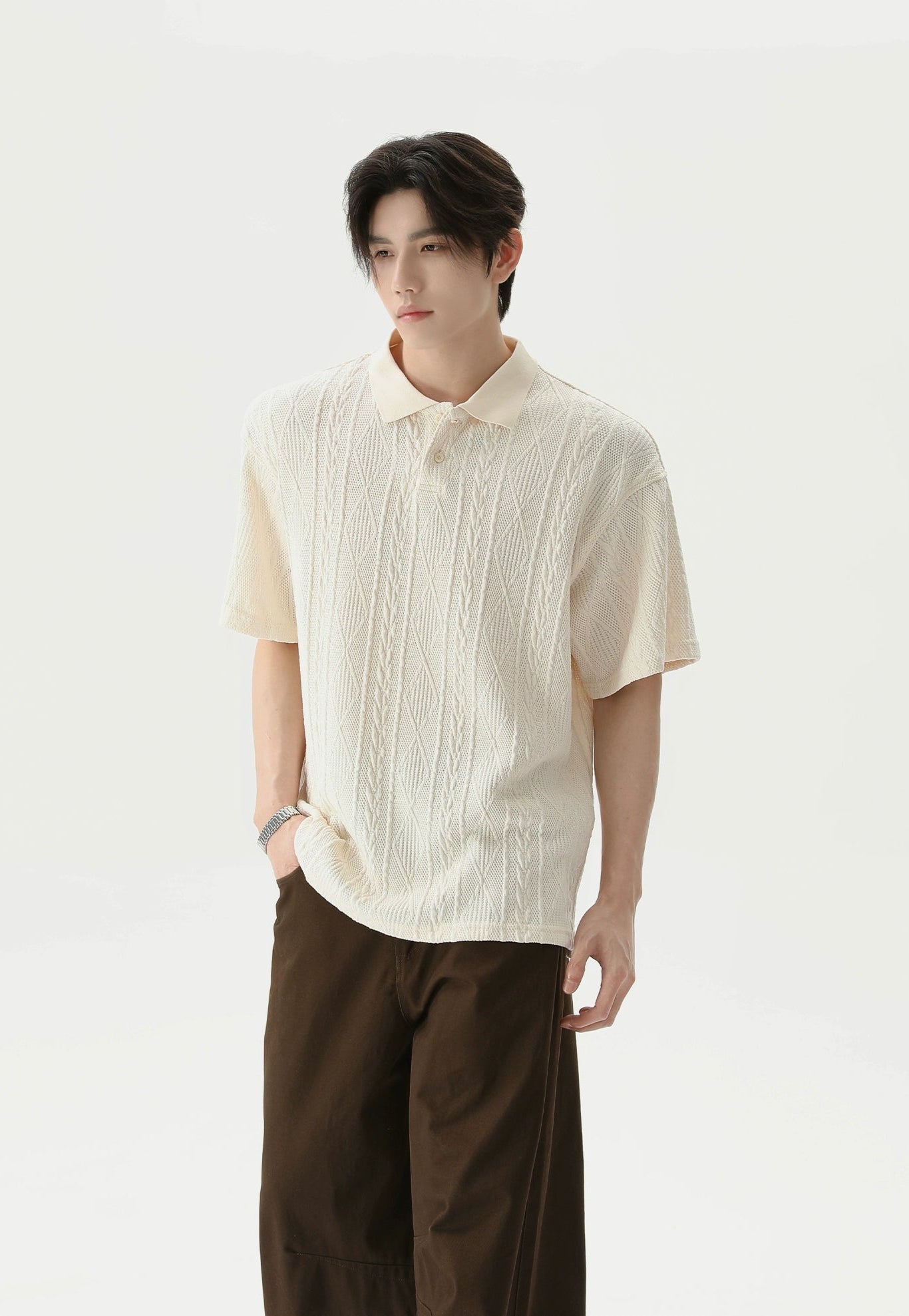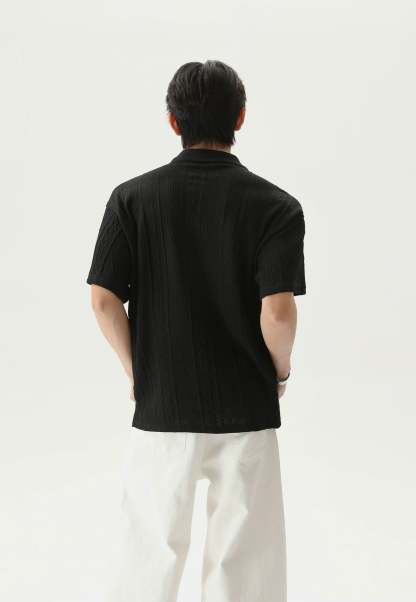Crafted from a soft, breathable blend of 99.7% polyester and 0.3% spandex, this polo shirt features a lightweight cable knit with a relaxed fit and short sleeves. The classic polo collar and tonal buttons keep it timeless, while the knitted pattern adds a quiet visual punch that sets it apart without trying too hard.