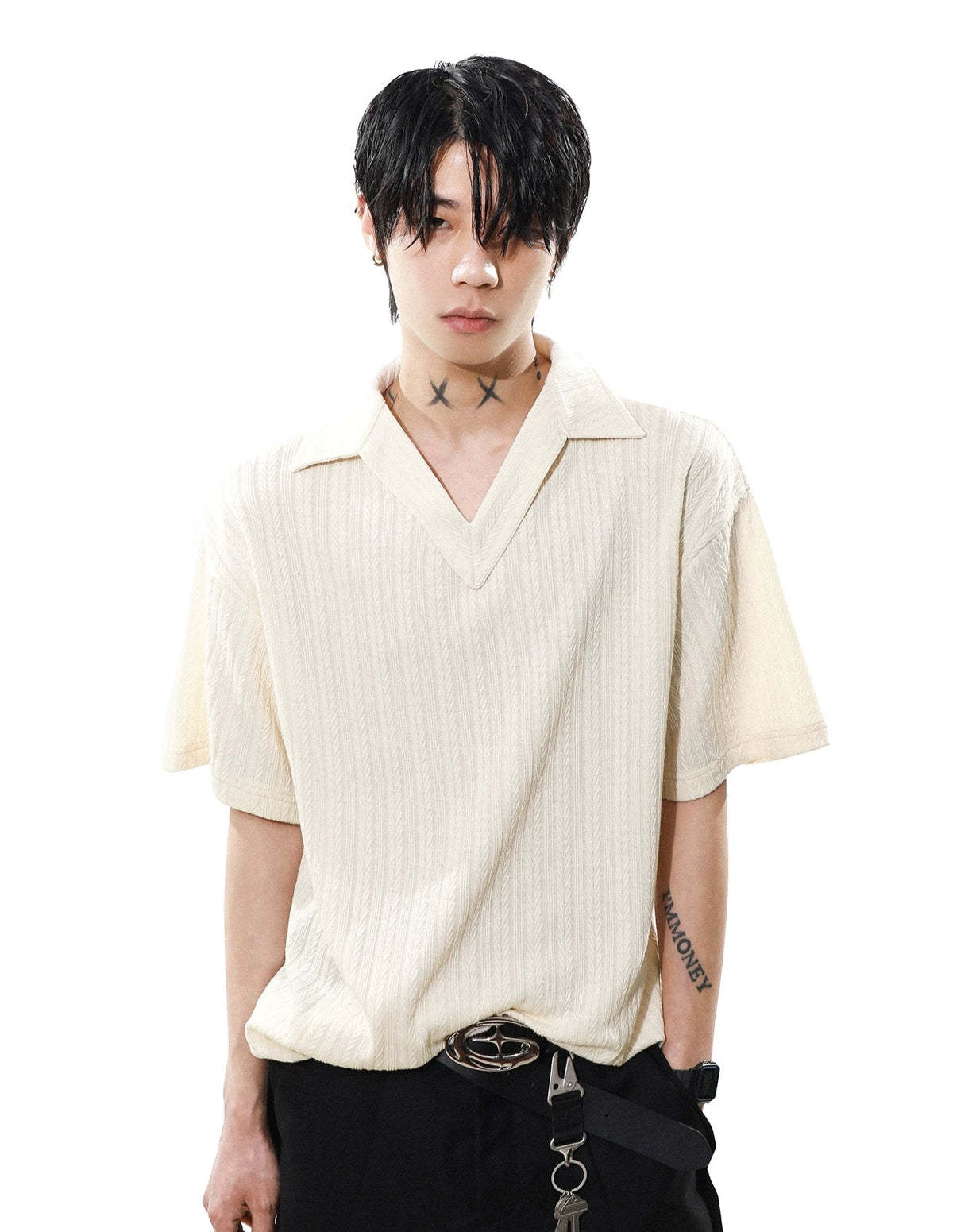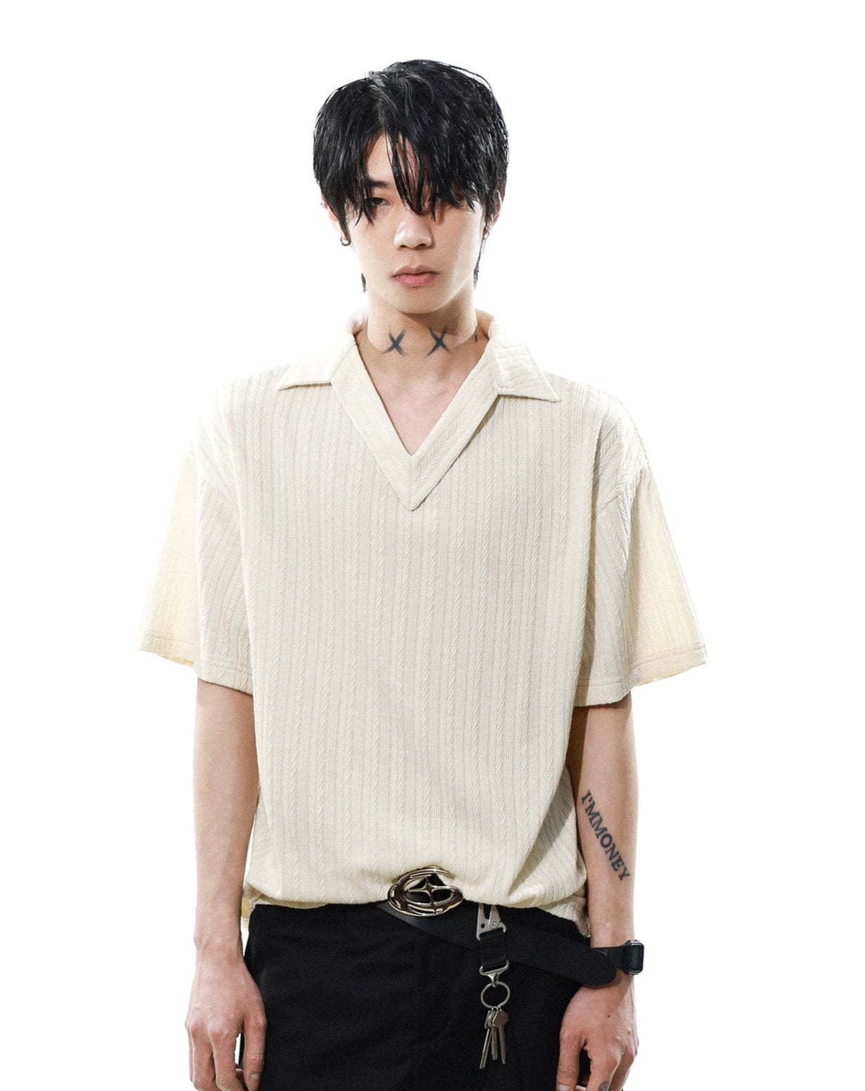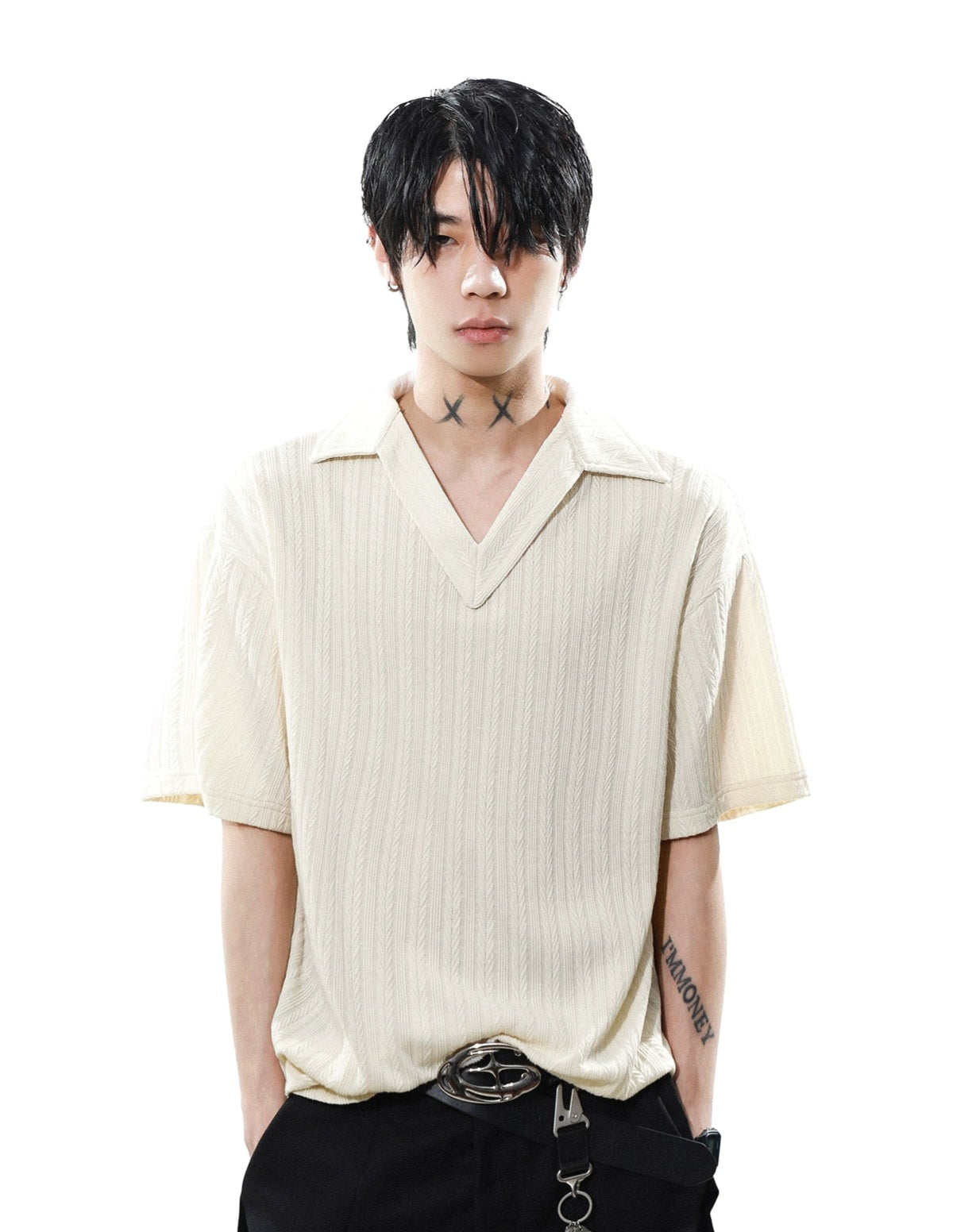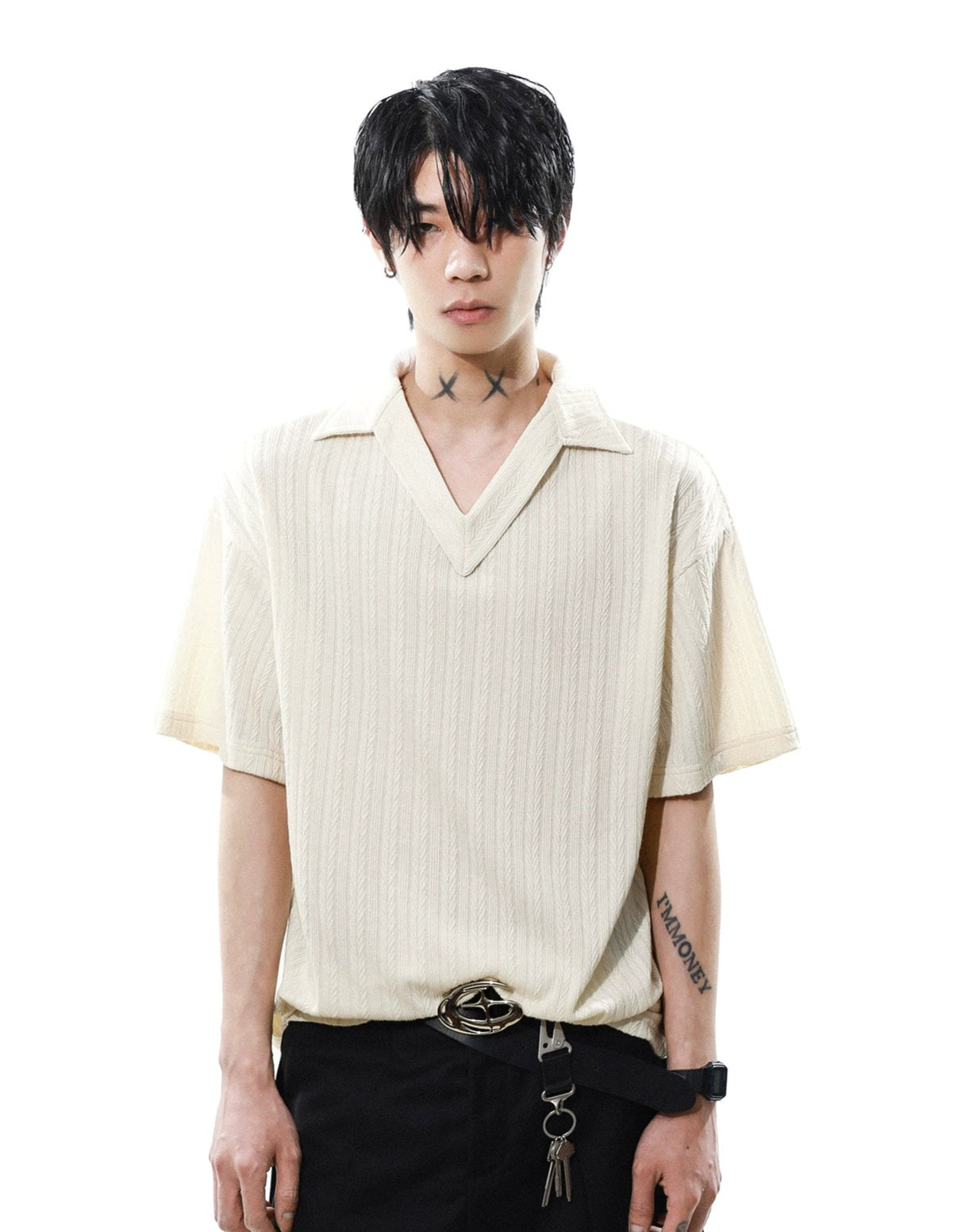 The Textured Knit V-Neck Polo Collar Short Sleeve Top stands out with its subtle, woven texture and laid-back structure, offering a clean, easygoing aesthetic with a nod to retro influences.