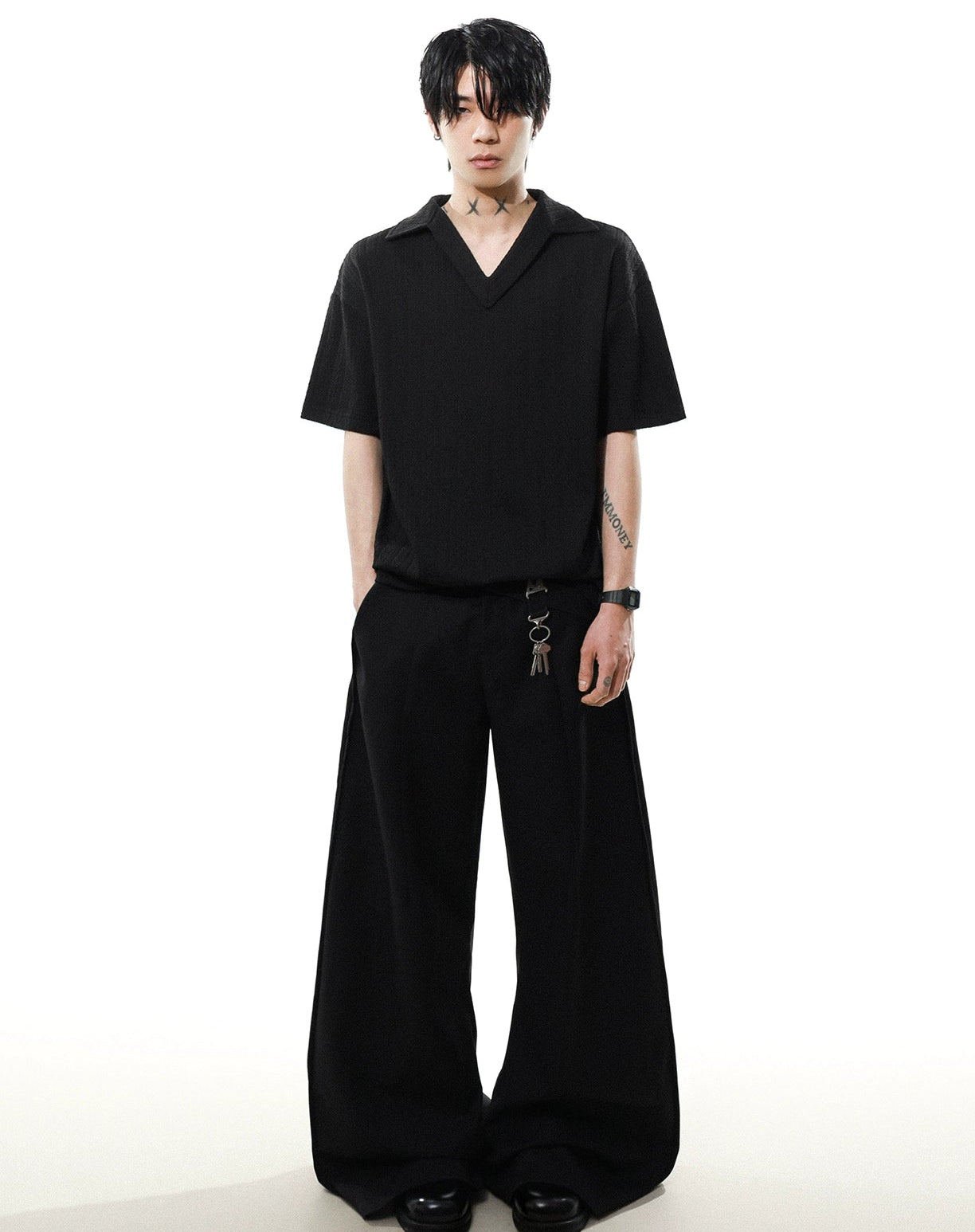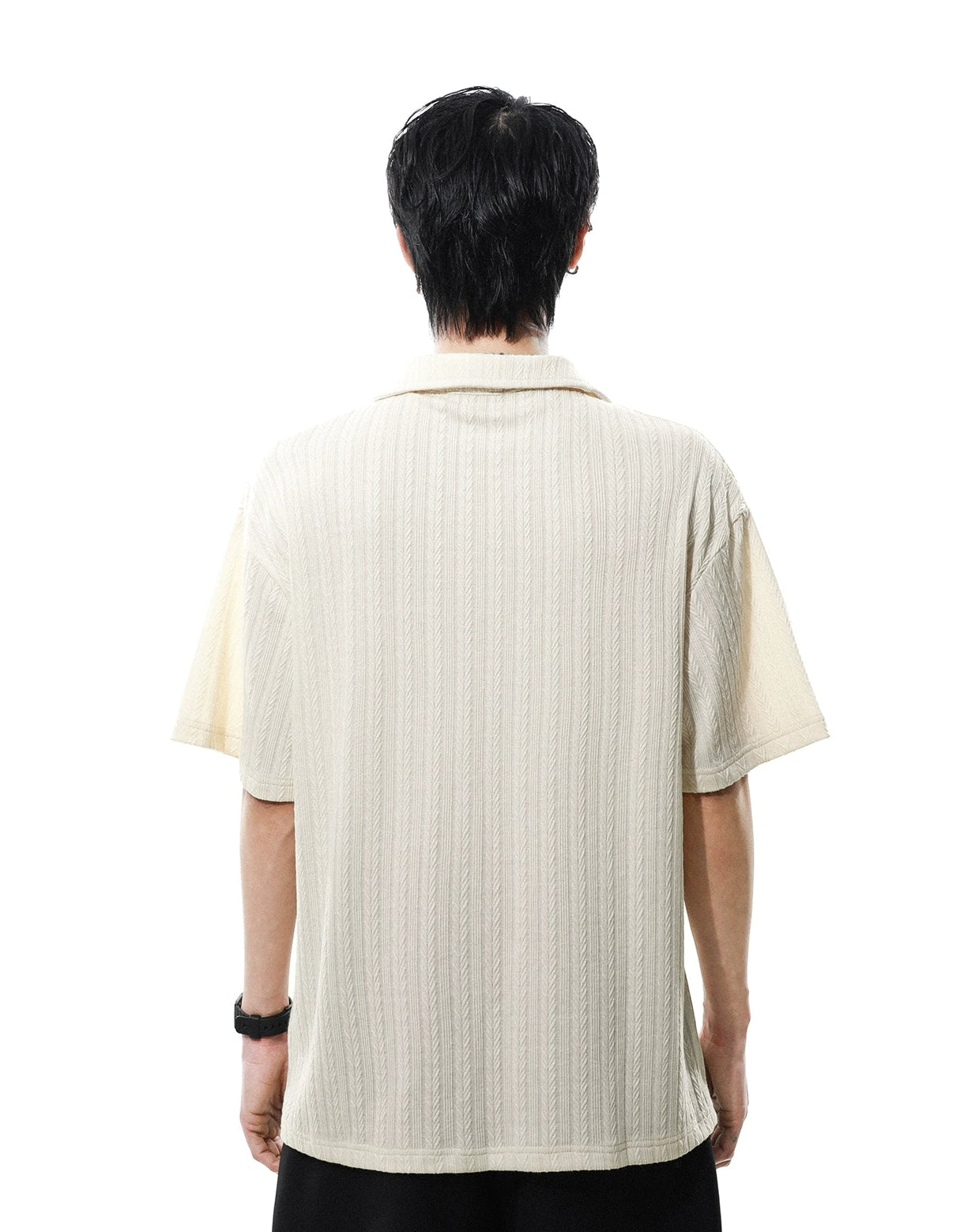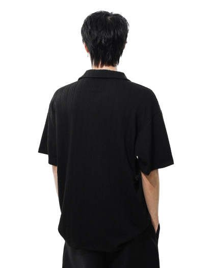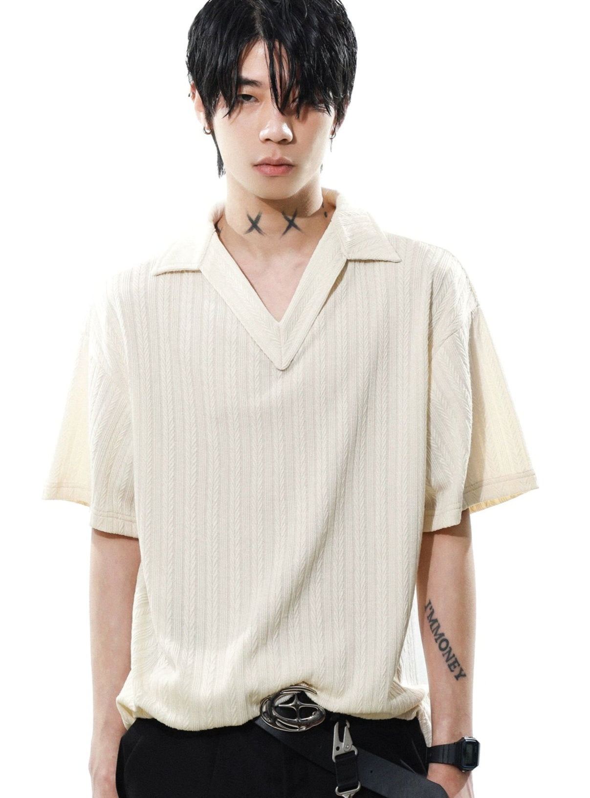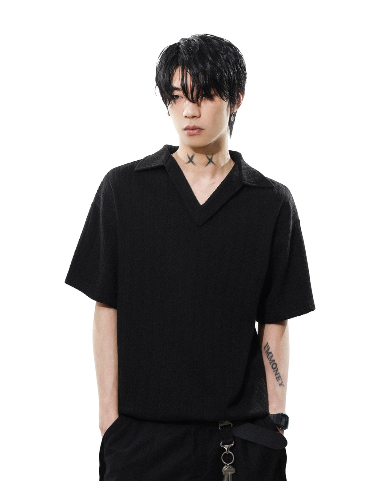 The Textured Knit V-Neck Polo Collar Short Sleeve Top stands out with its subtle, woven texture and laid-back structure, offering a clean, easygoing aesthetic with a nod to retro influences.
