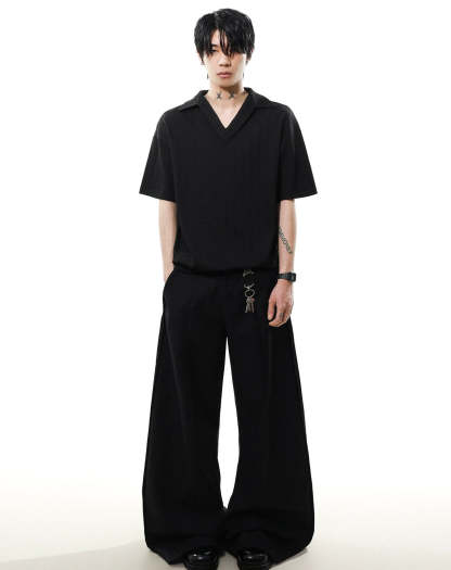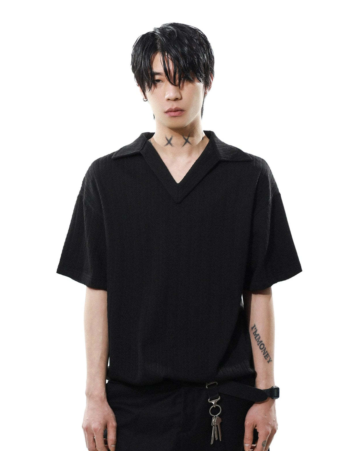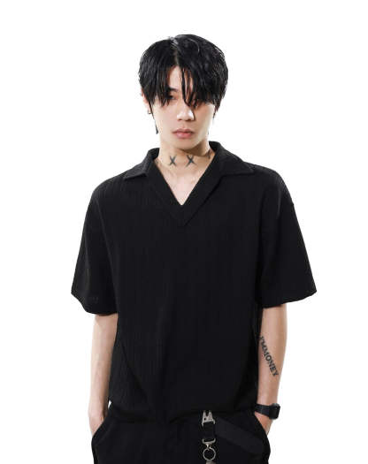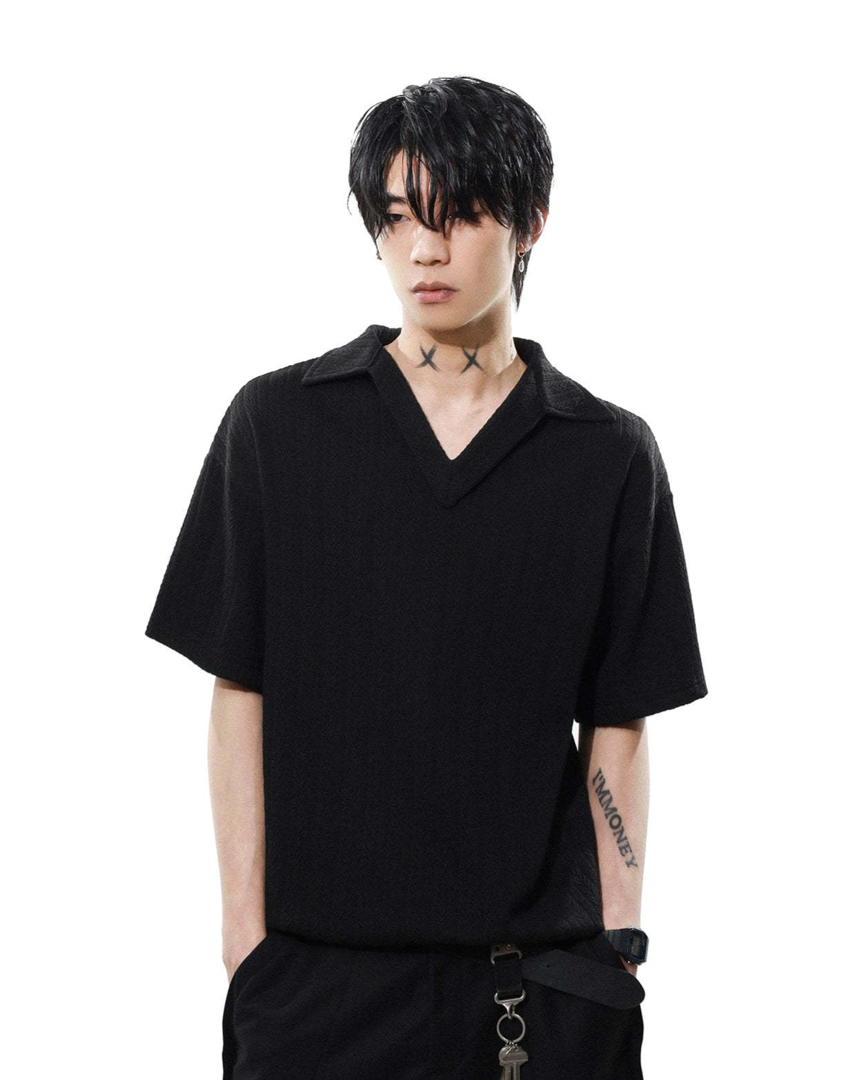 Crafted from a soft, breathable polyester-spandex blend, this short sleeve top features a relaxed fit with a defined knit texture that gives it just enough edge without trying too hard. The open V-neckline and low-profile polo collar add shape without leaning formal, making it a solid everyday piece that keeps its cool whether layered or worn solo.