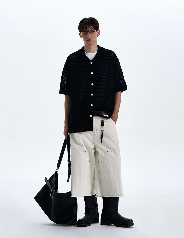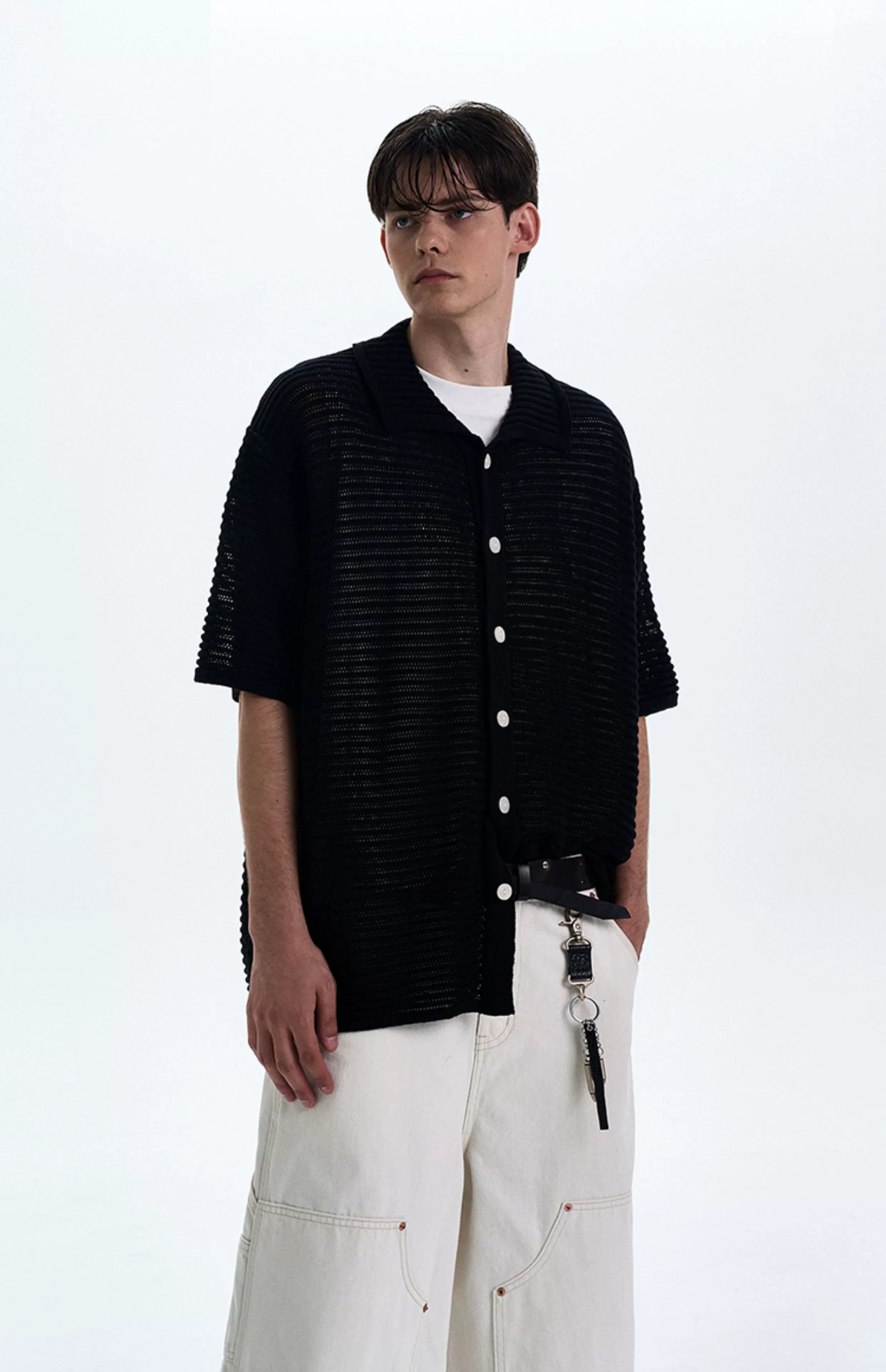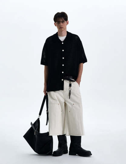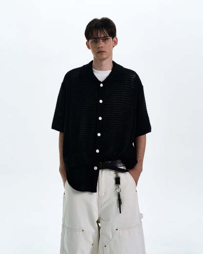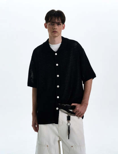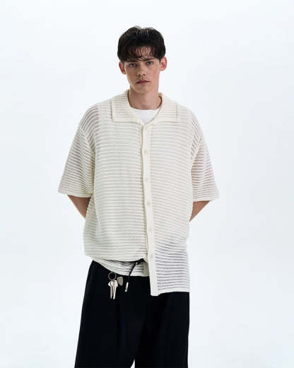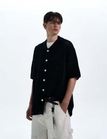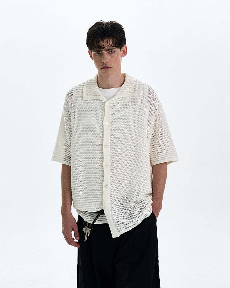 The open weave adds just enough edge while keeping things breezy and understated. Crafted from a soft, breathable synthetic blend, the shirt's subtle see-through pattern and relaxed silhouette make it perfect for layering or wearing solo. The lapel collar and tonal buttons play into a minimal, yet sharp profile that works thrown over a tank or worn buttoned with tailored pants.
