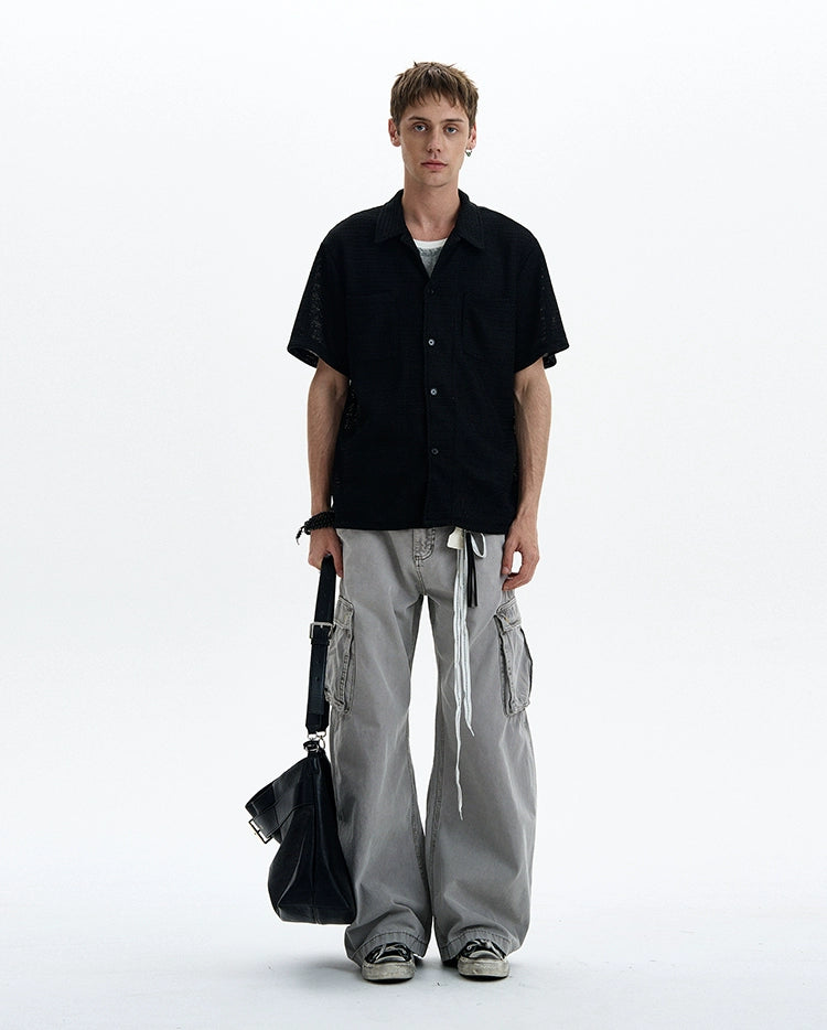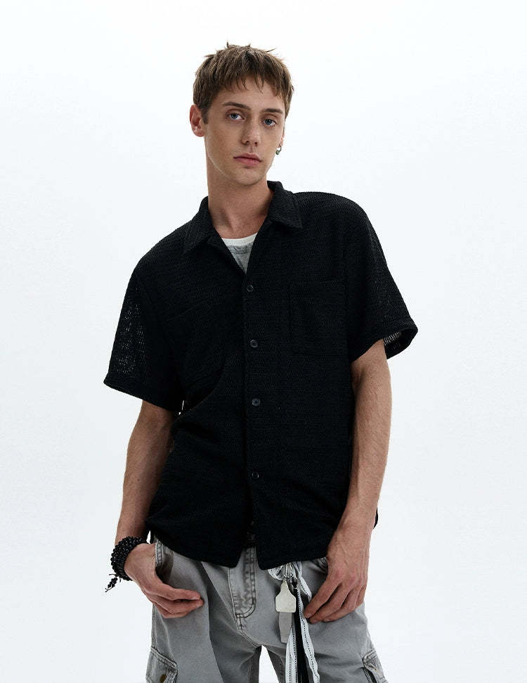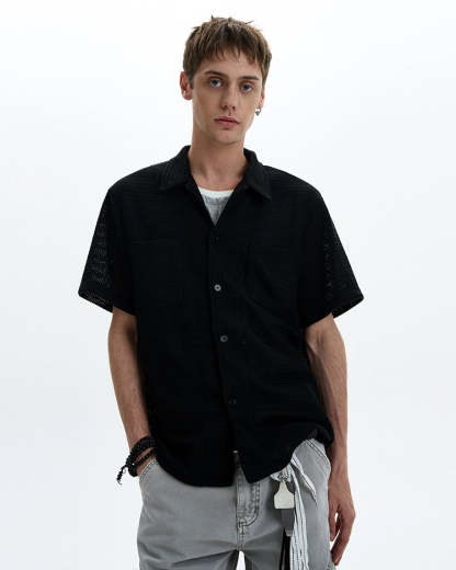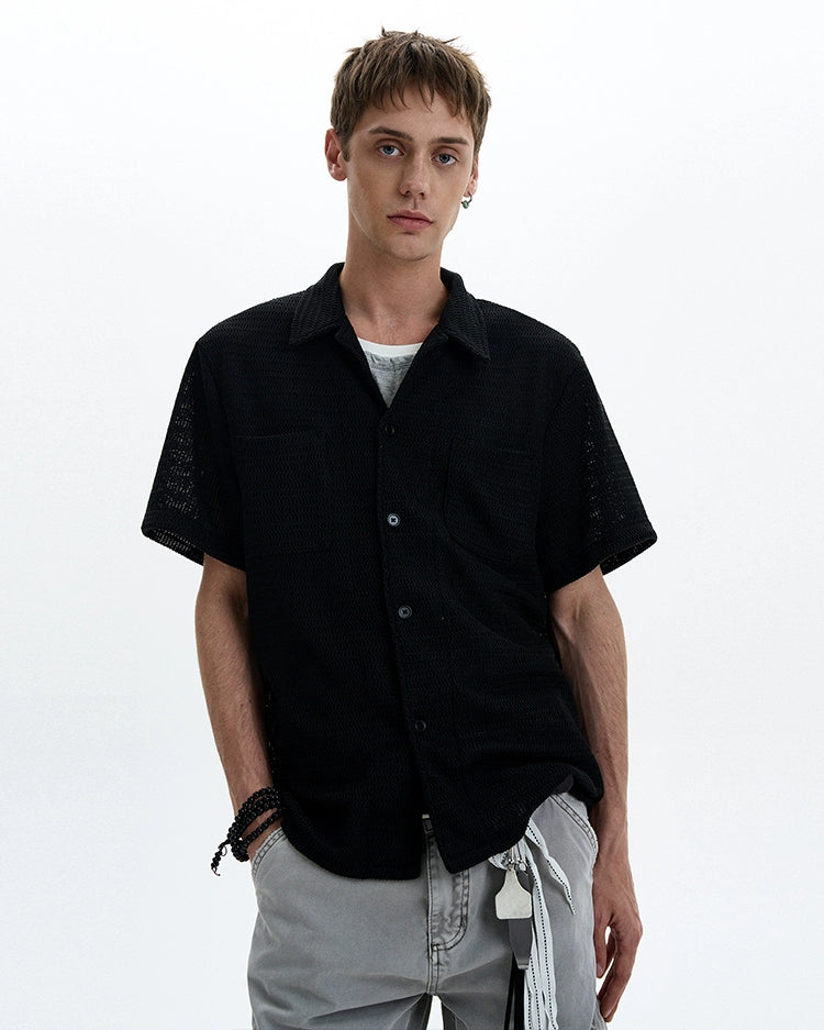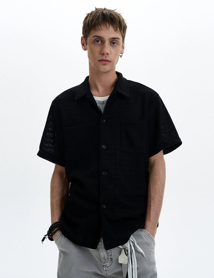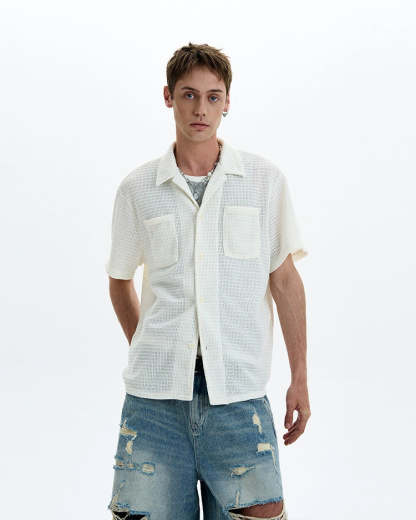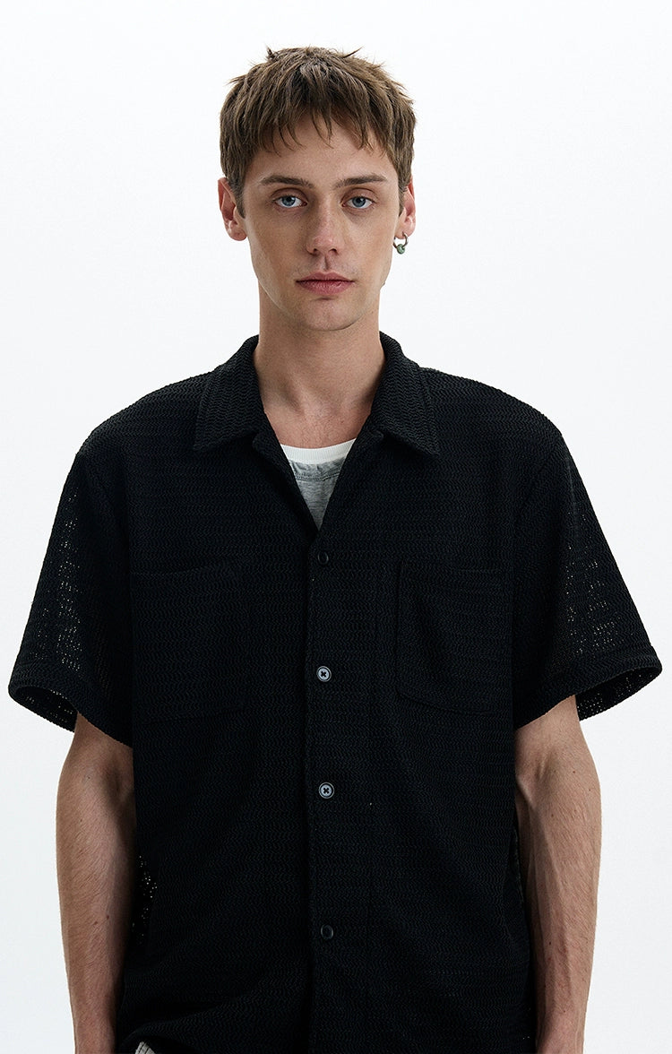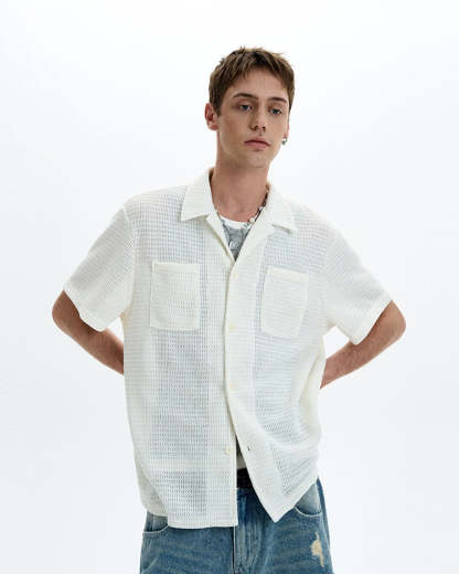 With its breathable waffle-knit style and soft structure, this shirt layers easily or holds its own as a standalone piece. The lightweight open-knit fabric creates dimension while keeping it easy to wear year-round. Front patch pockets and tonal buttons add subtle detailing, while the relaxed fit and lapel collar lean into effortless versatility.