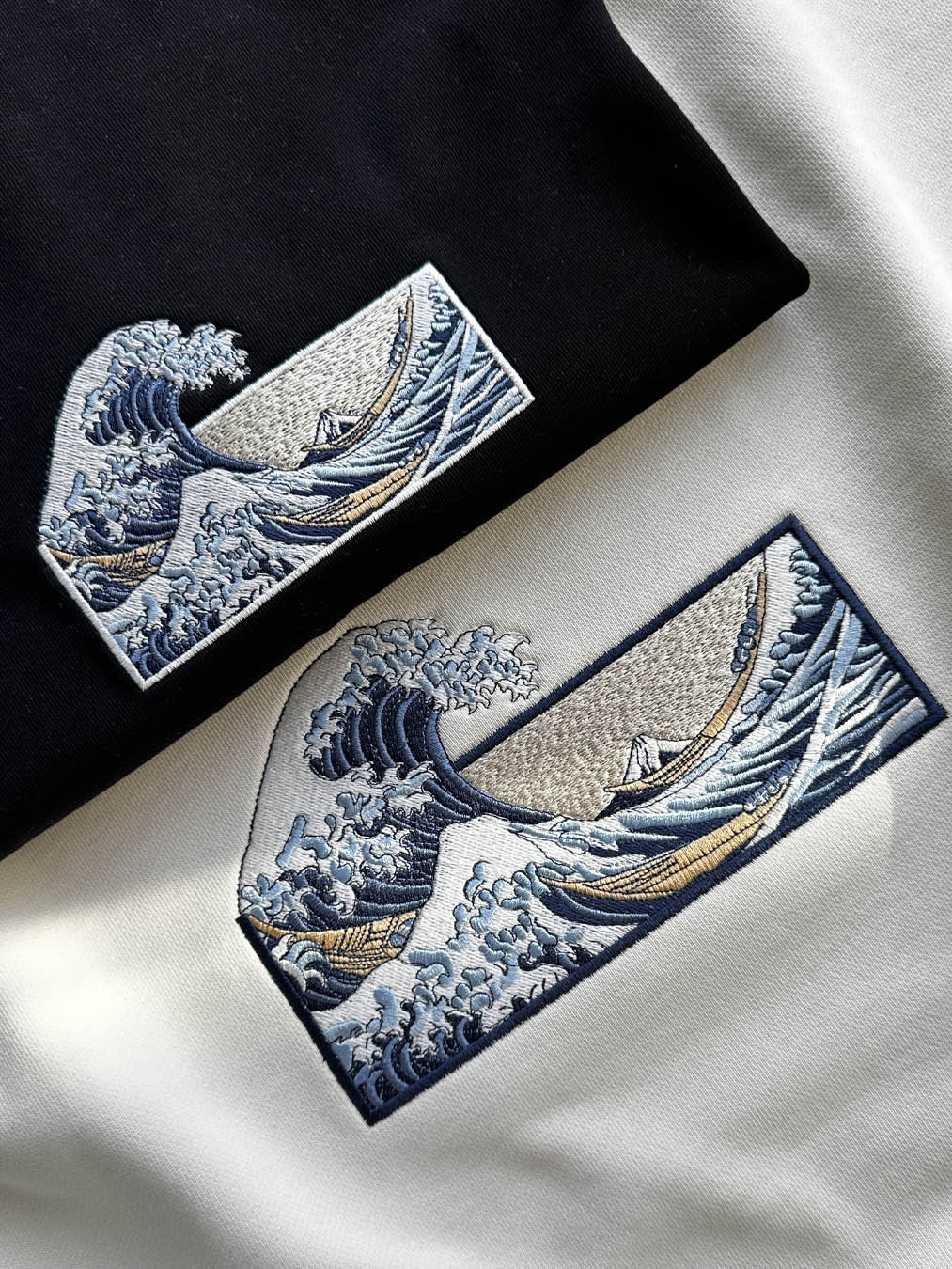 Introducing the new design "The Great Wave off Kanagawa." Based on Hokusai’s iconic 1831 woodblock print, this embroidery depicts three boats caught in a stormy sea beneath a towering spiral wave, with Mount Fuji in the background — a timeless symbol of nature’s power and beauty.