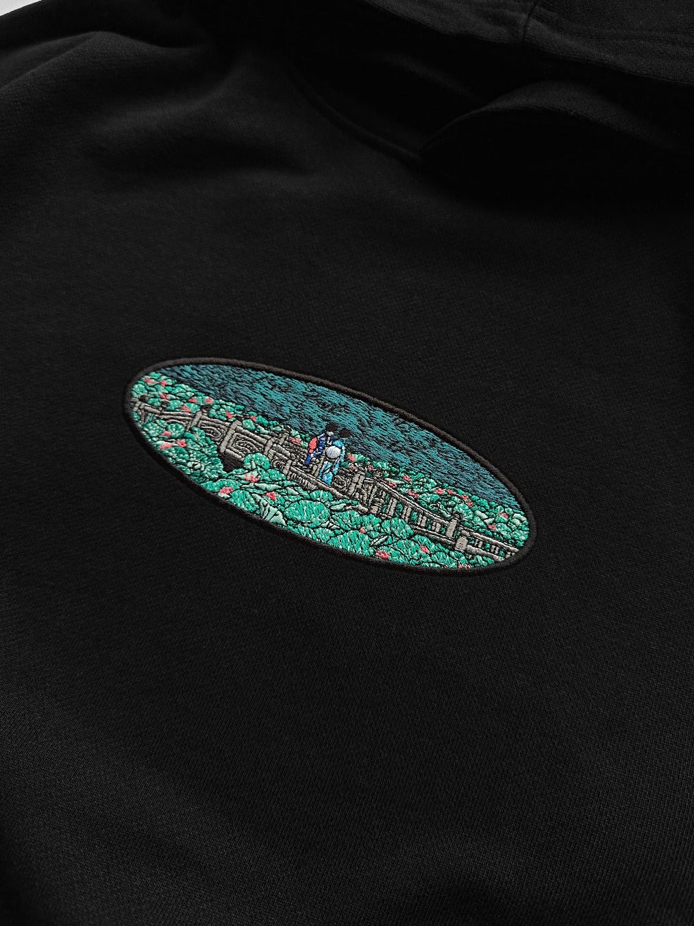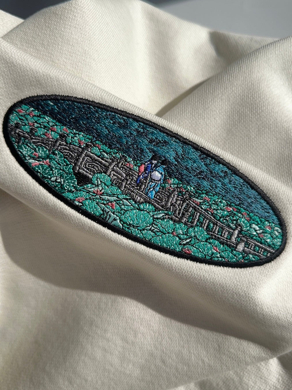 Introducing a new machine embroidery design inspired by Japanese artist Kawase Hasui — "The Pond at Benten Shrine in Shiba." The design features two geishas walking across a bridge surrounded by lush greenery, blending nature, spirituality, and Japanese cultural heritage into a single, harmonious scene.