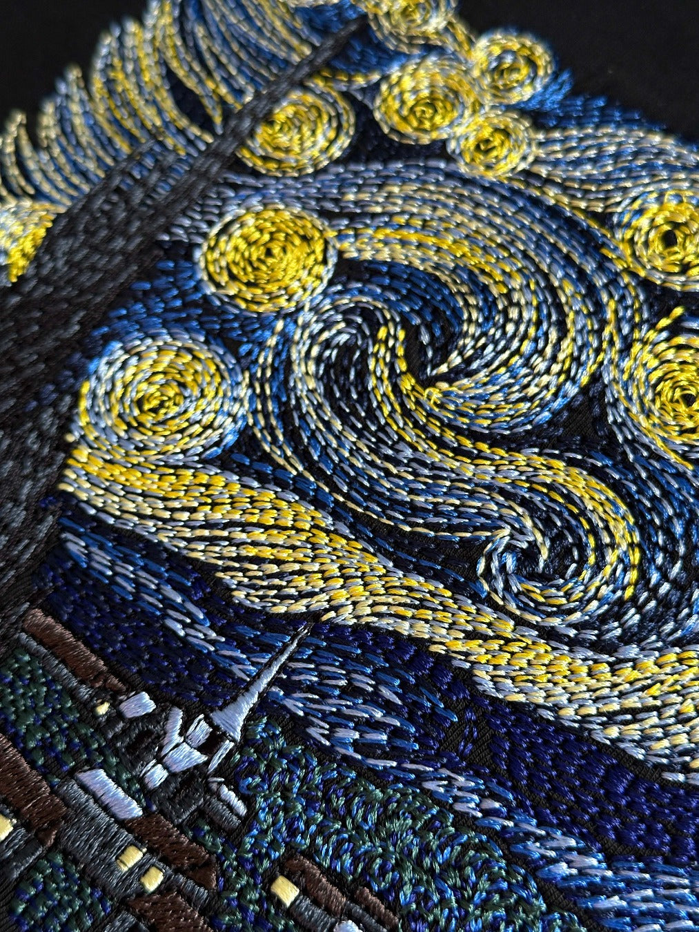 Van Gogh’s "The Starry Night" is reimagined as a unique embroidery design. Vibrant colors and swirling skies are transformed into thread, creating a striking detail on the chest. Available on T-shirts, sweatshirts, and hoodies.