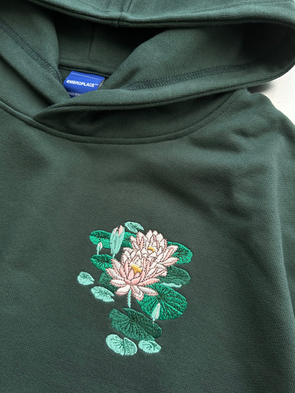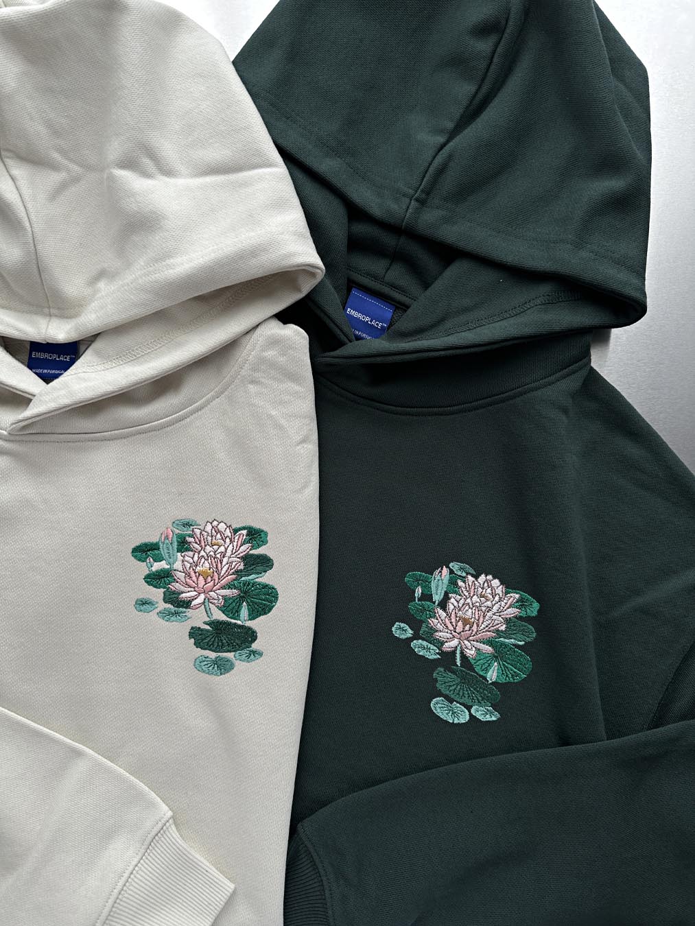 The painting 'Water Lily' by Ohara Koson depicts lilies in soft pastel tones. The embroidery faithfully captures these details with a focus on textures — from the delicate petals of the lilies to the contours of the leaves. Each detail recreates the atmosphere of harmony and tranquility characteristic of the original.