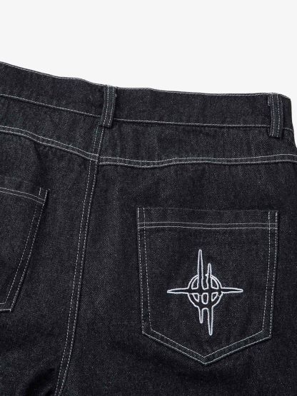 • Detail Features: White embroidered flame design on the sides, wide-leg cut, classic five-pocket style