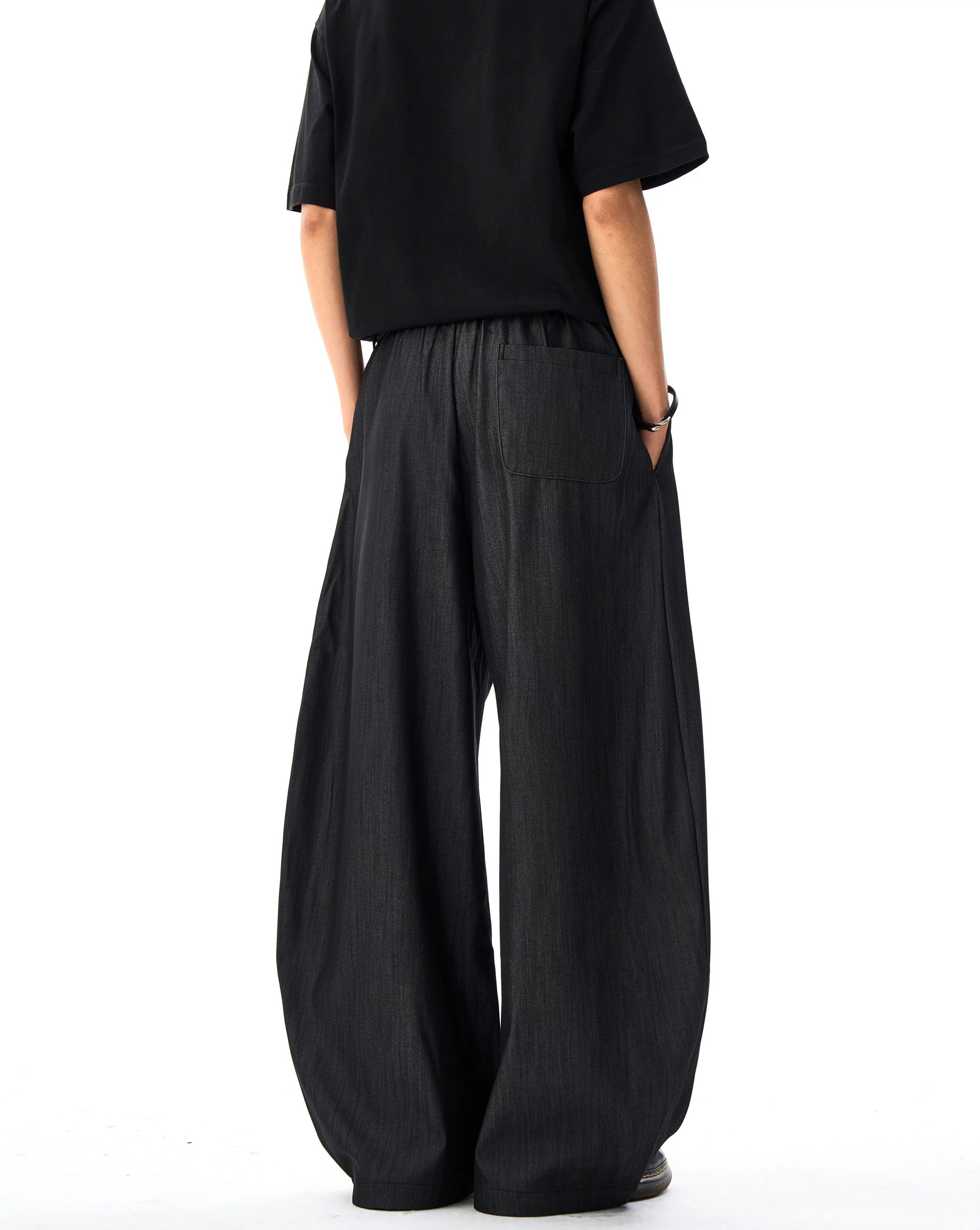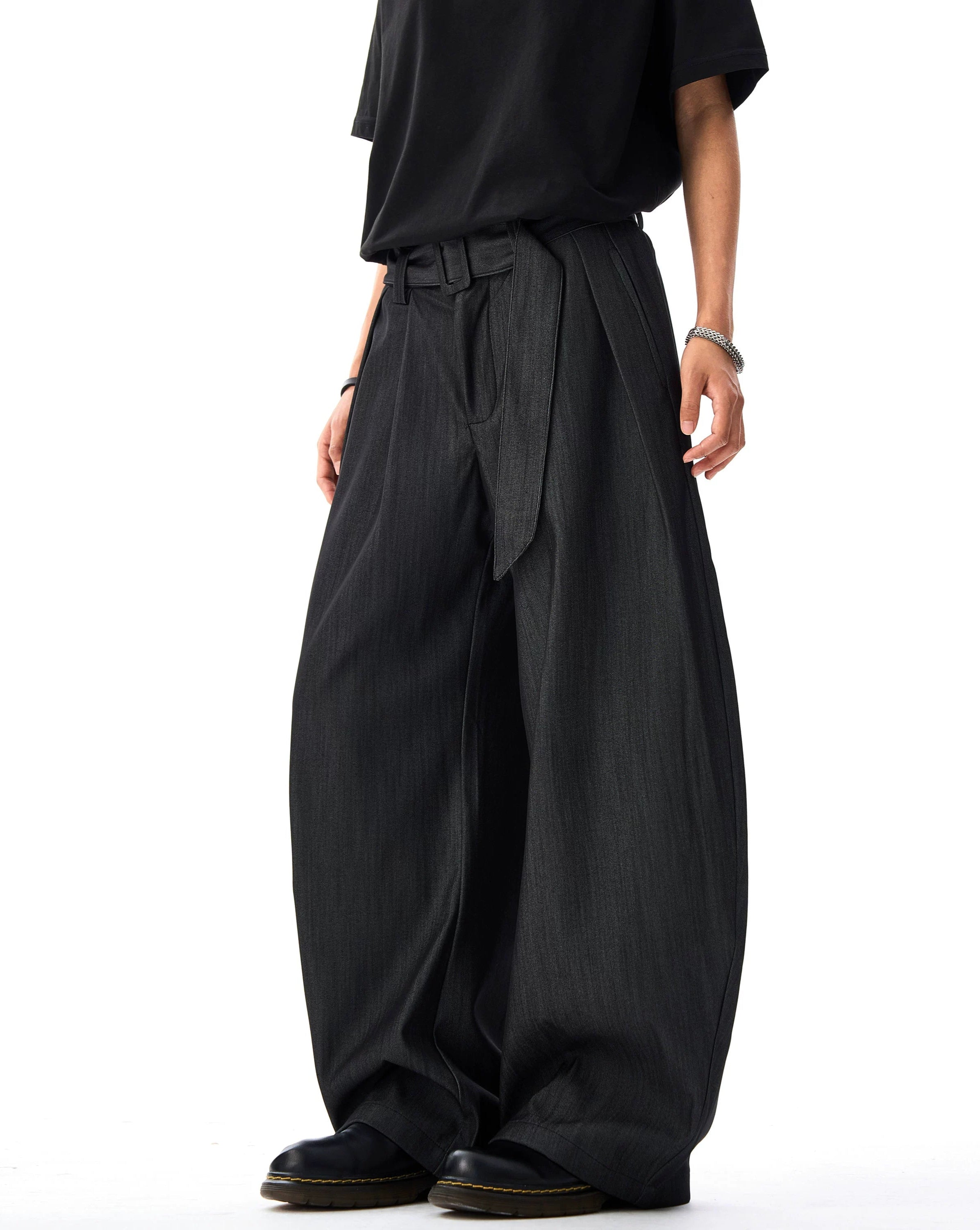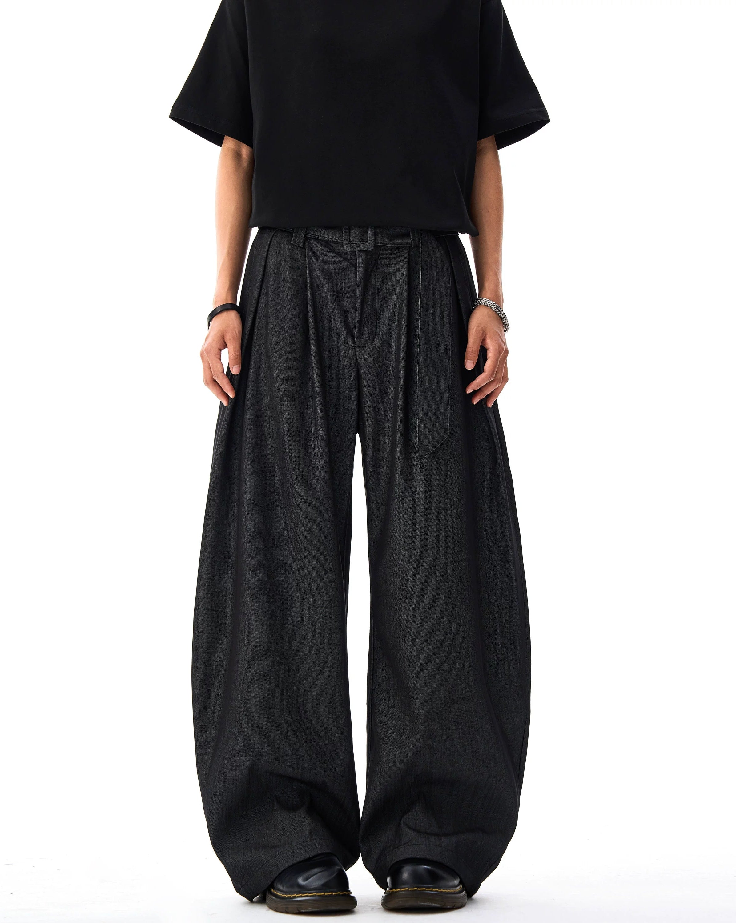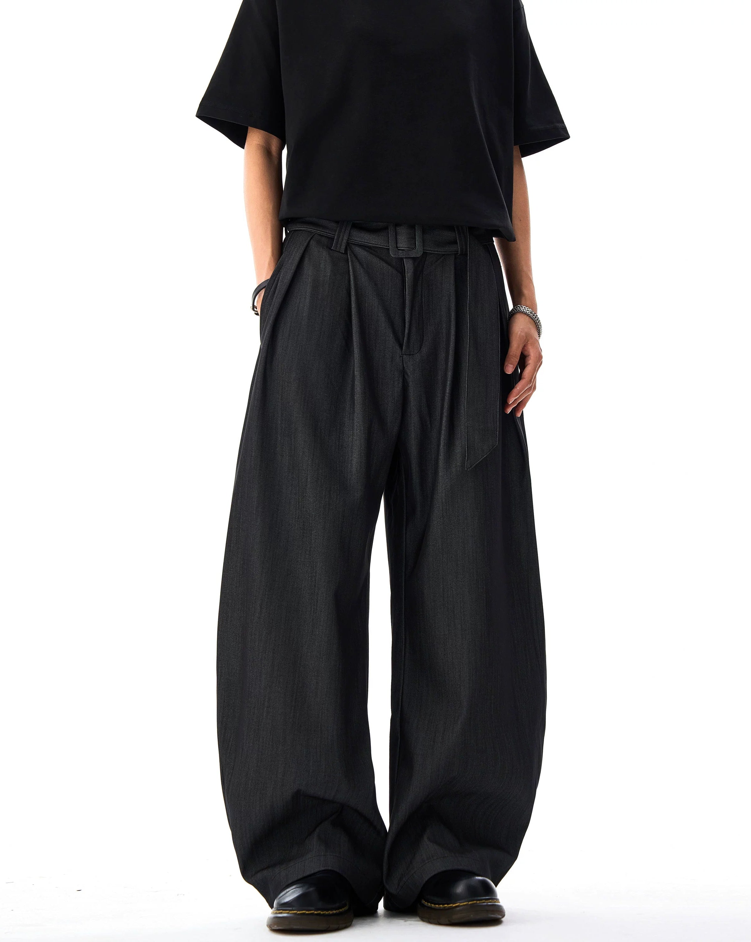 Designed for ease without losing edge, they bring together clean lines and understated texture for a polished yet effortless look. Crafted from a mid-weight blended fabric with a hint of stretch, these trousers feature pressed pleats and a built-in tonal belt that adds dimension without overcomplicating. The faint iridescence in the material catches just enough light, making them a versatile go-to for casual workdays, after-hours layering, or off-duty fits.