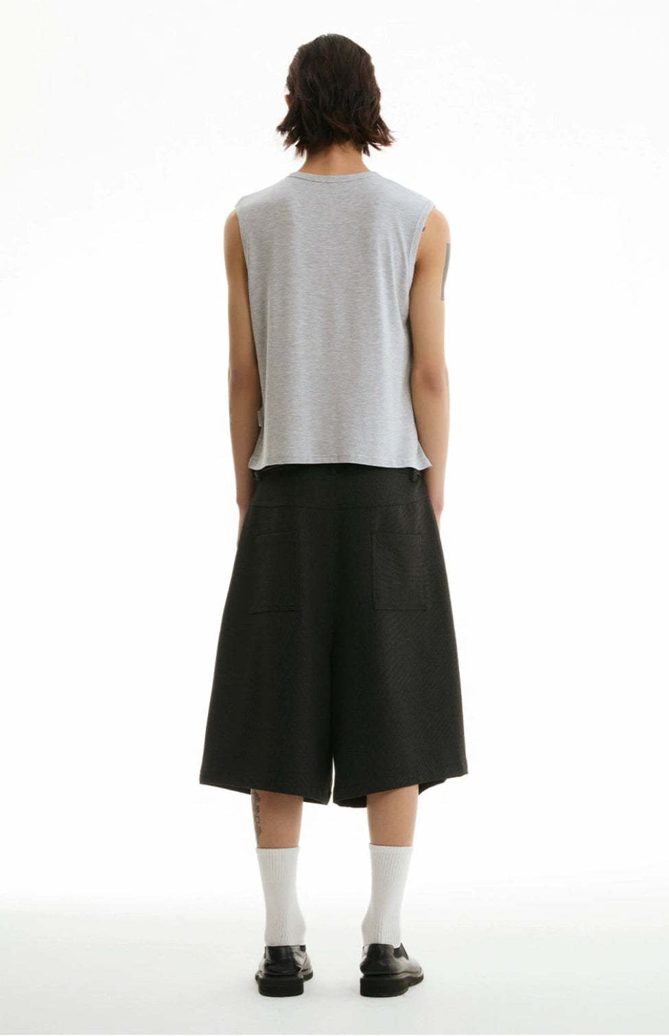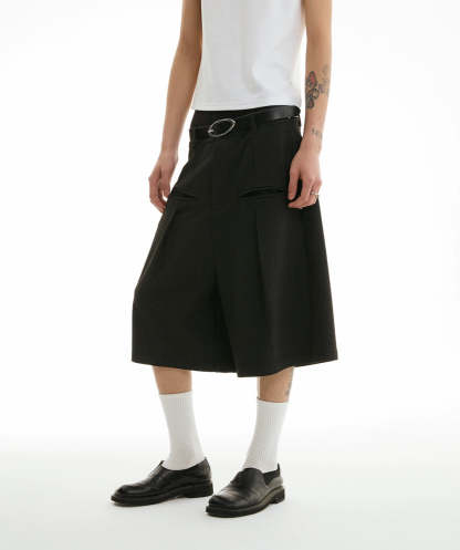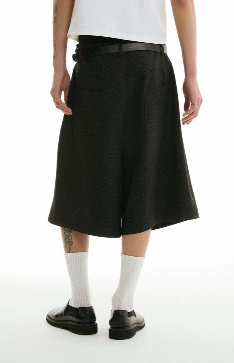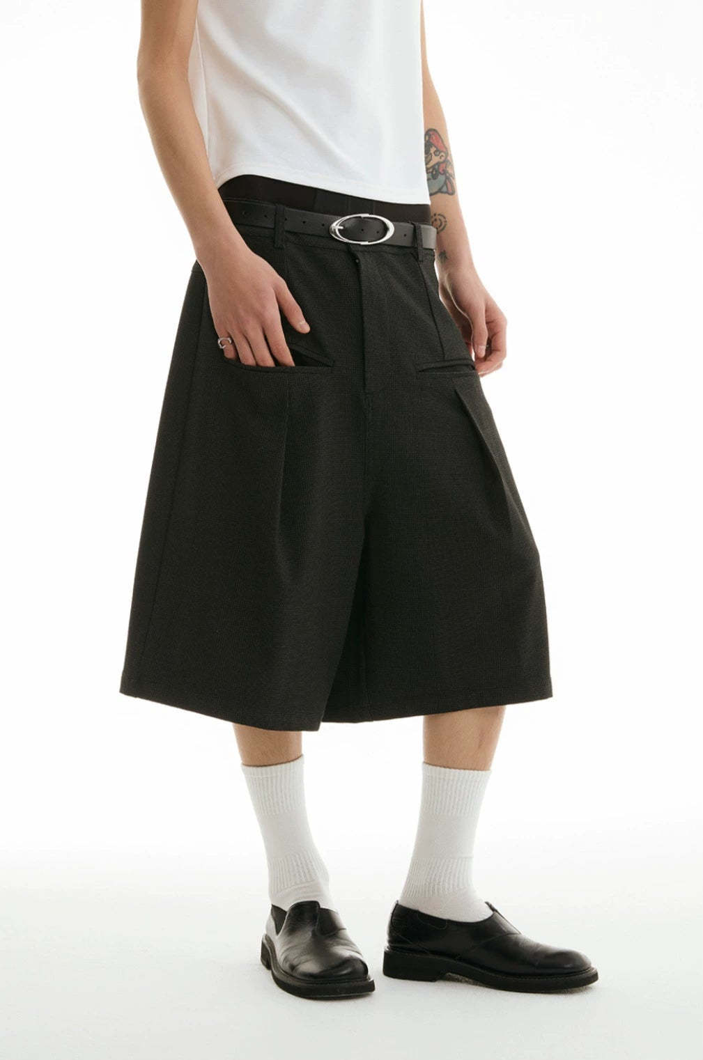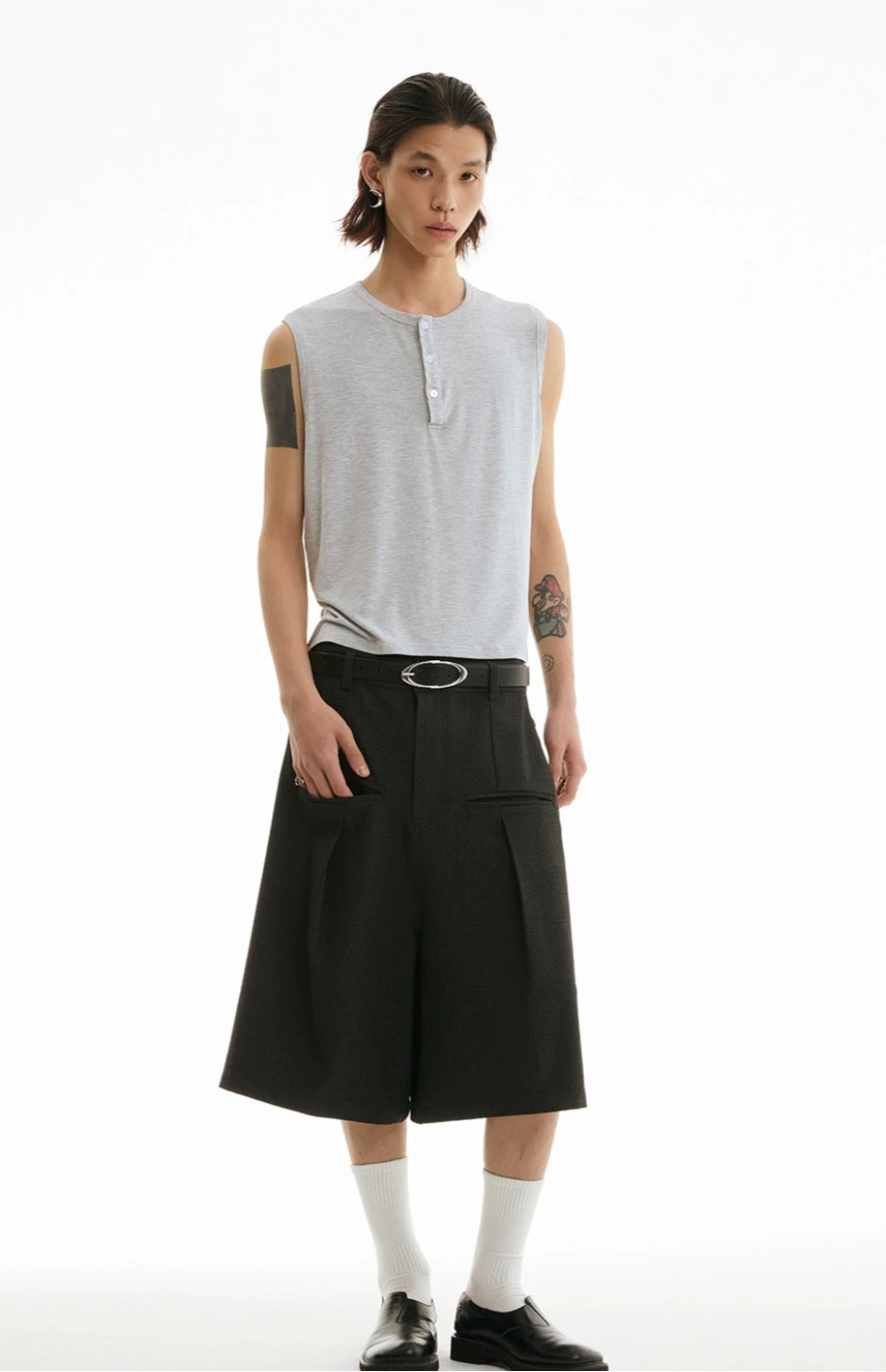 The wide-leg tailored Bermuda shorts with front pleats offer an easy balance between structured edge and laid-back comfort.