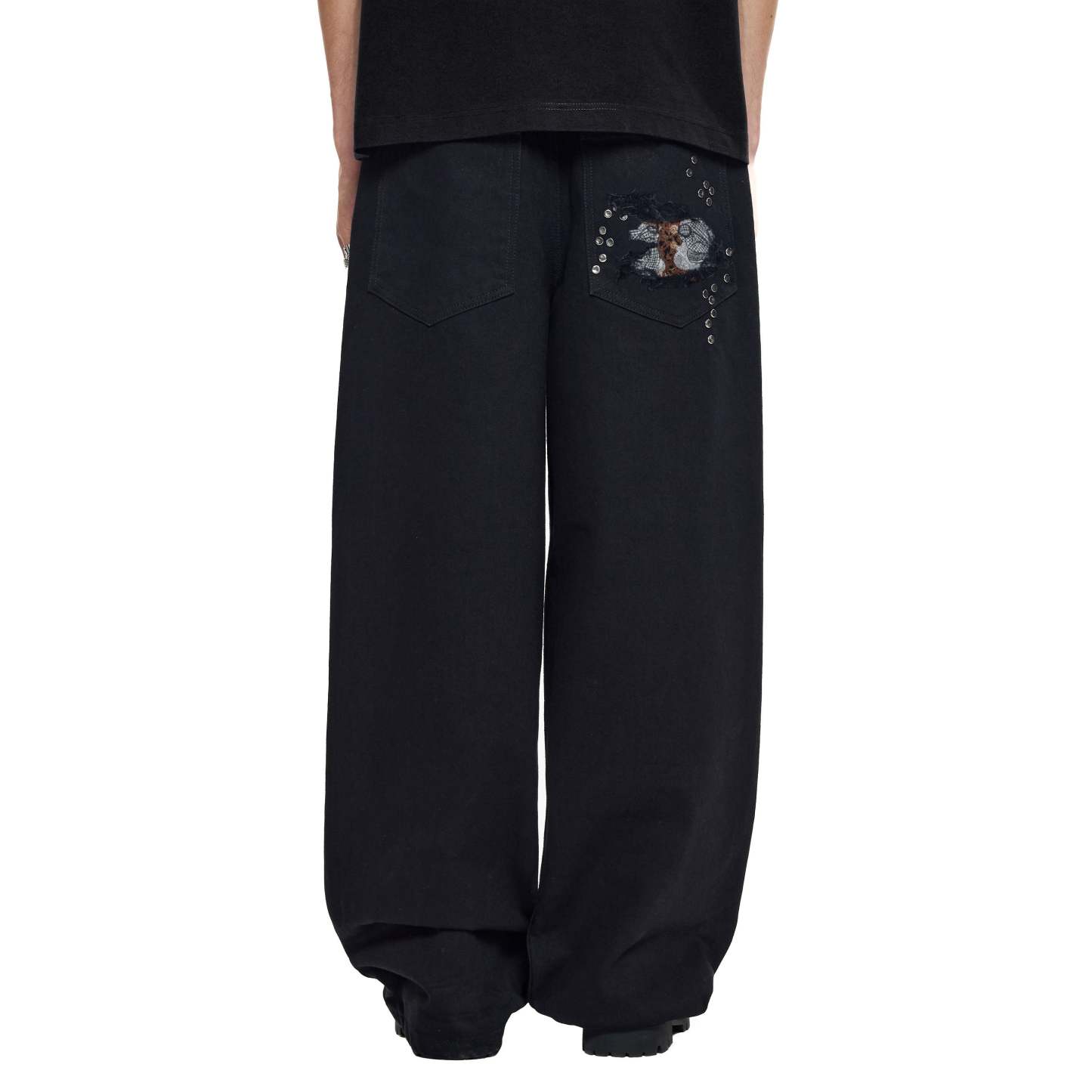14,5oz denim / 100% cotton / distressed and patched at knees and back pocket / embroidery on back pocket patch / button studs at knees and back pocket / debossed printed leather patch / custom button / wash inside out / fits true to size / all profits will be donated