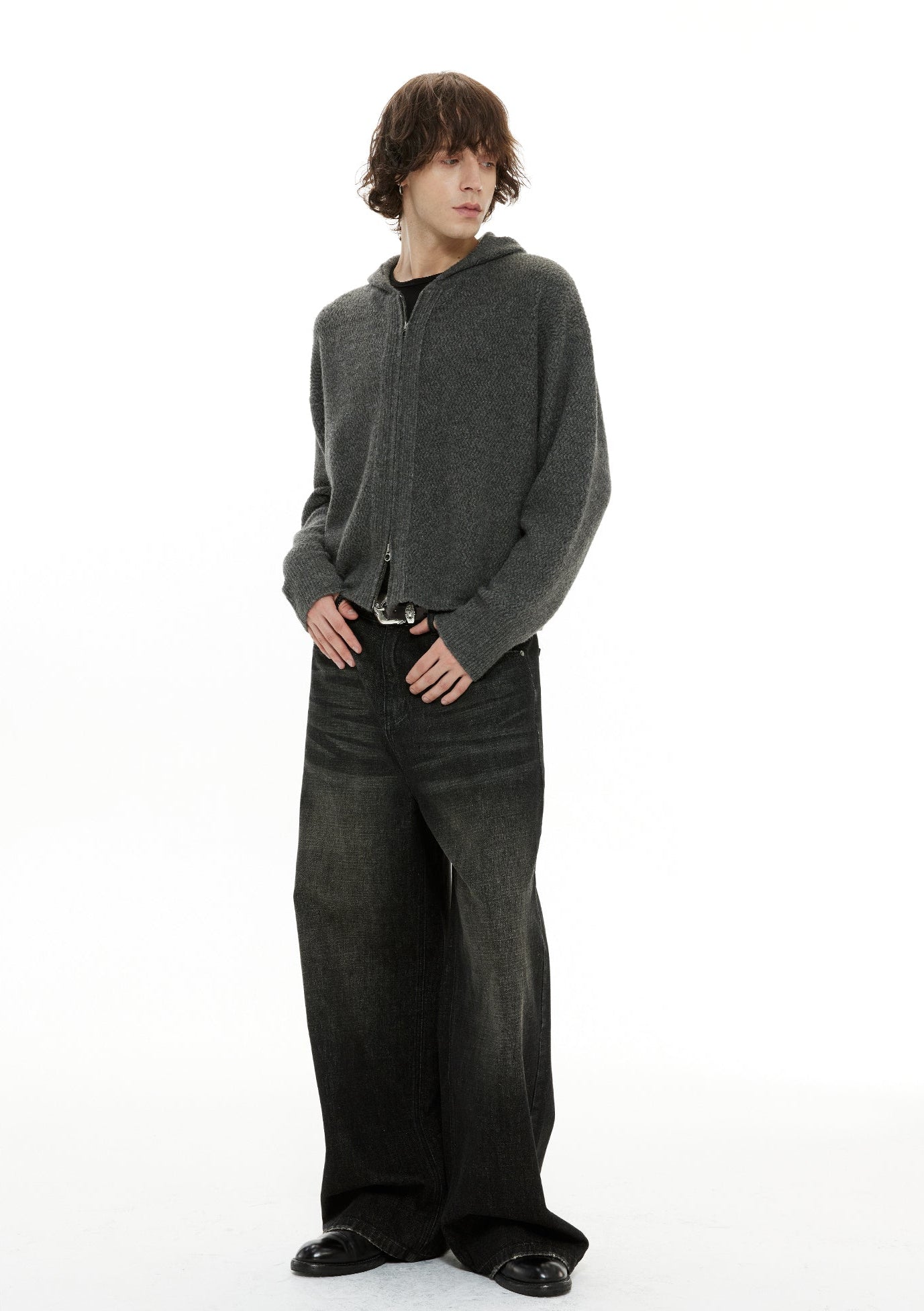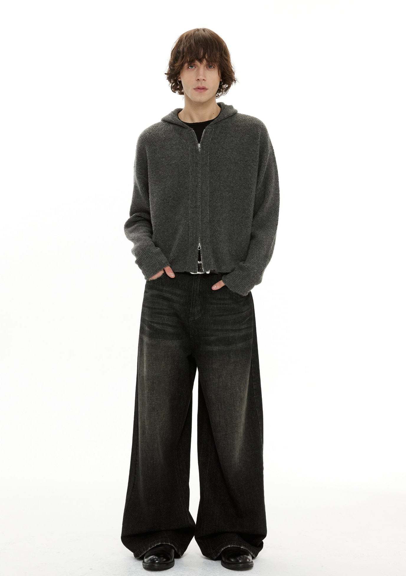 Constructed from a soft wool-camel blend with a subtle structured hand feel, the fabric balances warmth, comfort, and edge. The relaxed silhouette is elevated with deliberate details like the full-length double zip and minimalist hoodie design, all in a deep, muted gray that fits any mood.