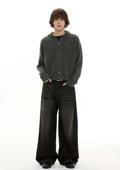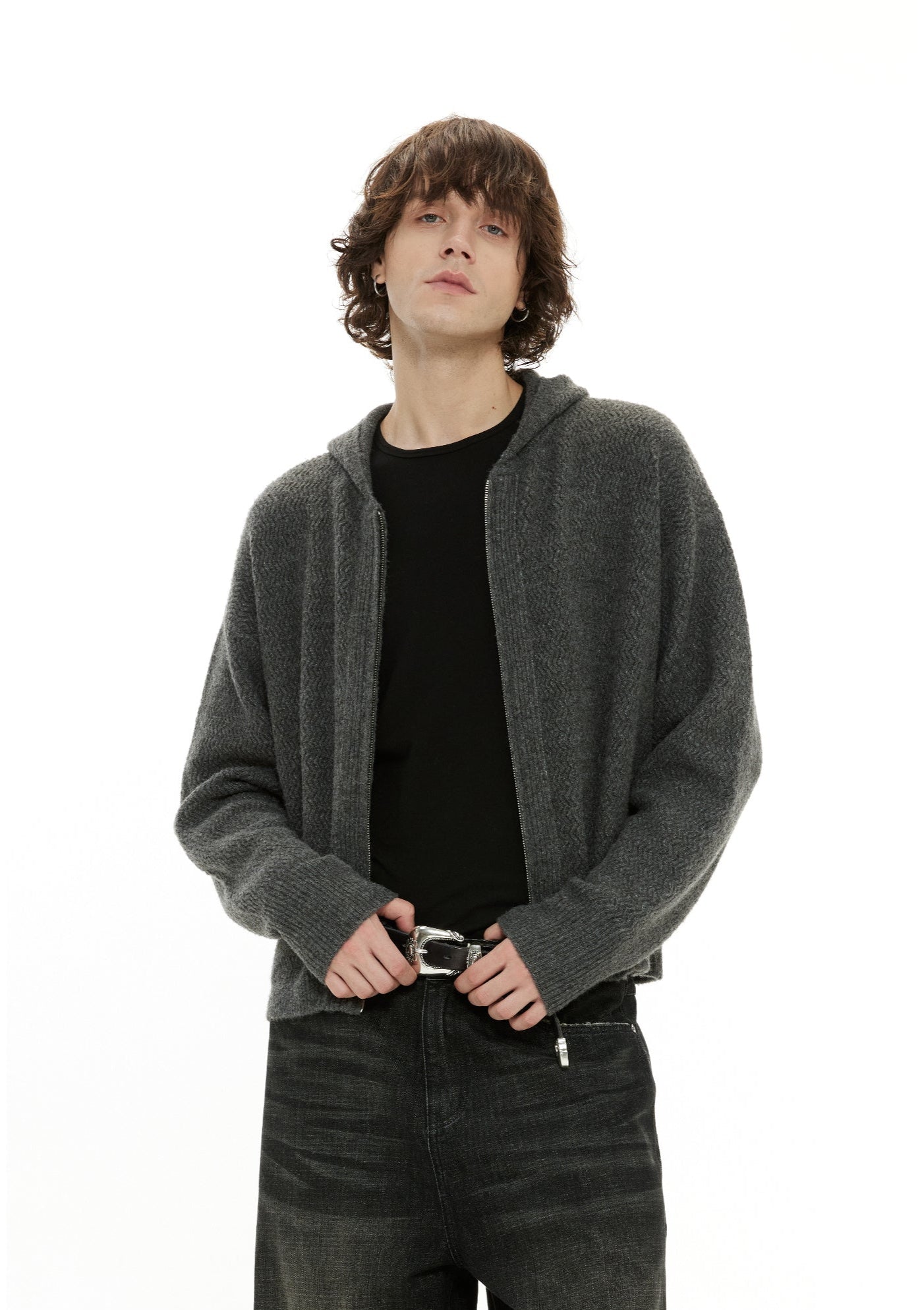 This knit hoodie jacket stands out with a textured zigzag pattern and a two-way zip closure that adds depth and ease to everyday wear.